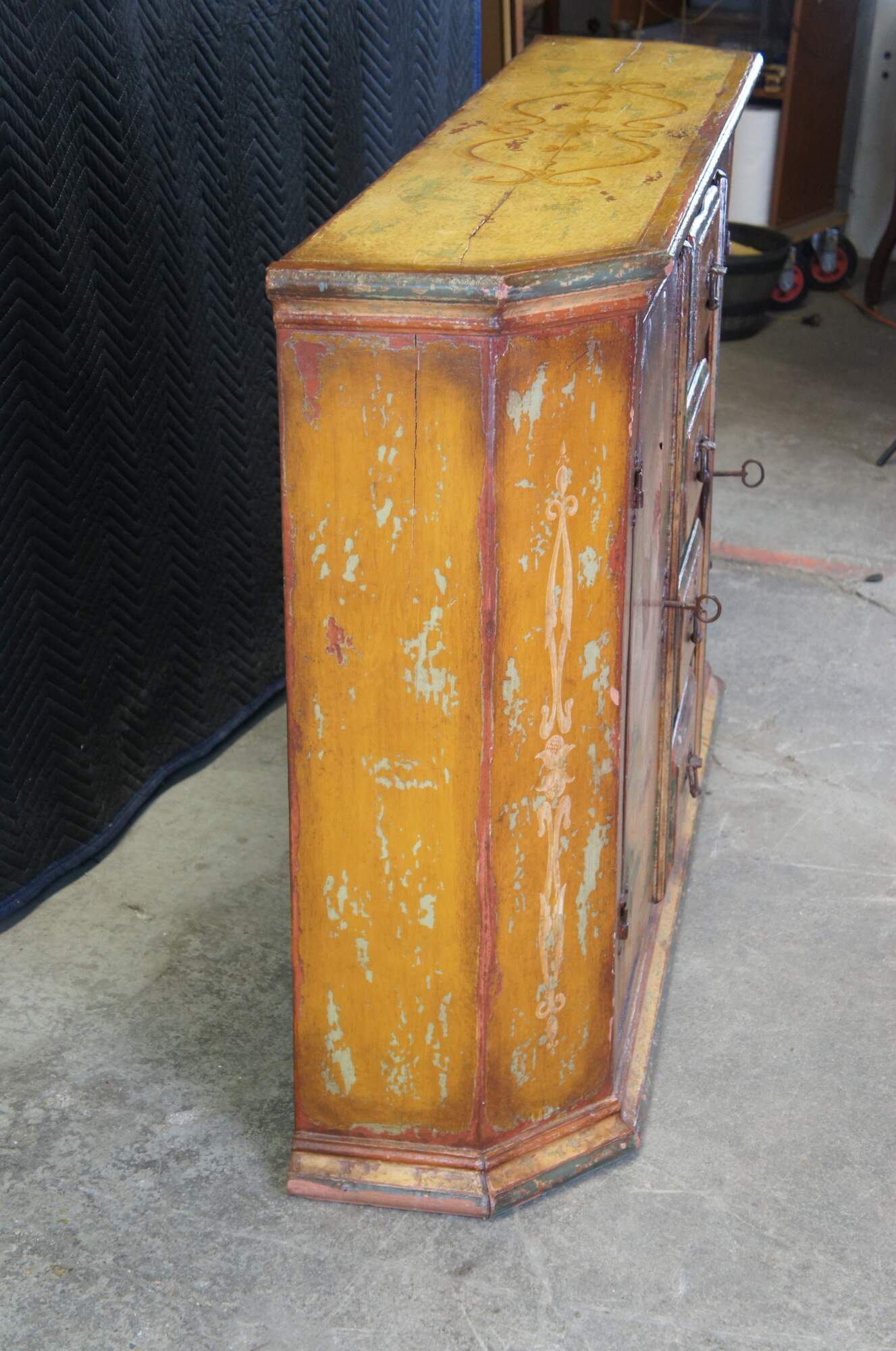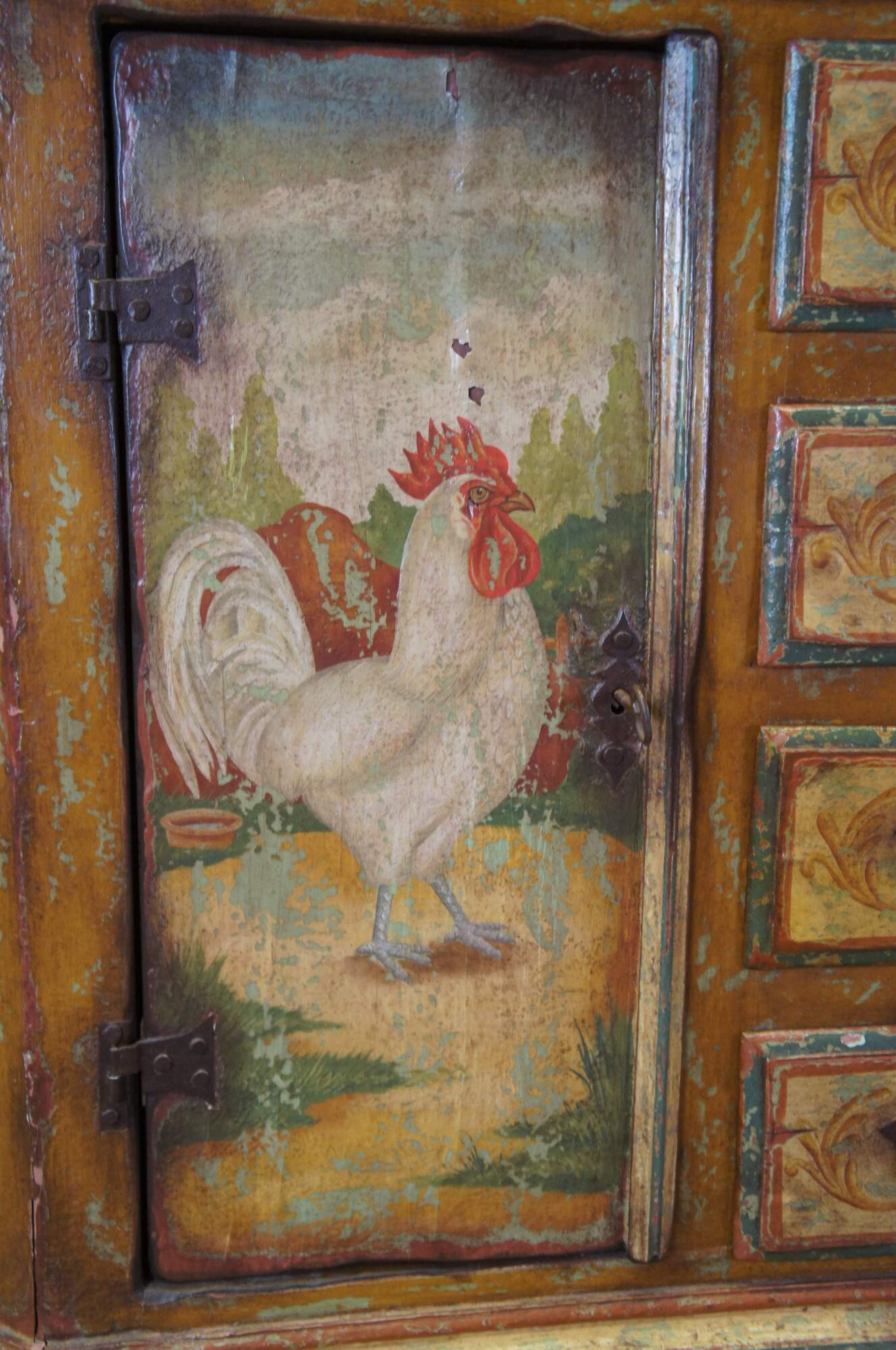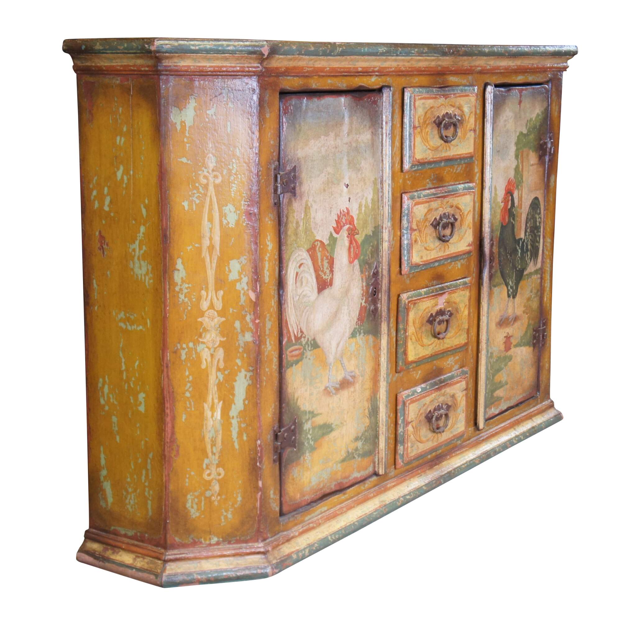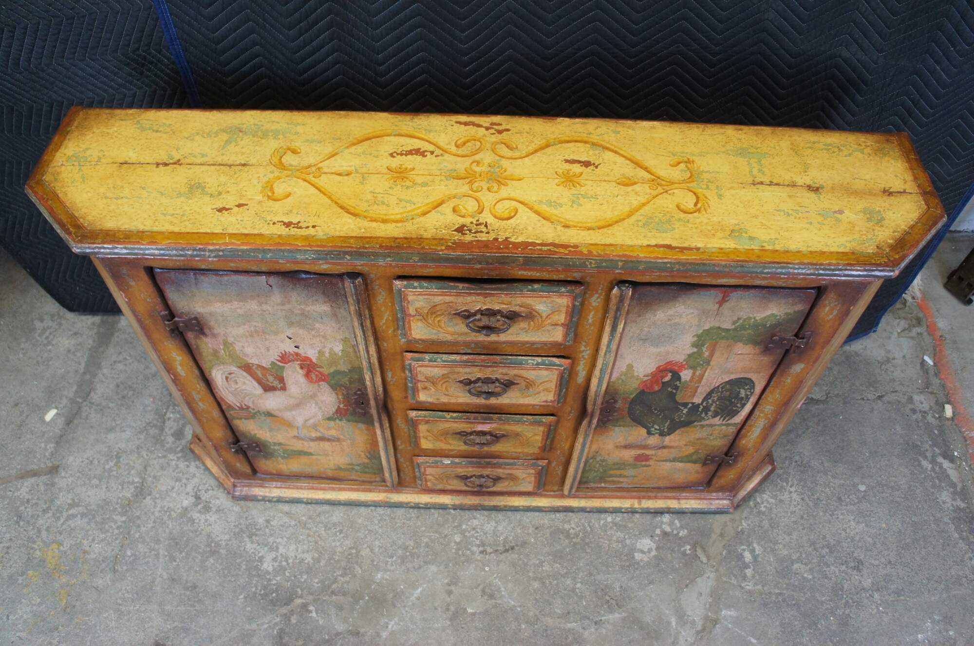 A stylish modern Tuscan farmhouse credenza, circa last quarter 20th century. Inspired by Old World French Country styling. The slender case is made from heavy hardwood featuring 4 central drawers flanked by outer cabinets. Outer doors open to a single shelf with scalloped front apron. Finish is a polychrome, hand painted with colorful motifs and farmhouse scenes with facing roosters Great for use as a credenza, console or sideboard. Includes ornate skeleton keys for each door. Naturally distressed giving the appearance of an antique.