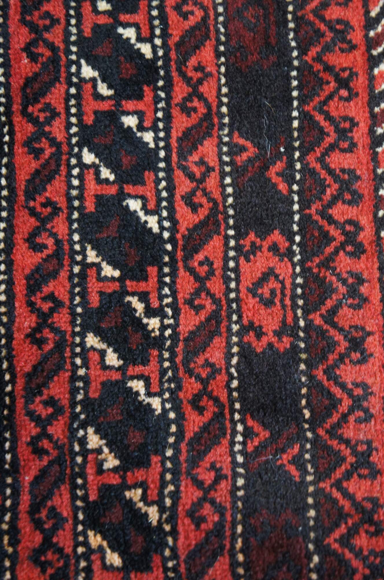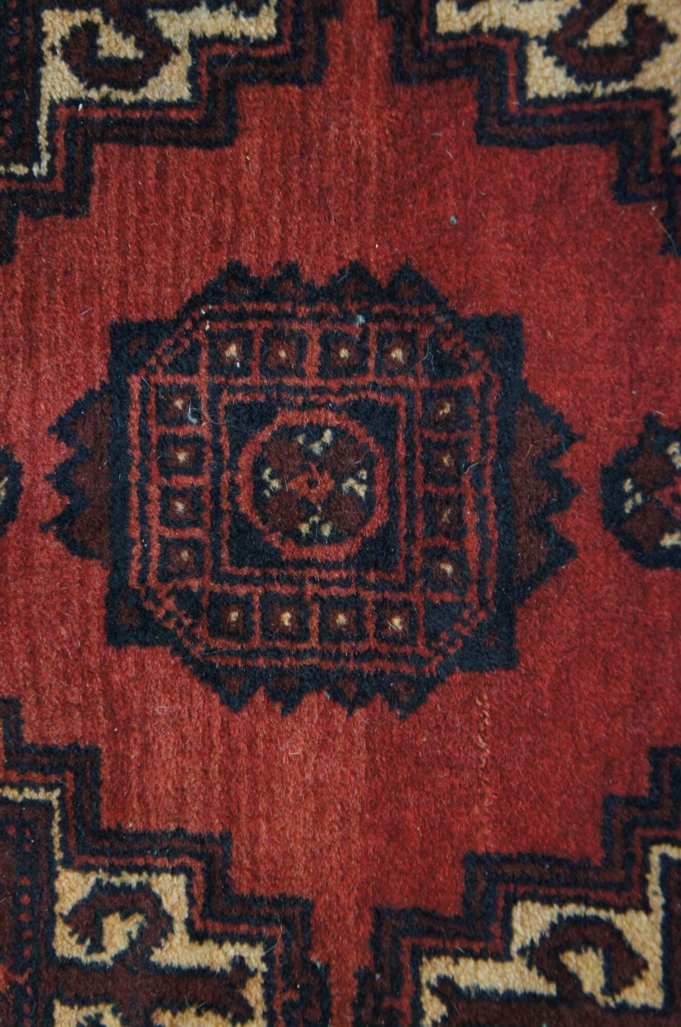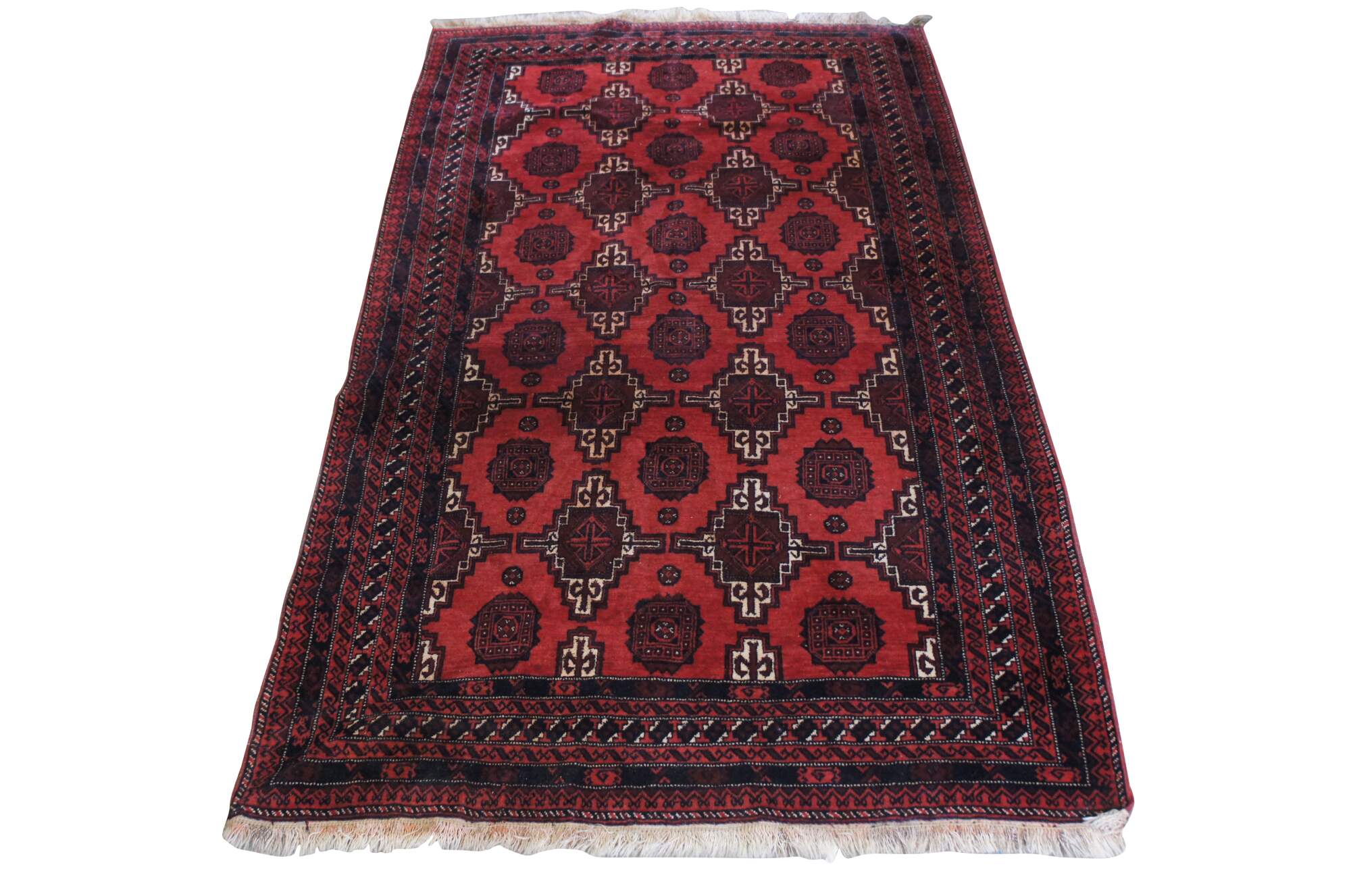 A beautiful hand knotted wool geometric area rug. Features reds and beige