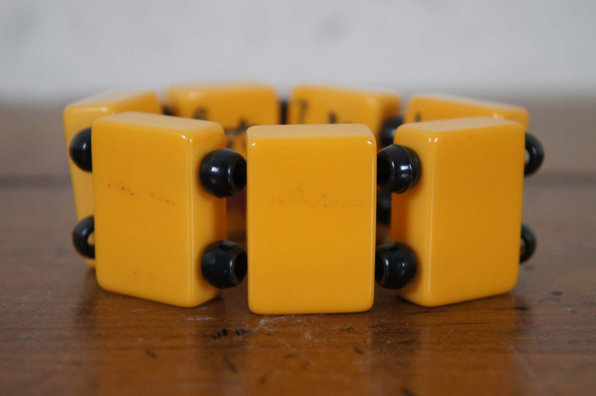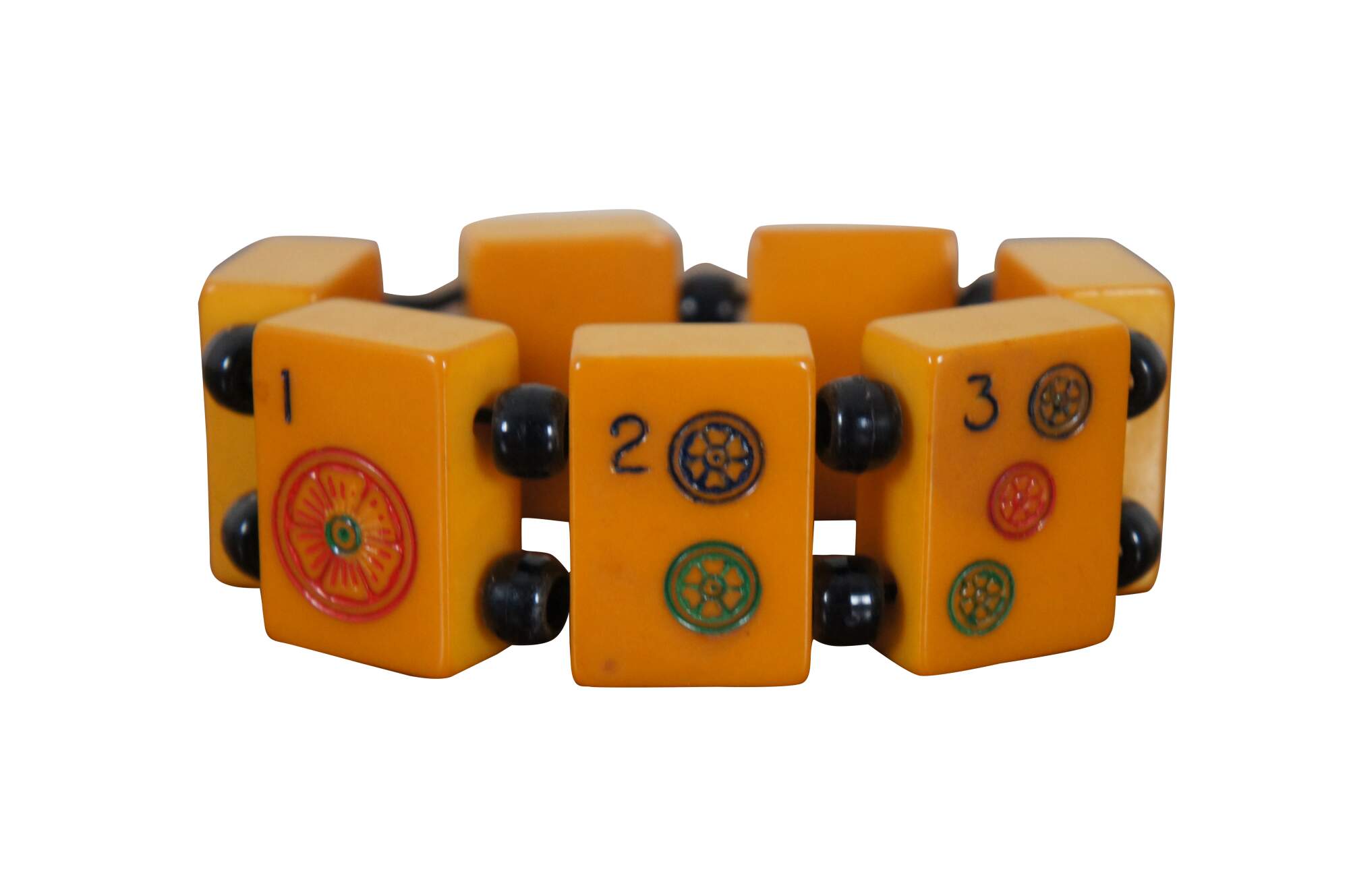 Pair of early to mid 20th century butterscotch Bakelite stretch bracelets featuring seven carved and painted mah jong tiles divided by black pony beads. Slightly different shades. The lighter one features Chinese characters and Arabic numerals. The darker one features flower shaped pips and Arabic numerals. Swab tested.