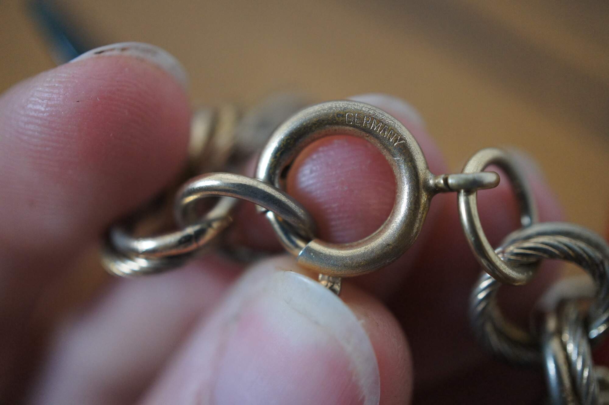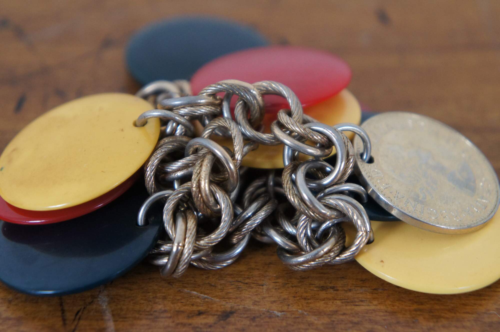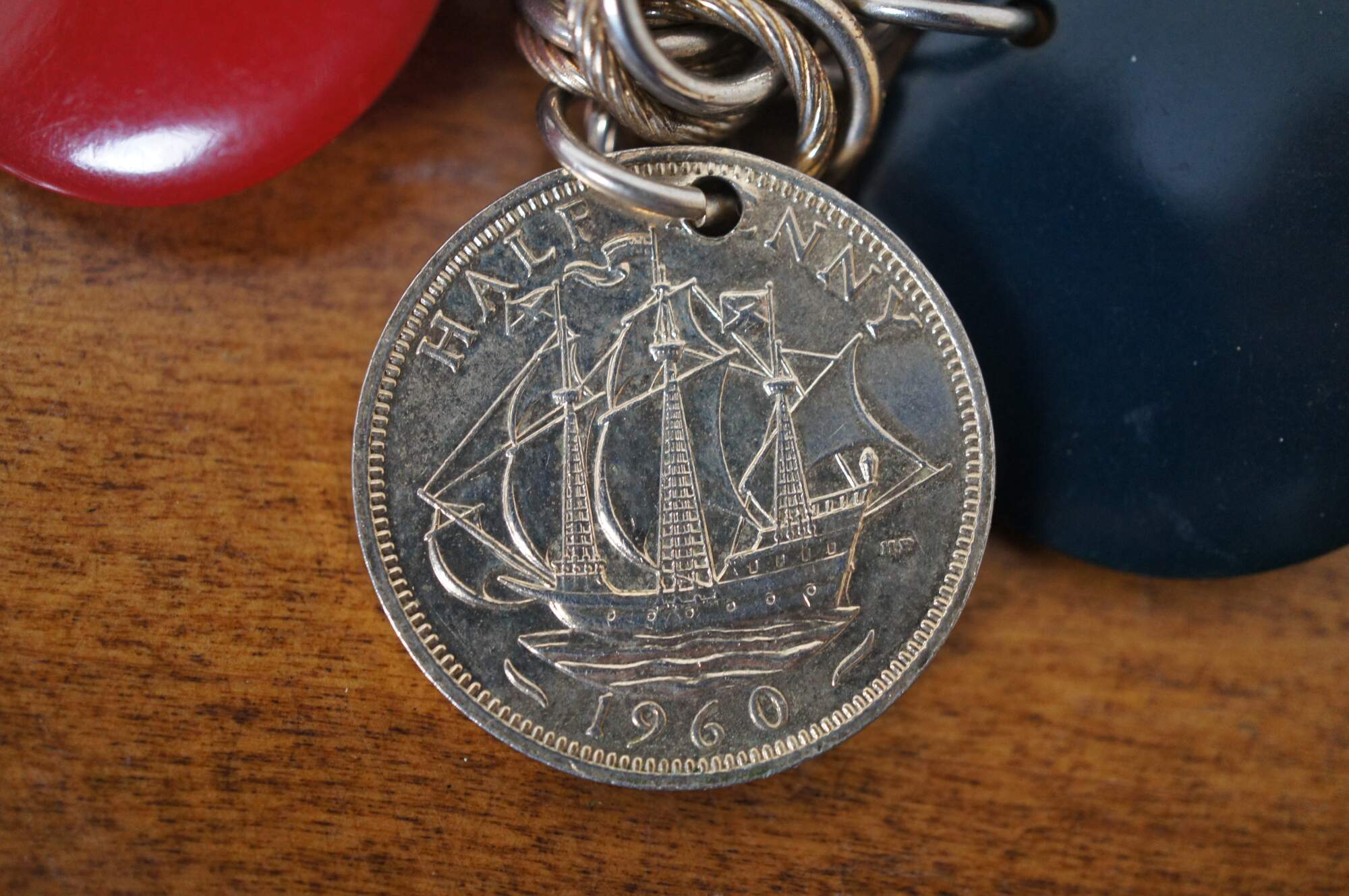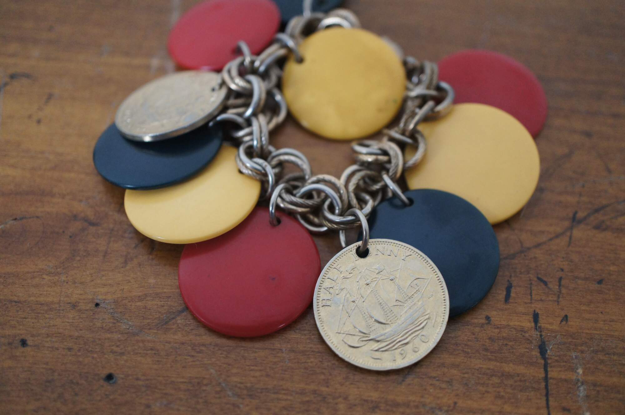 Mid 20th century bracelet featuring round /disc shaped Bakelite charms in red, yellow and navy blue, and two 1960 British half penny coins featuring Queen Elizabeth II, on a double layered curb chain with rope twist texture and spring ring clasp. Clasp marked Germany. Swab tested.