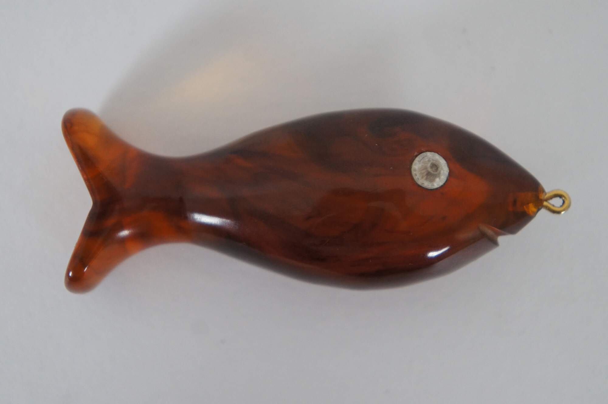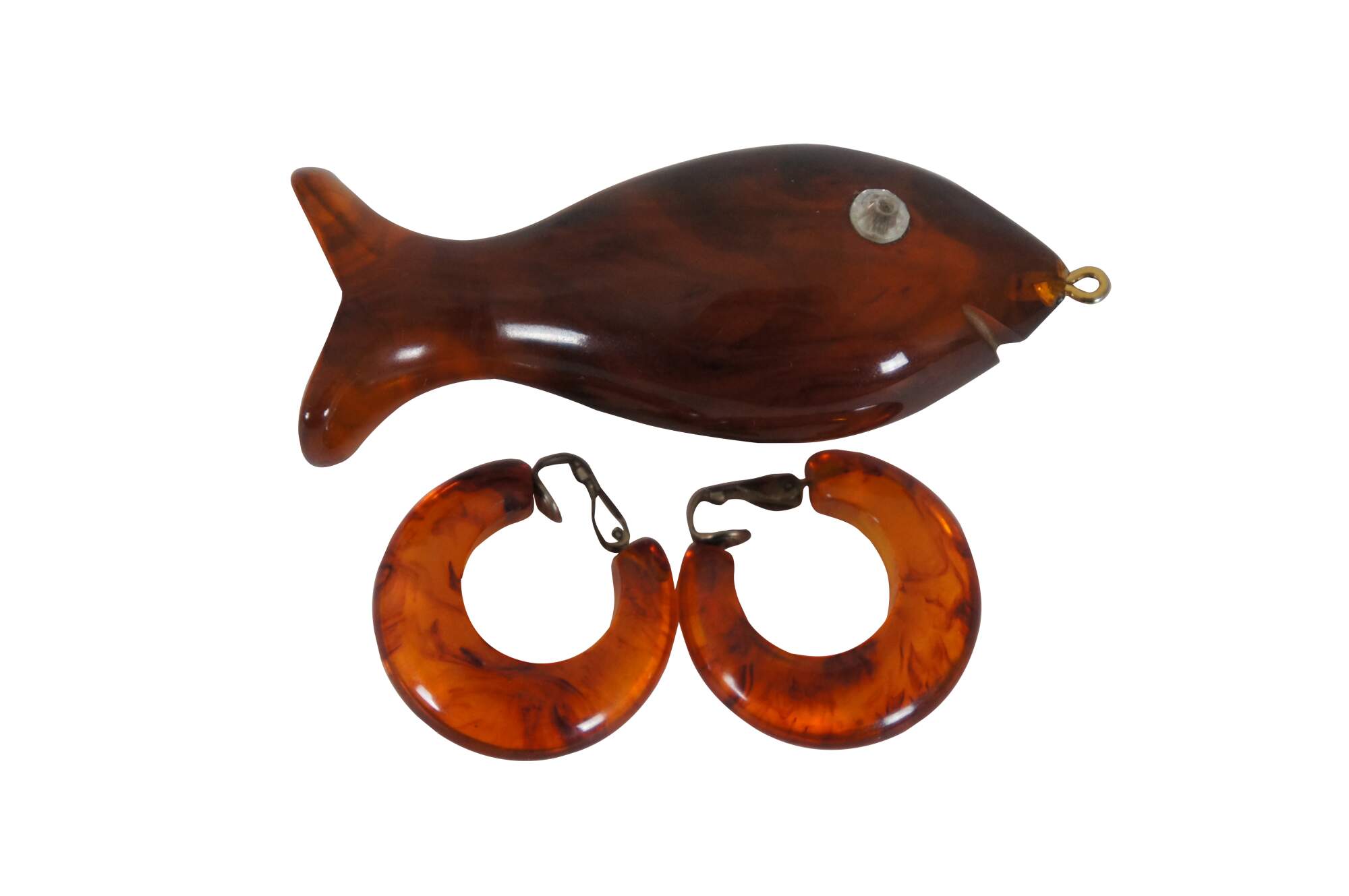 Four piece set of mid 20th century marbled root beer / translucent amber Bakelite jewelry including a pair of clip on hoop earrings, bangle bracelet with silver tone studs, and a large, heavy fish shaped pendant with white rhinestone eye (no chain). Swab tested by previous owner.