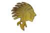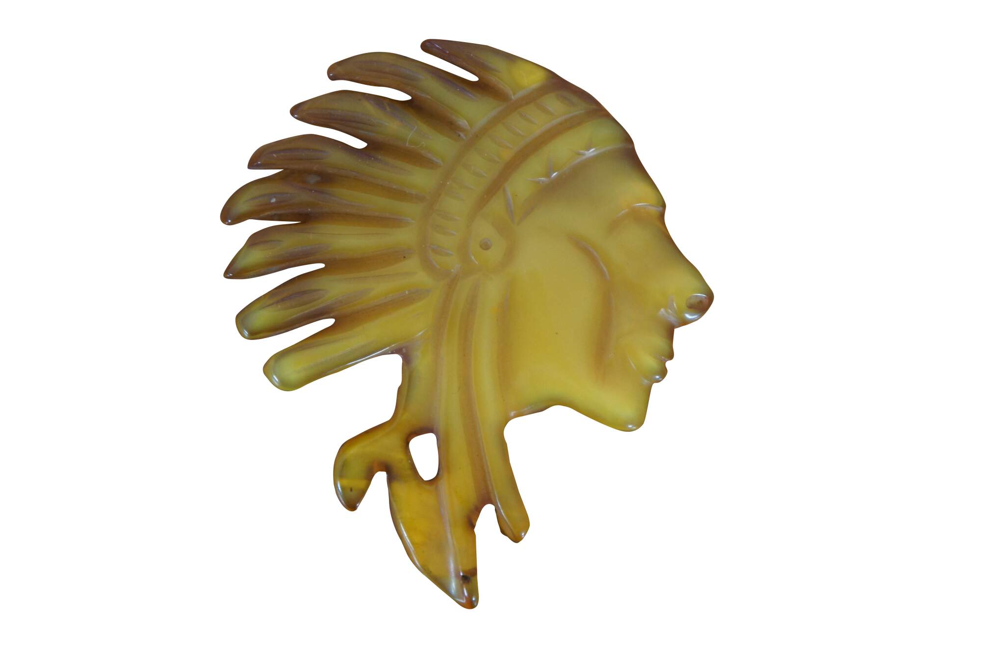 Early to mid 20th century translucent yellow, egg yolk Bakelite pin / brooch carved in the shape of a Native American / “Indian Chief” wearing a feathered headdress. Straight pin back. Swab tested.