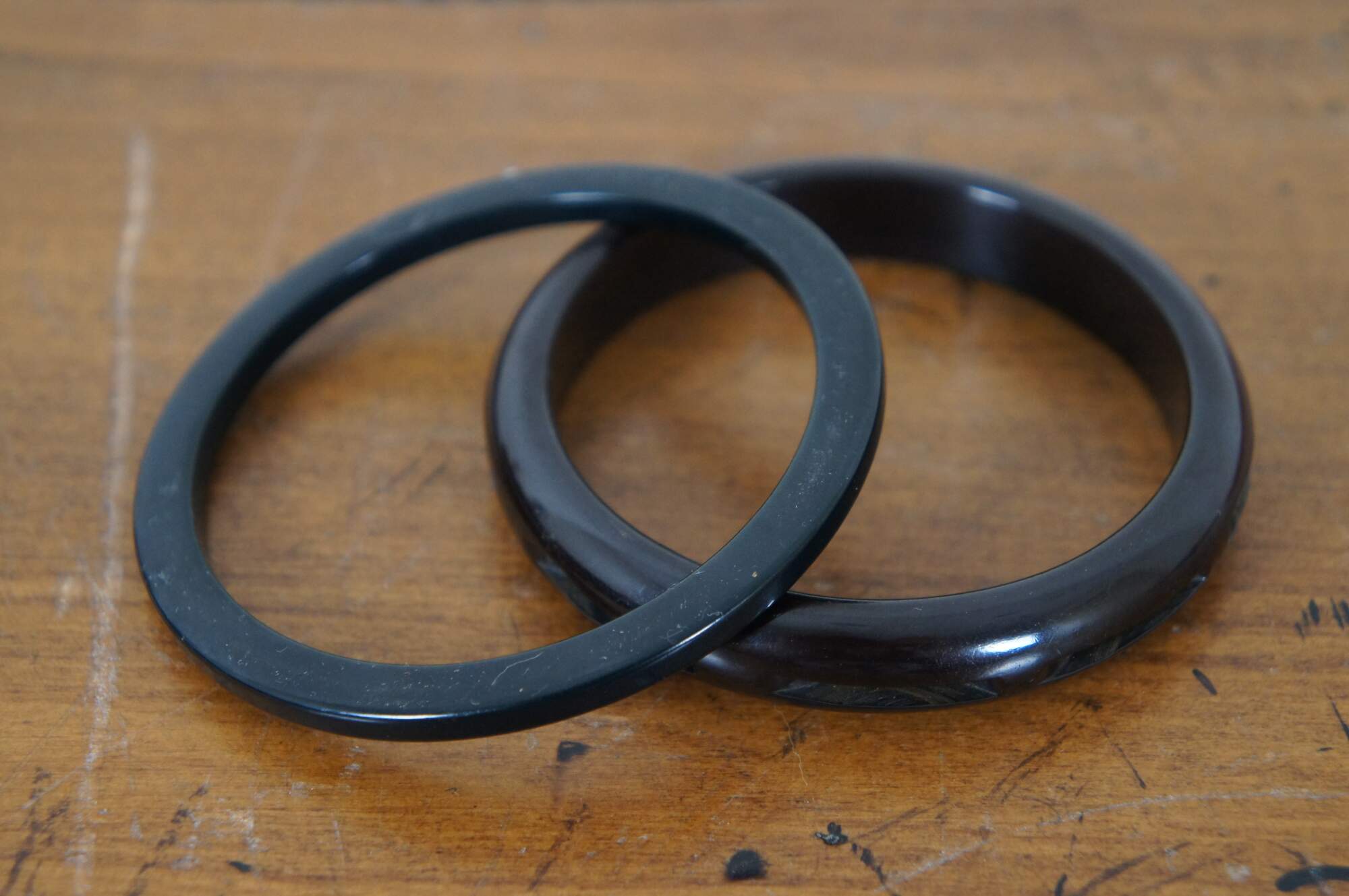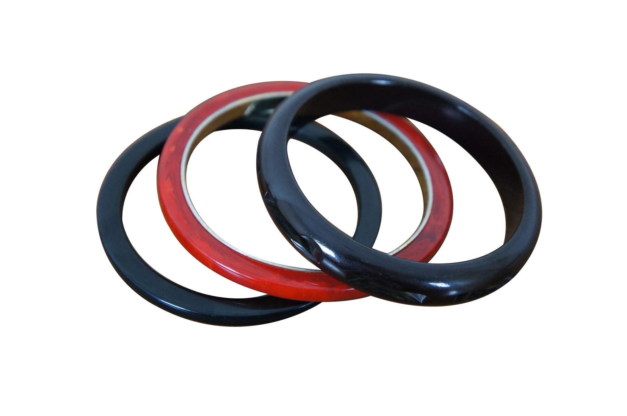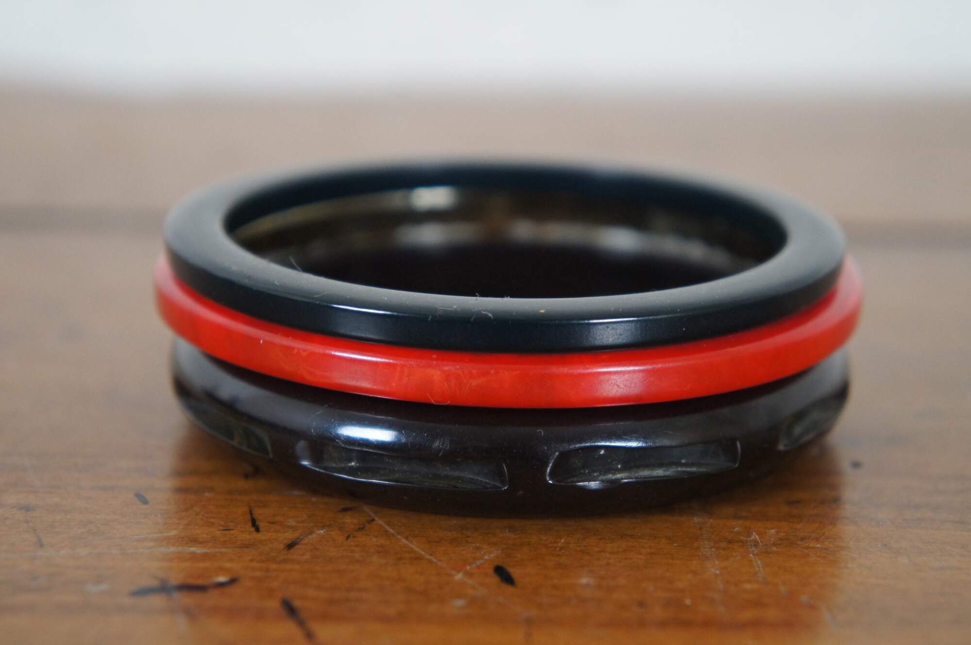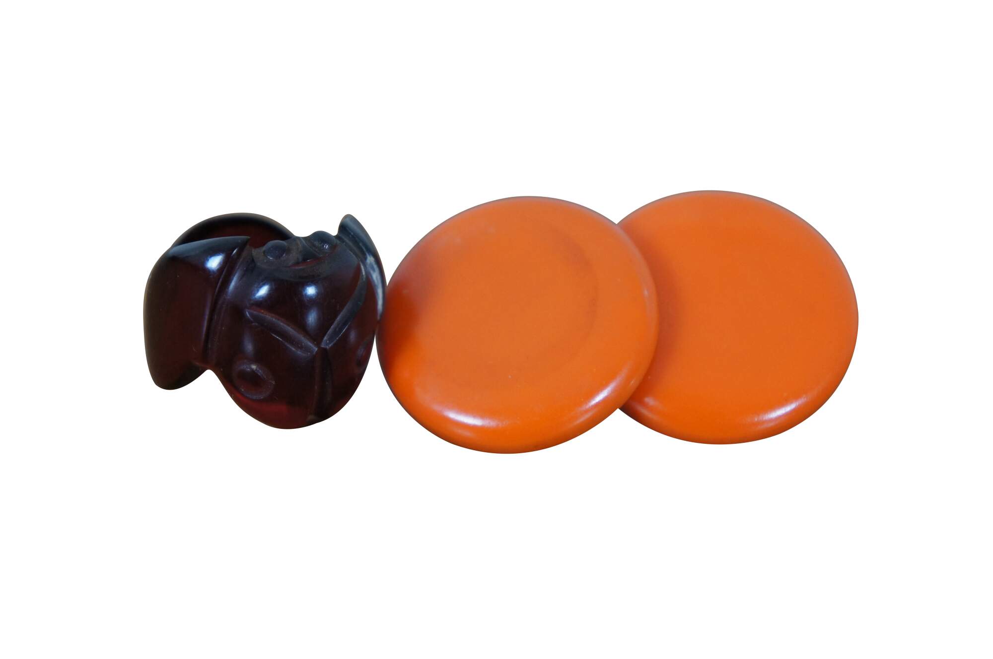 Lot of 6 assorted early to mid 20th century Bakelite jewelry items including a pair of round orange disc shaped clip on earrings, a deep translucent red carved ring in the shape of a ladybug, two black bangle bracelets (one with simple carved accents), and one mottled red bangle bracelet with silver tone lining. Swab tested.