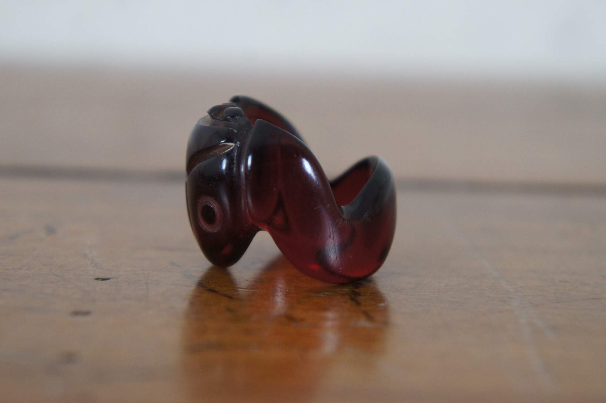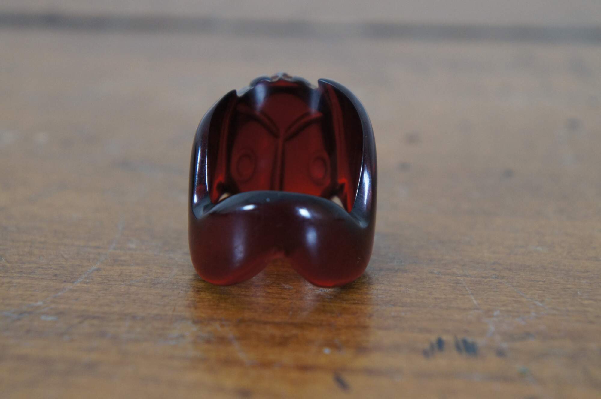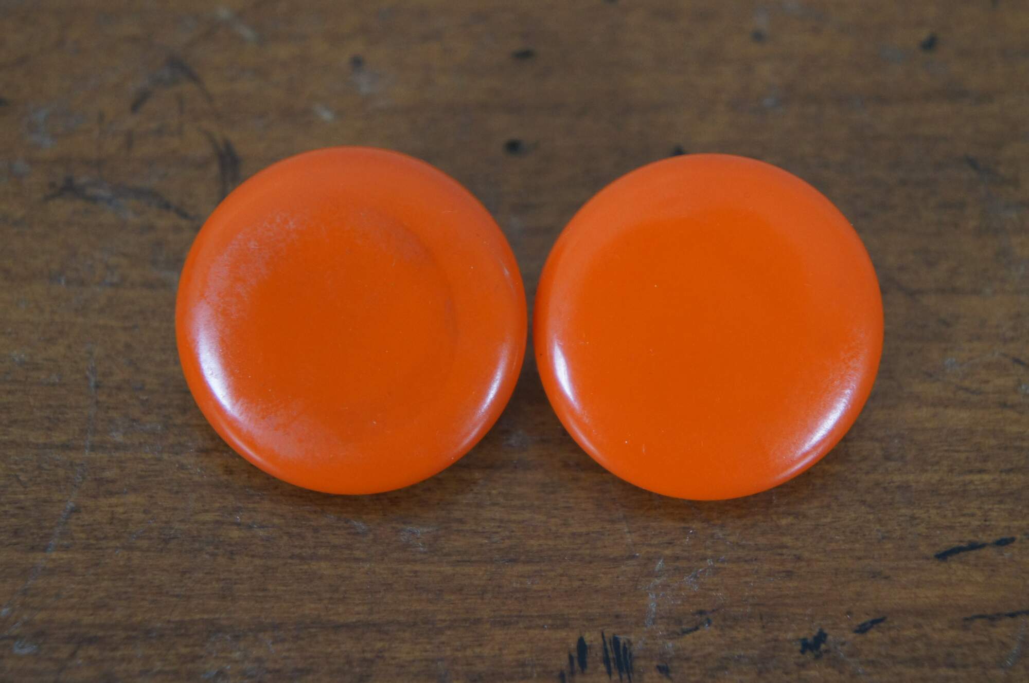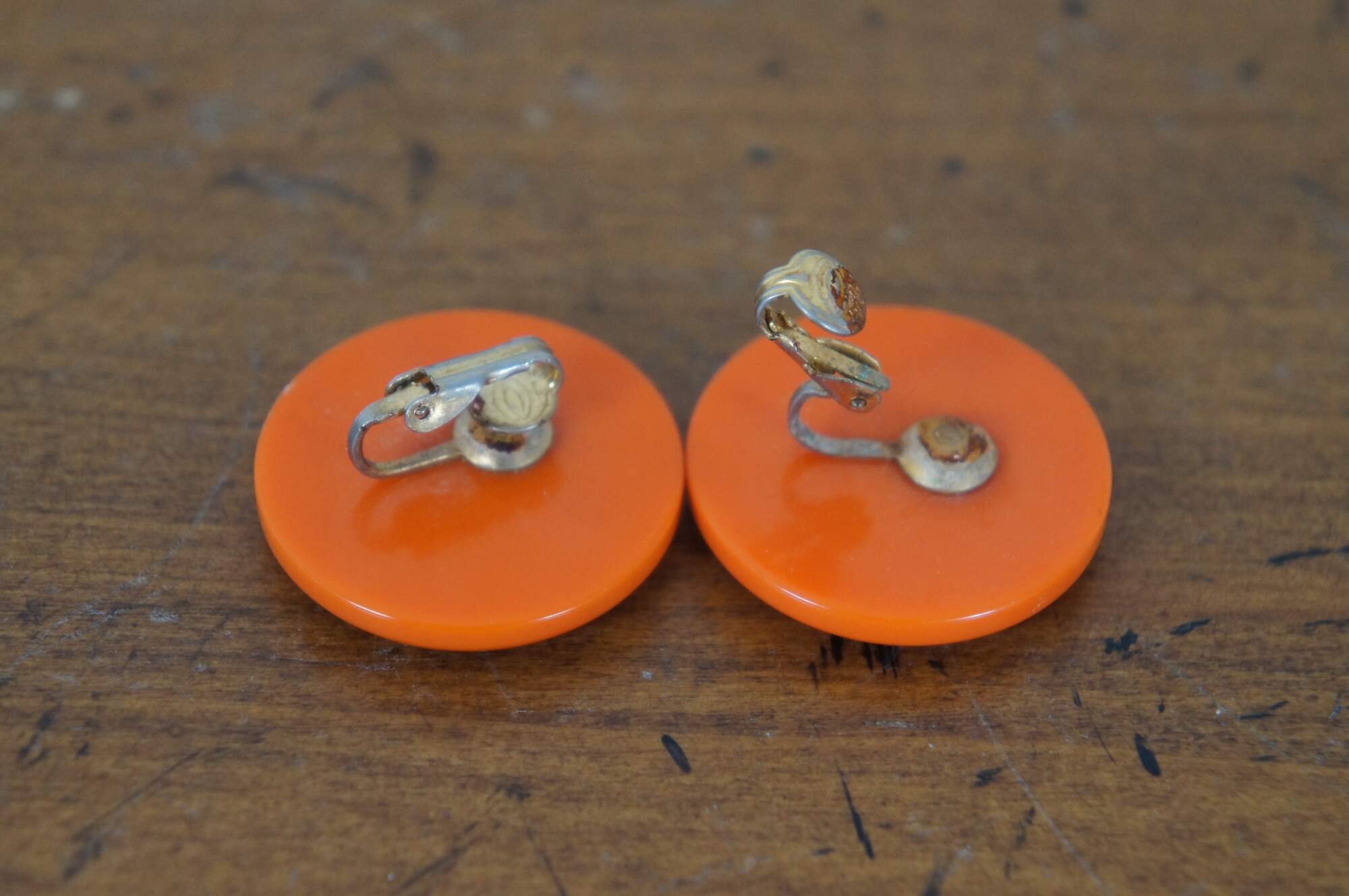 Lot of 6 assorted early to mid 20th century Bakelite jewelry items including a pair of round orange disc shaped clip on earrings, a deep translucent red carved ring in the shape of a ladybug, two black bangle bracelets (one with simple carved accents), and one mottled red bangle bracelet with silver tone lining. Swab tested.
