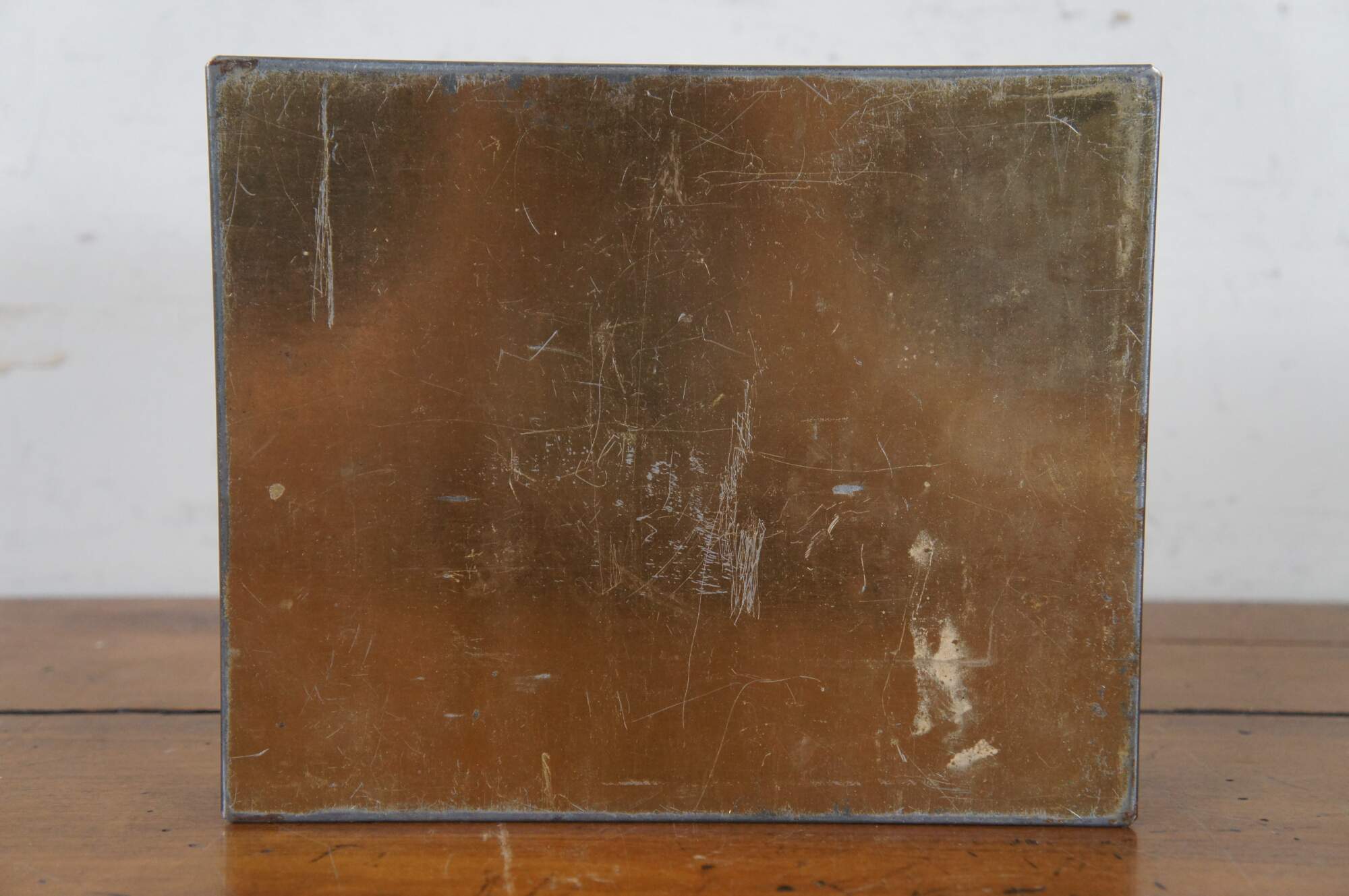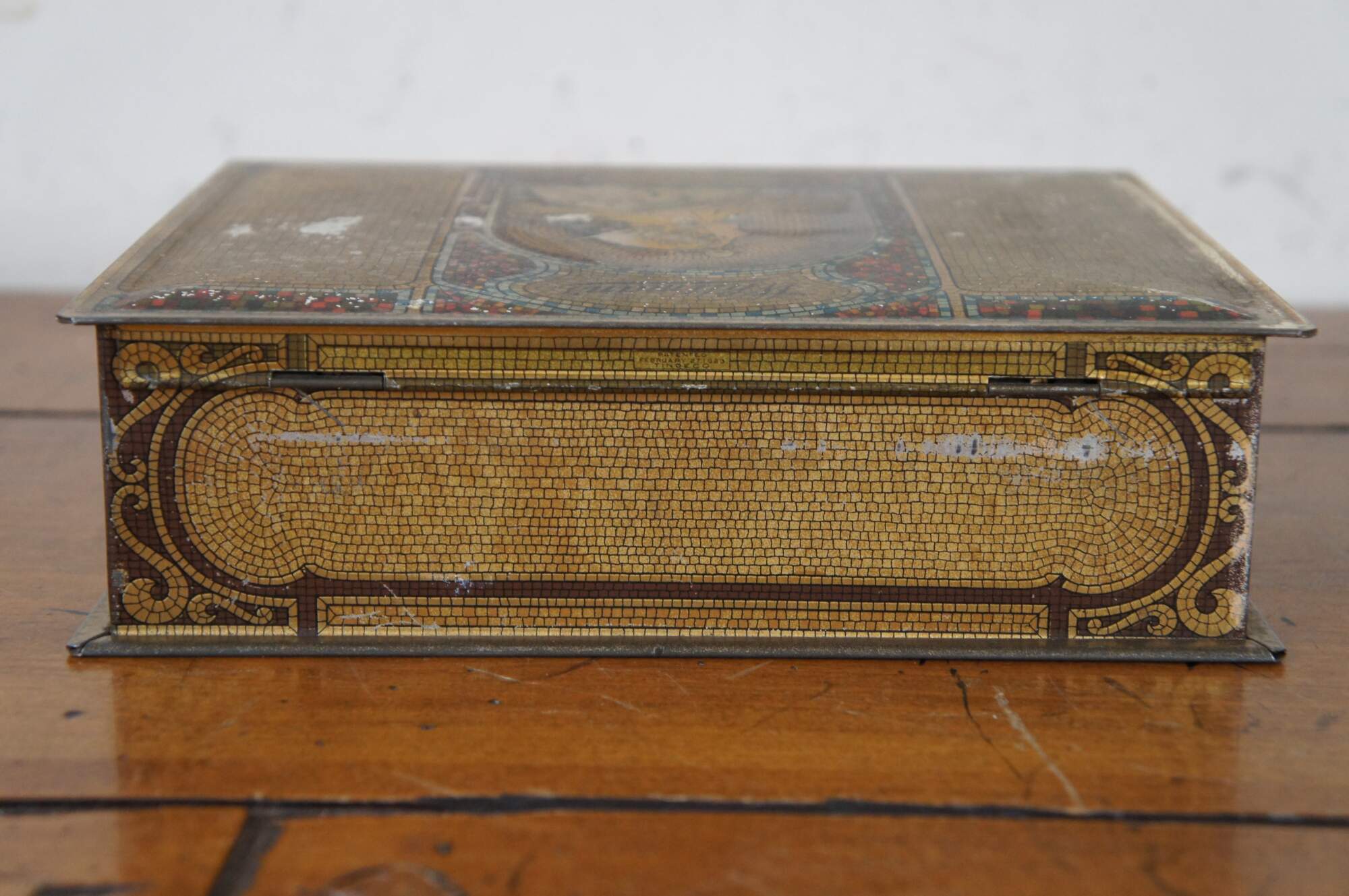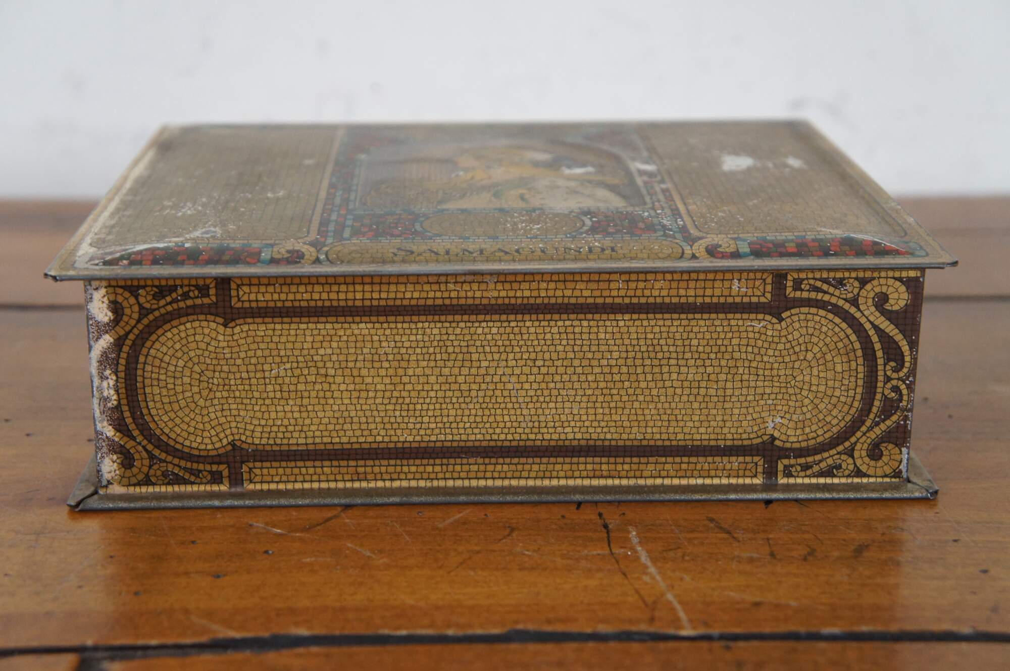 1920’s Whitman’s Salmagundi 2 lb candy / chocolate advertising tin featuring a litho printed gilded mosaic design and art nouveau portrait of a blonde woman by Alphonse Mucha. Copyright S.F.W. & S. Inc.