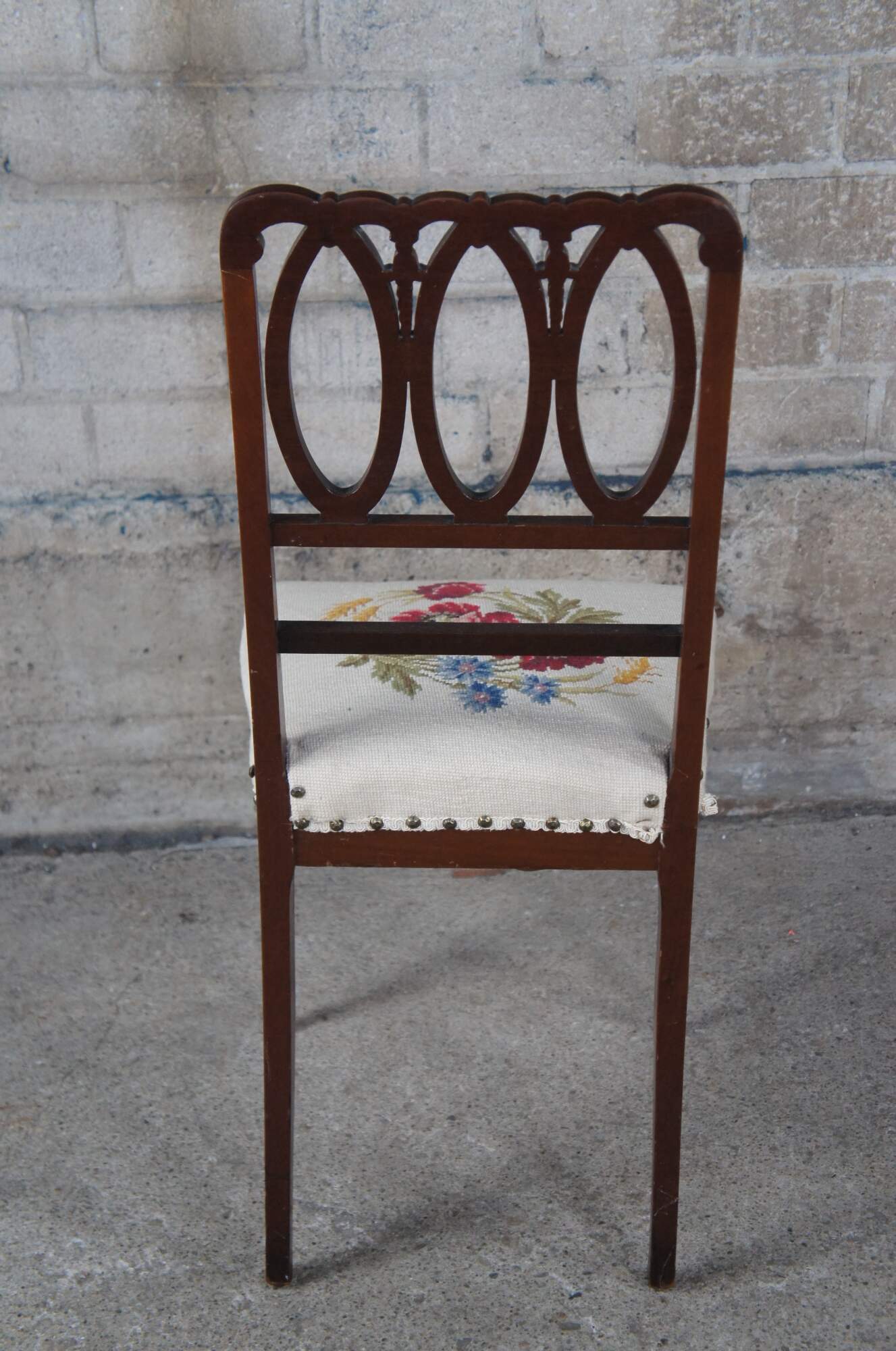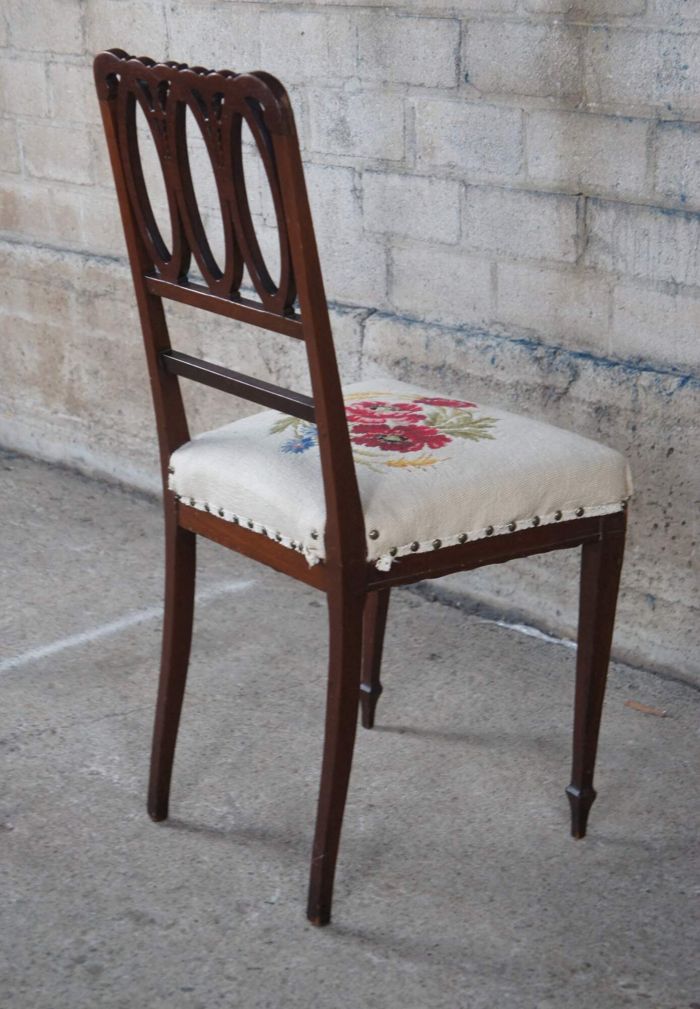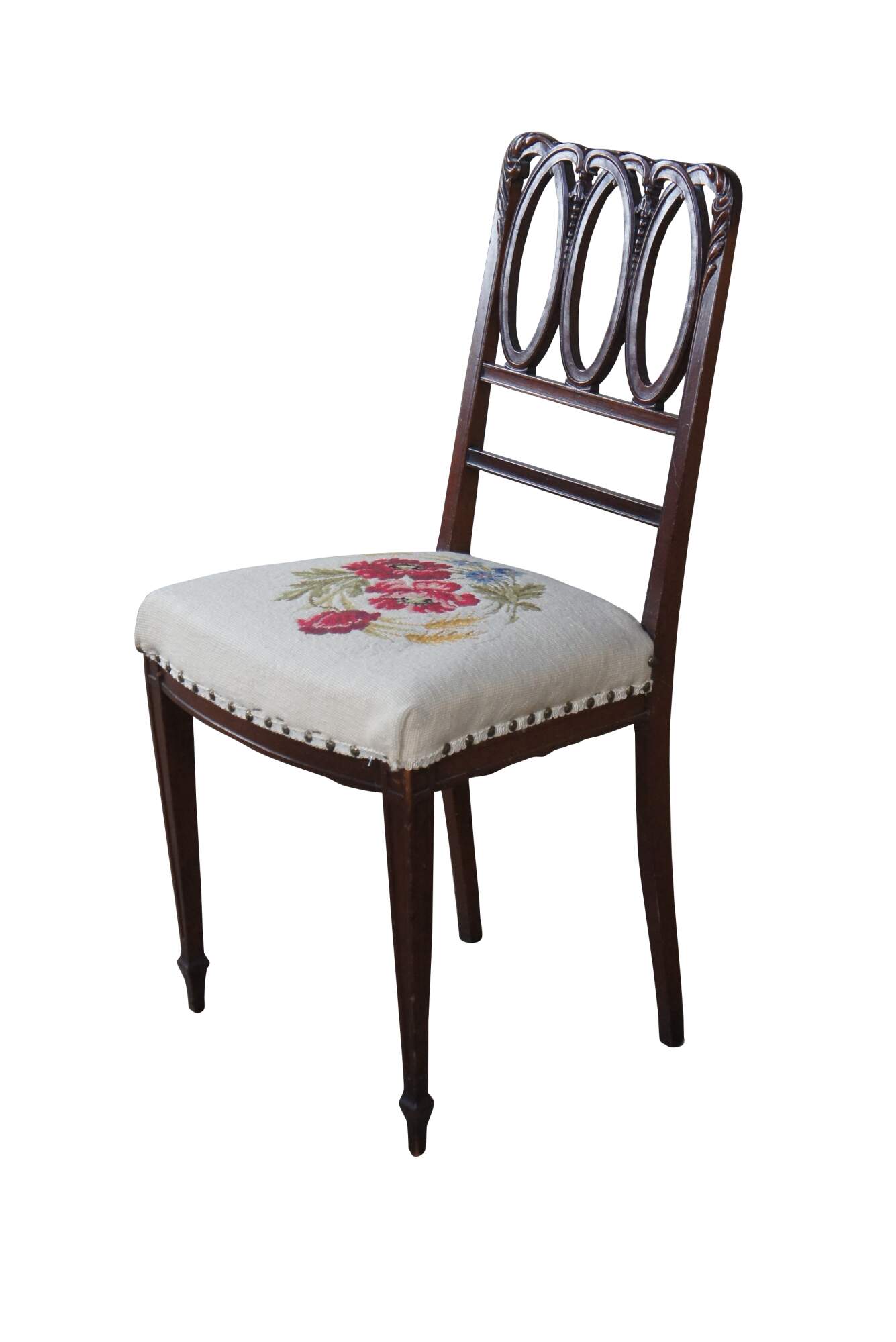 Antique Hepplewhite Hoop Back accent chair. Made of mahogany featuring pierced reticulated design with floral rose needlepoint seat with nailhead trim over tapered front legs.