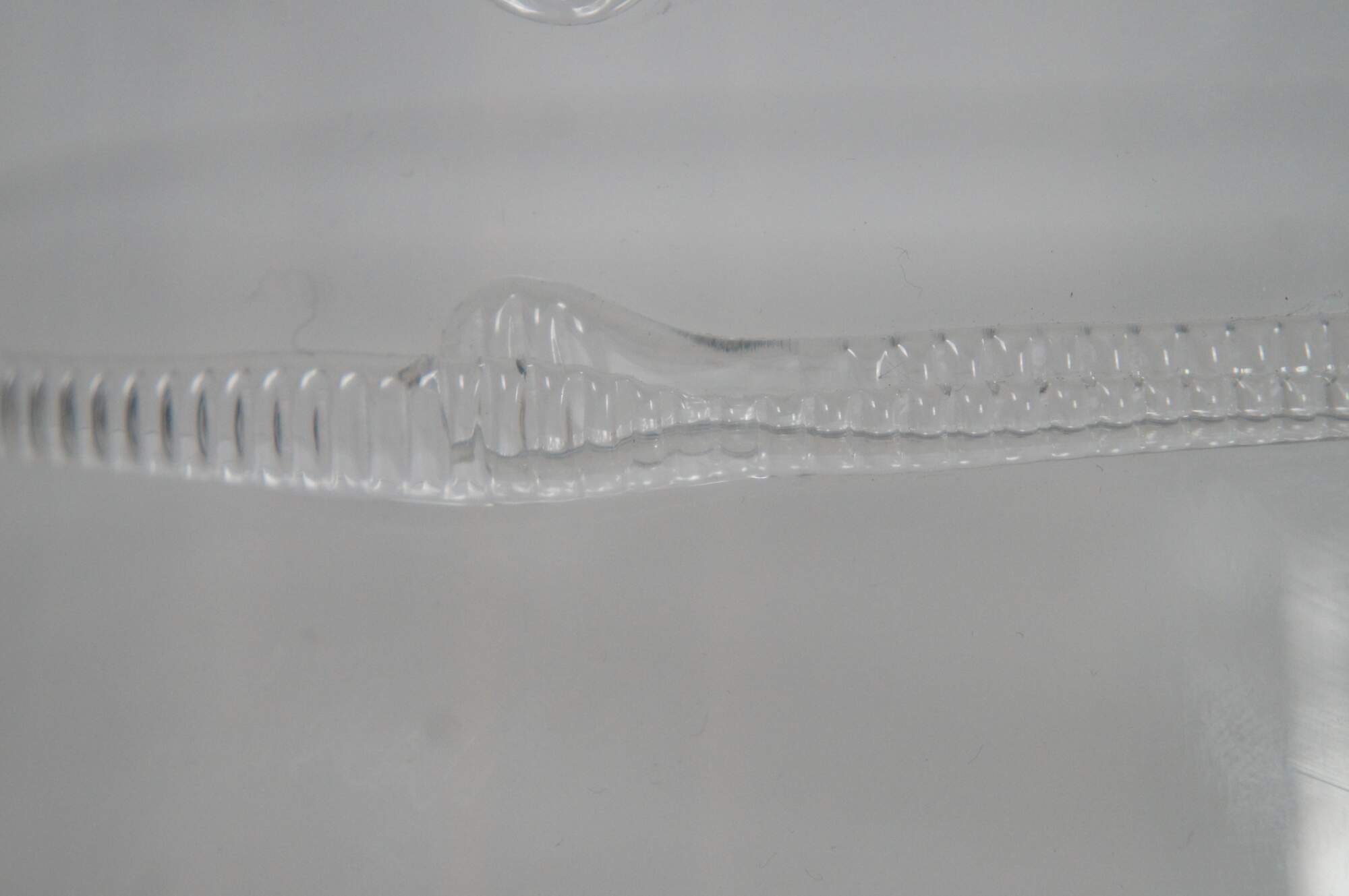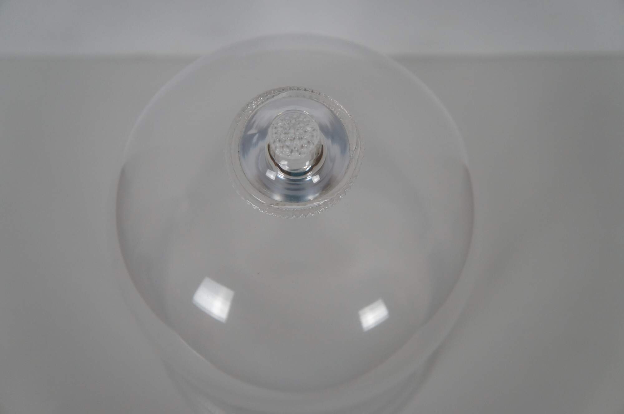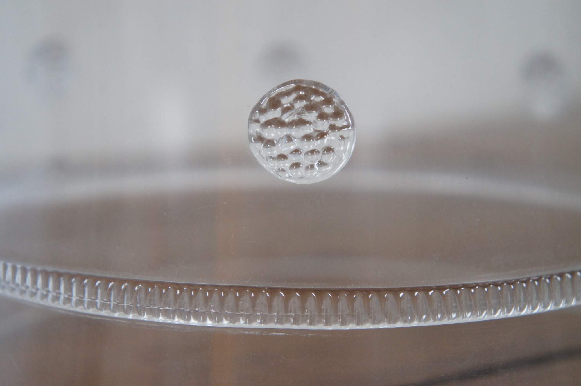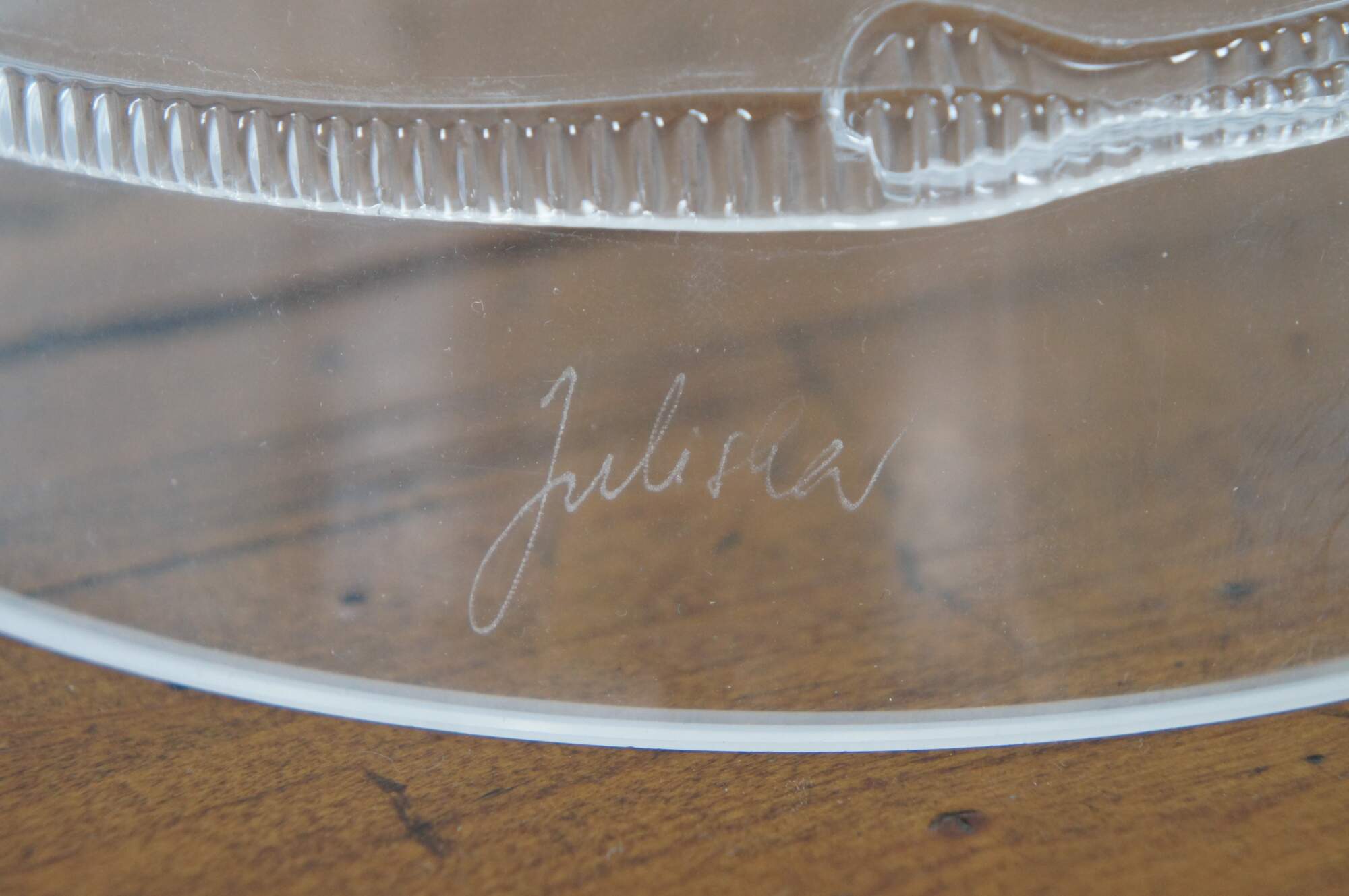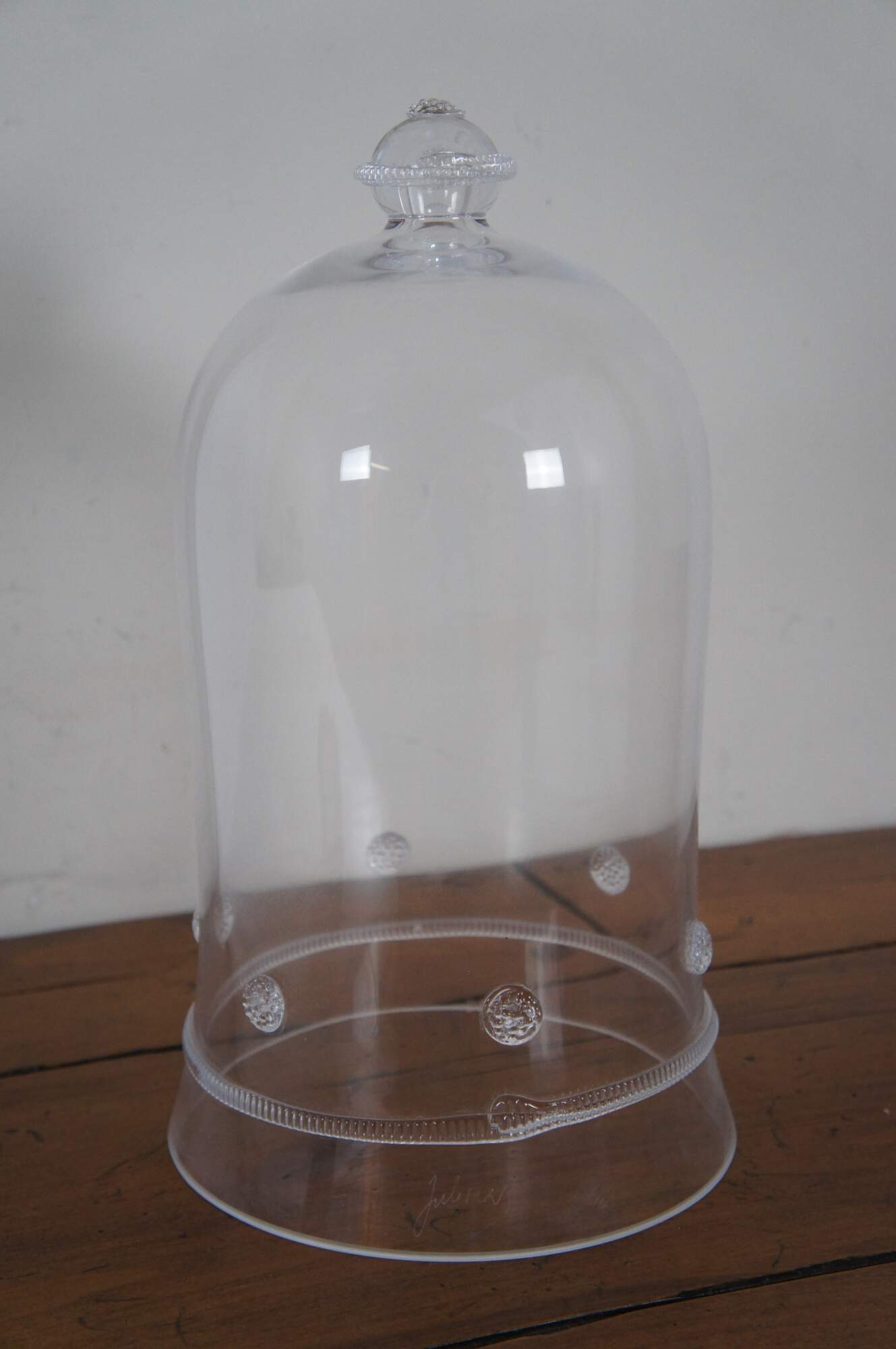 Juliska clear art glass tall dome comver / cloche / bell jar in the Isabella pattern, featuring a ridged band around the base and studded with six beaded medallions. Brand hand etched at base.