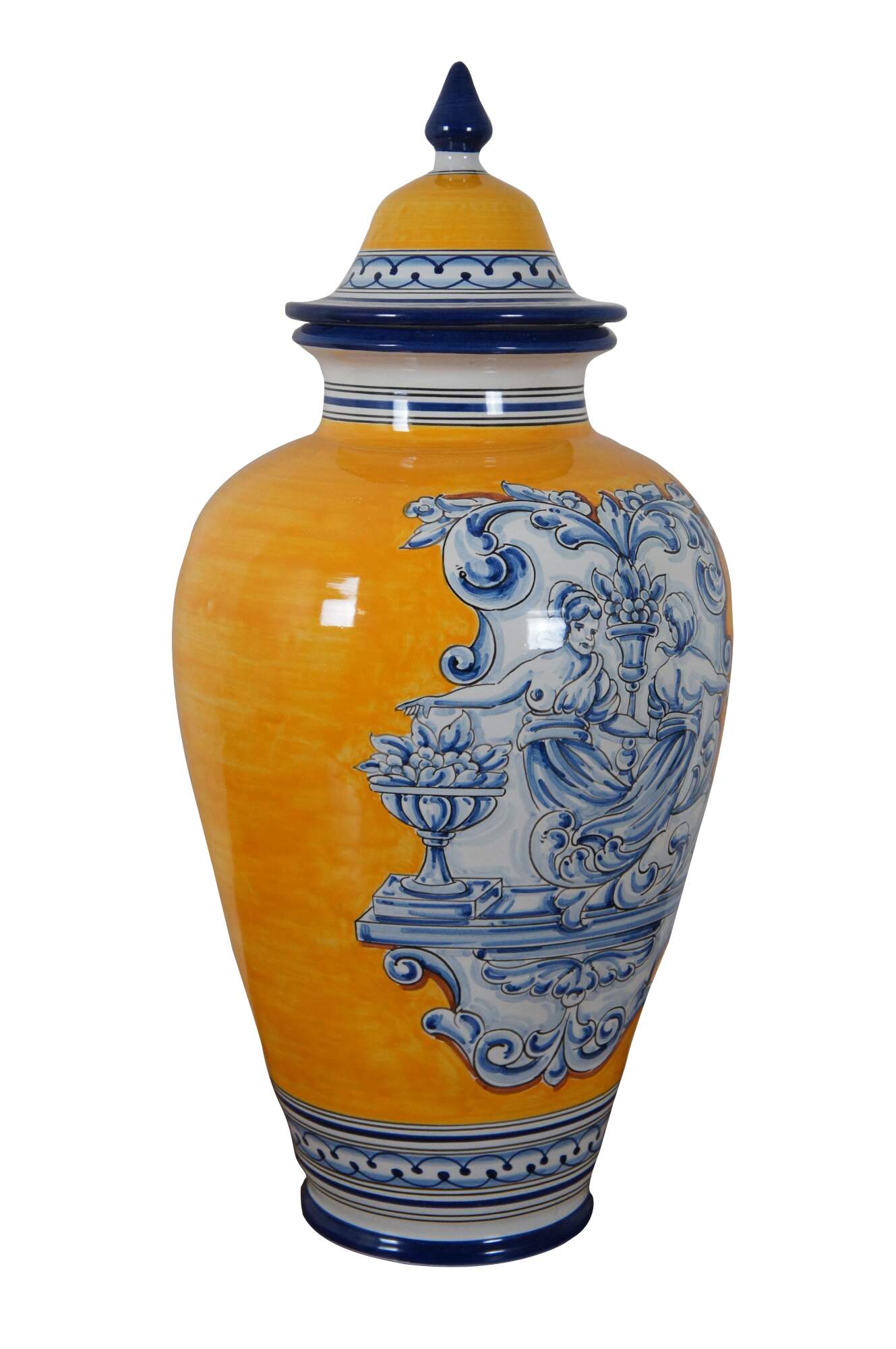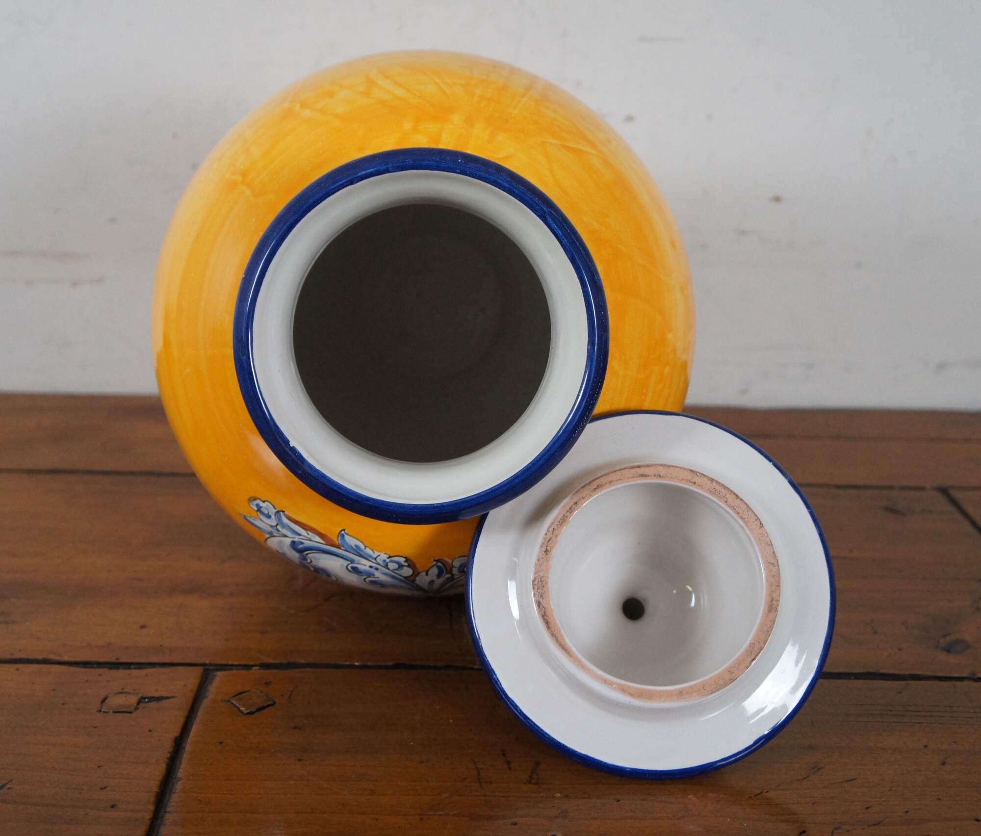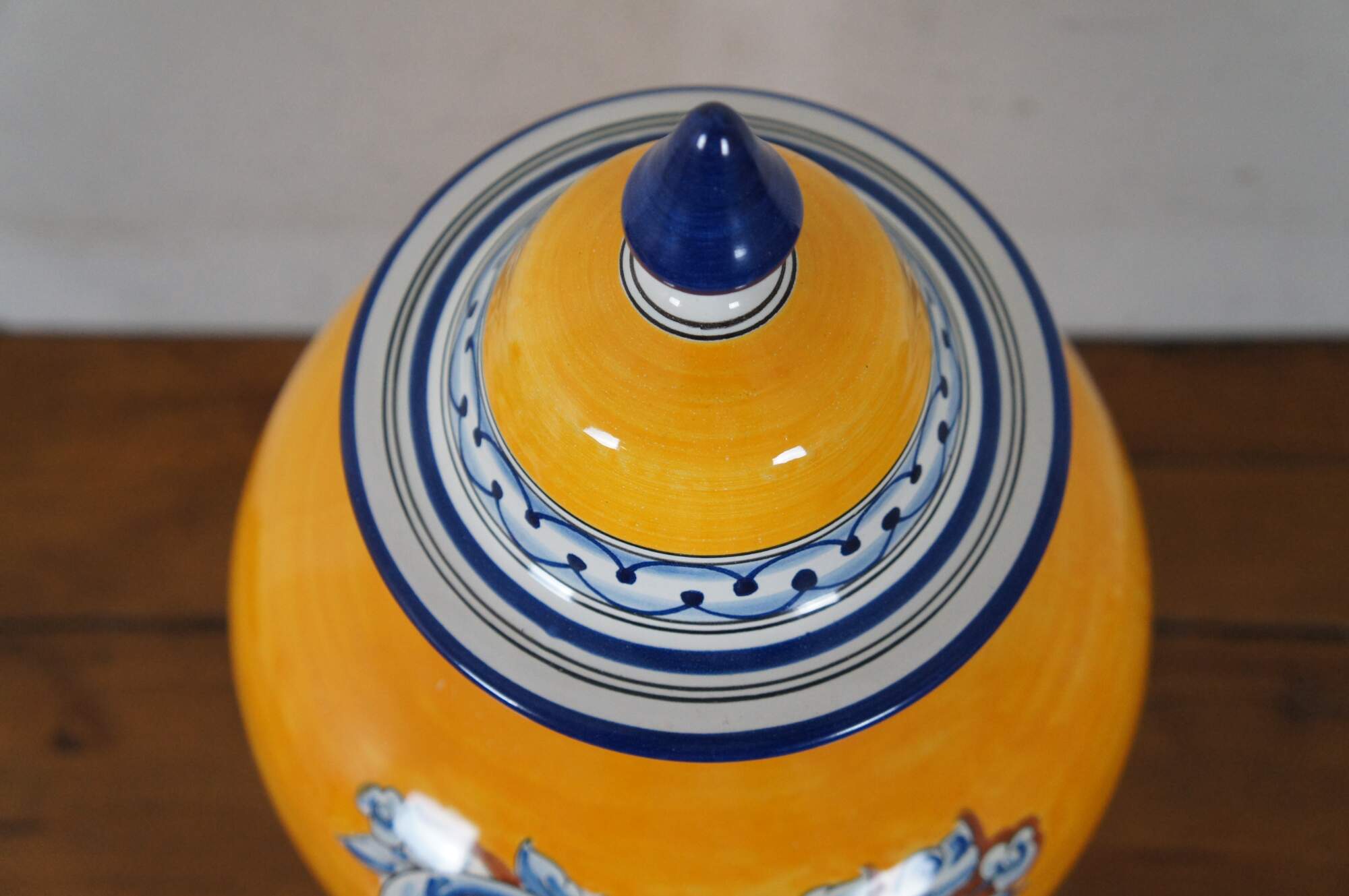 Vintage folk art pottery ginger jar / lidded vase / urn, hand painted in yellow with blue and white borders and a central motif of two dancing female figures dancing around urns of fruit and flowers. Signed “El Carmen – Foilan Talavera Spain” on base.