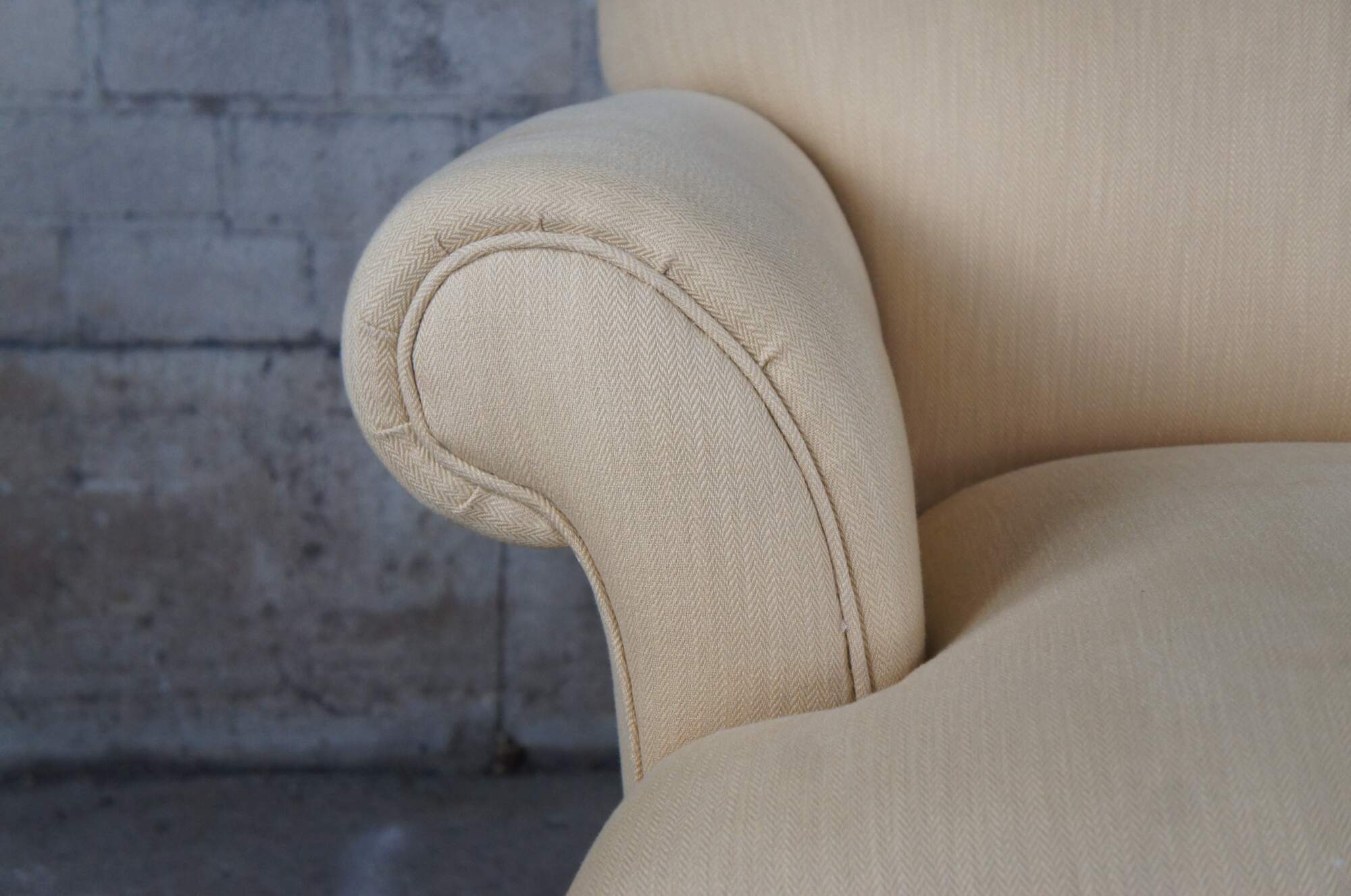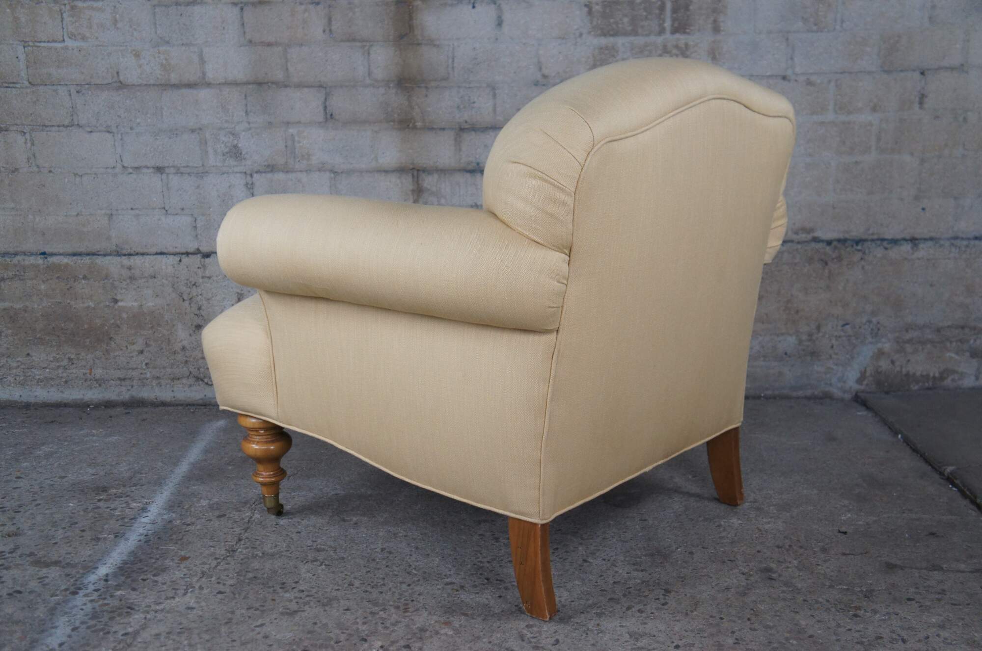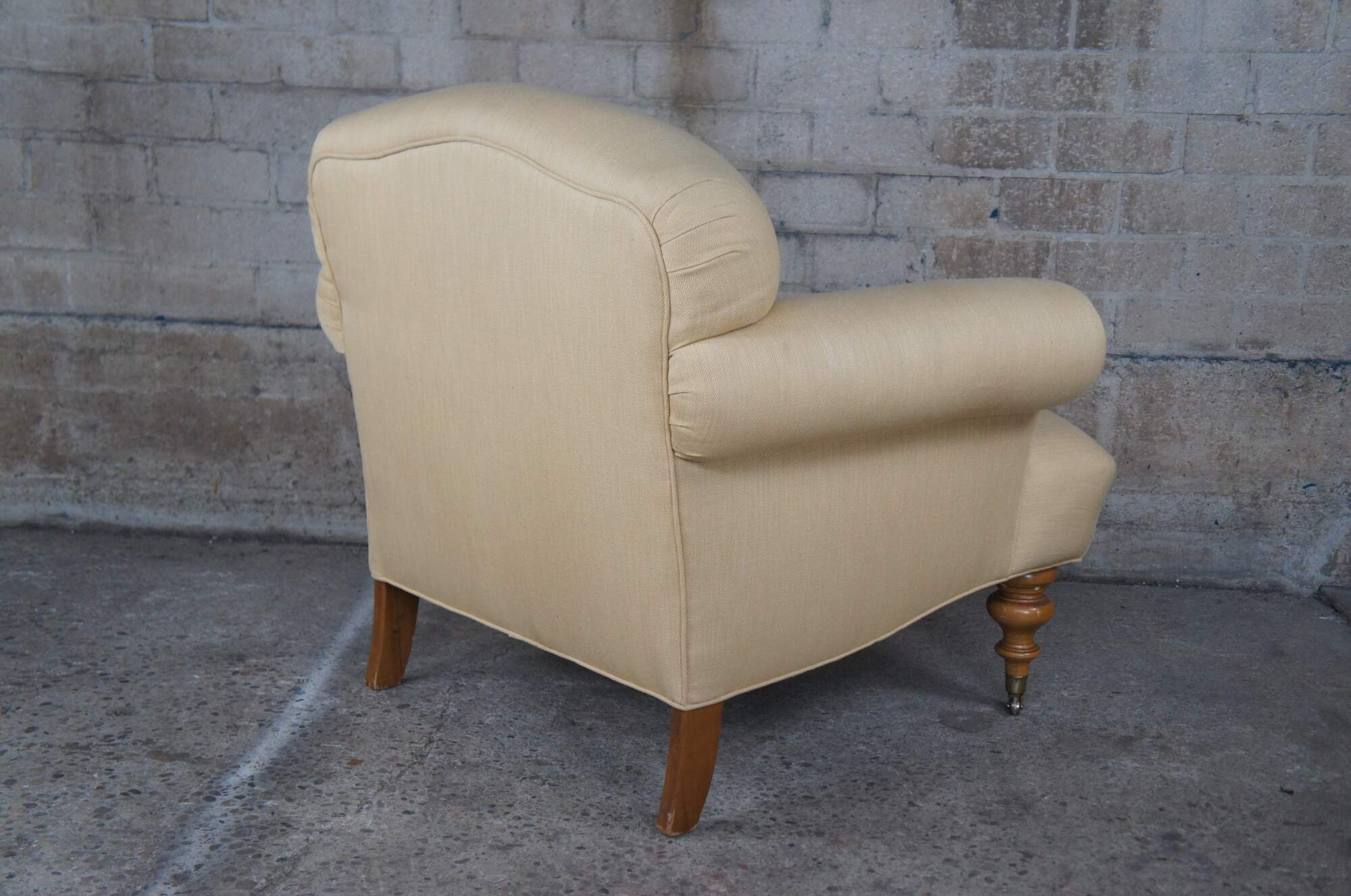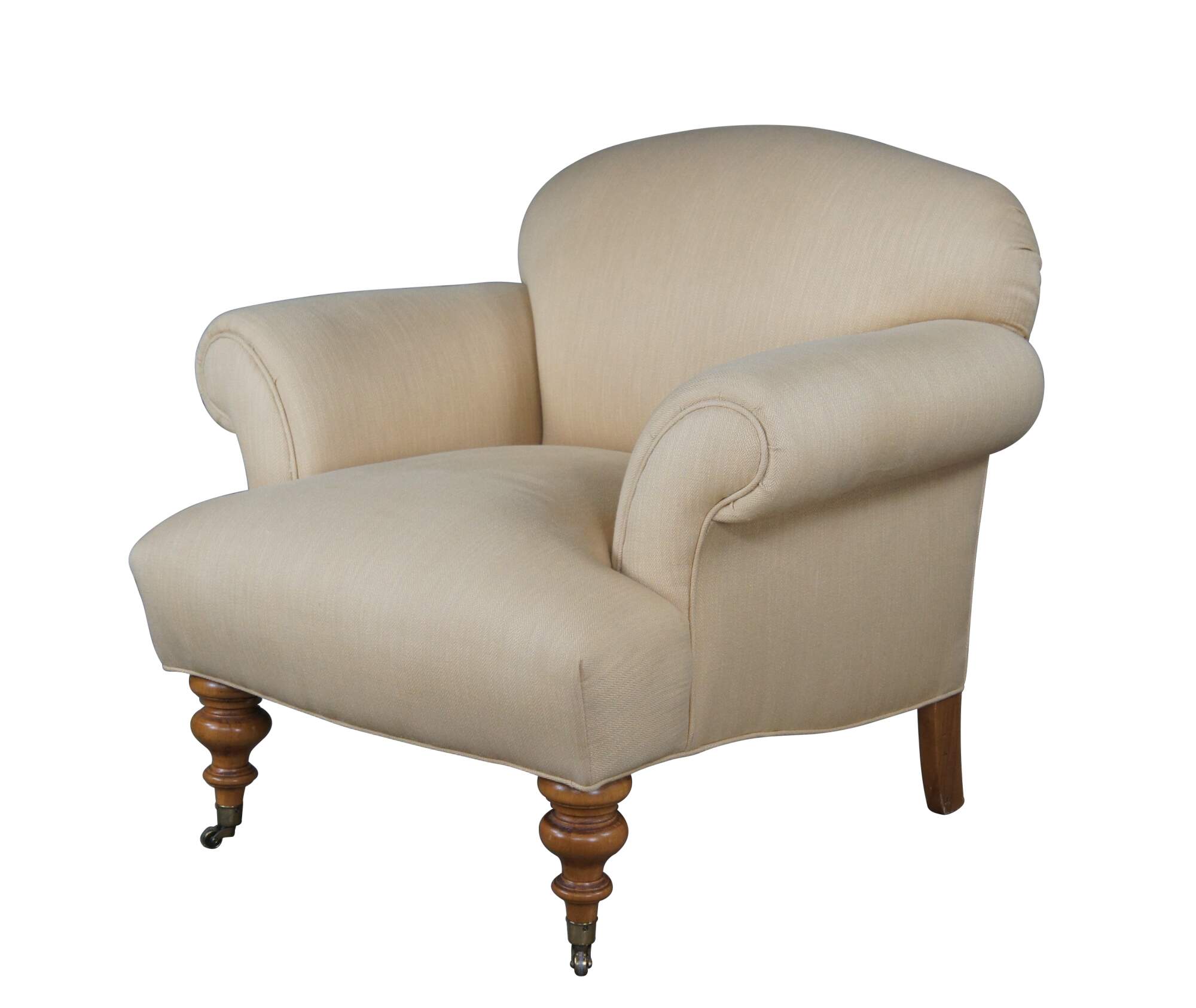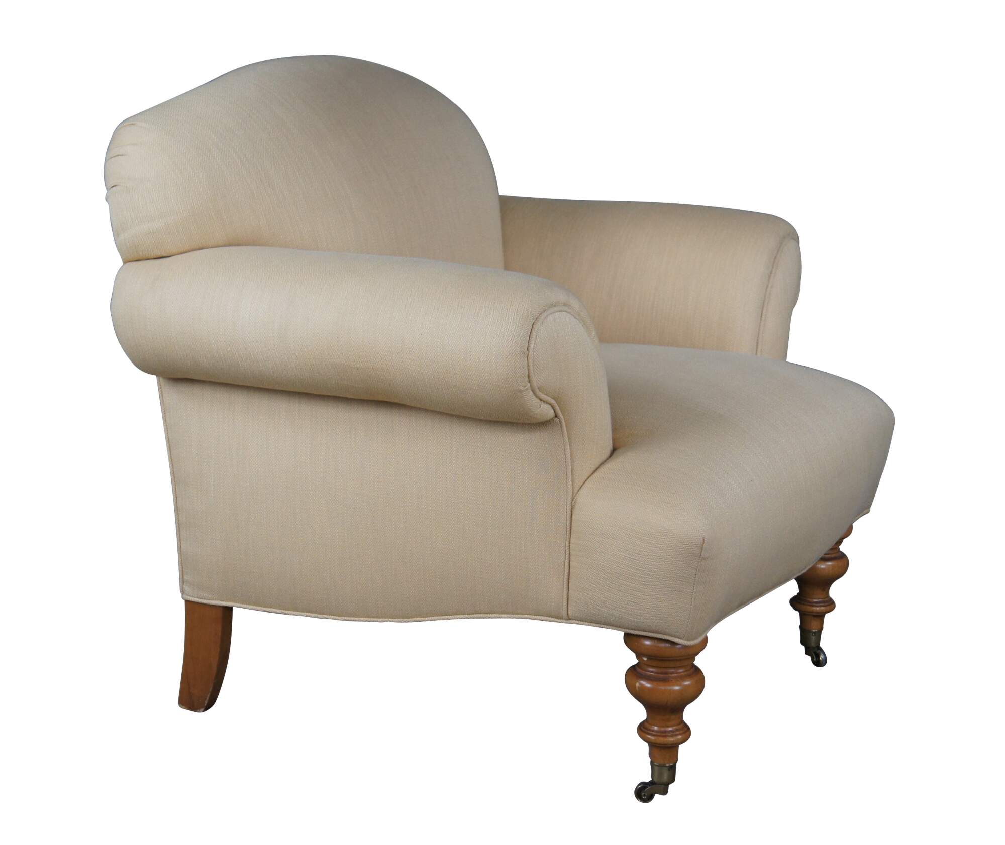 Vintage club or lounge chair by Taylor King. Features flared rolled arms with turned legs and swivel castors. Fabric is biege with a herringbone design.