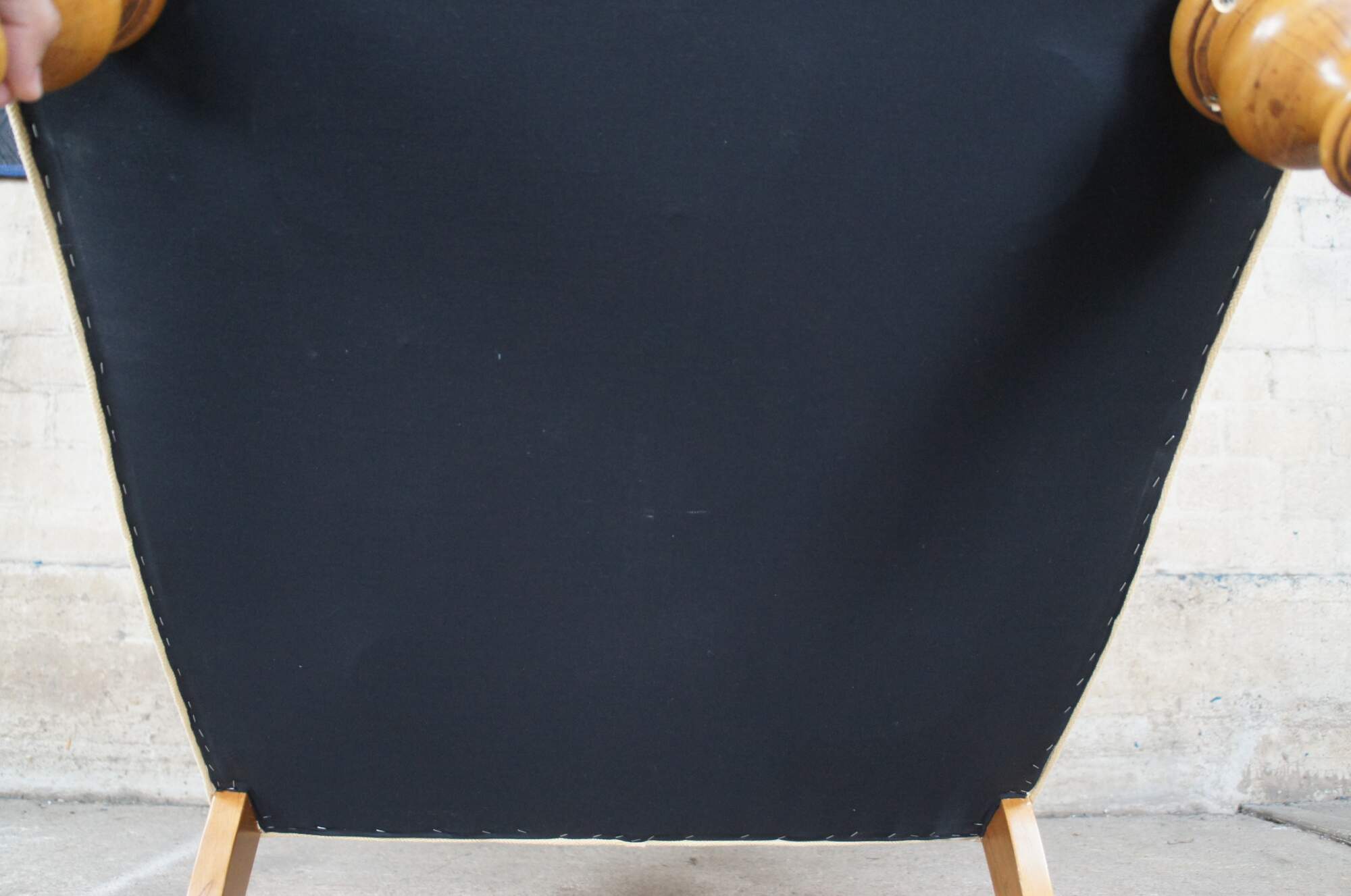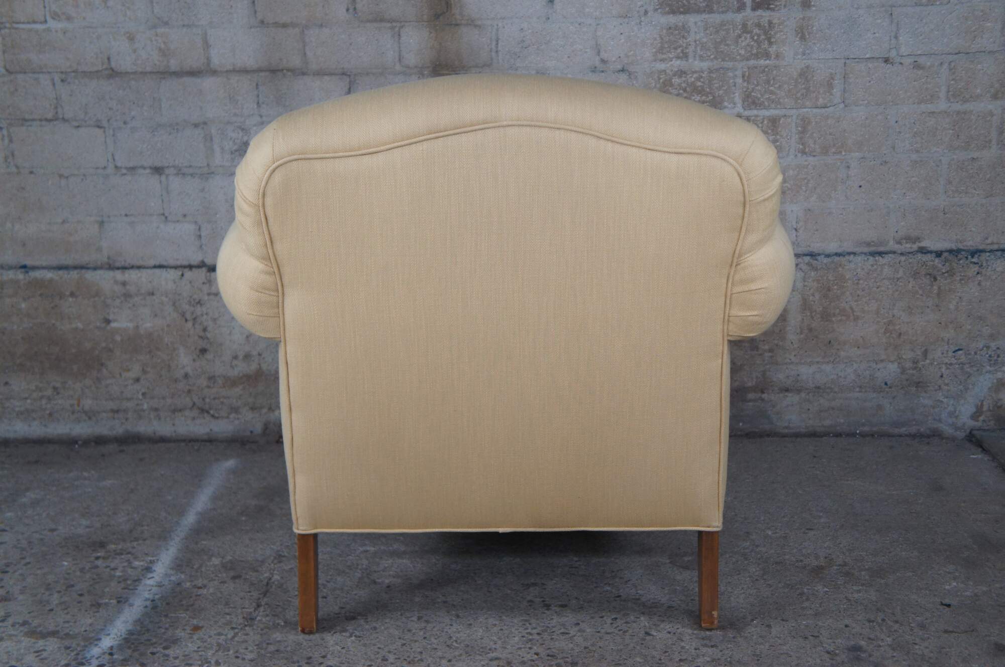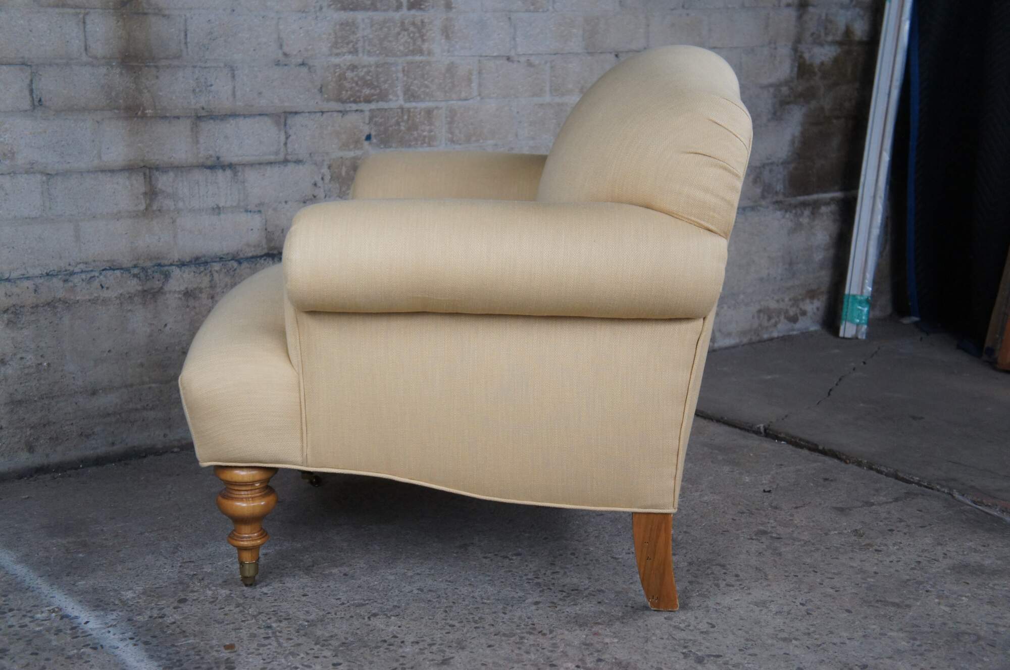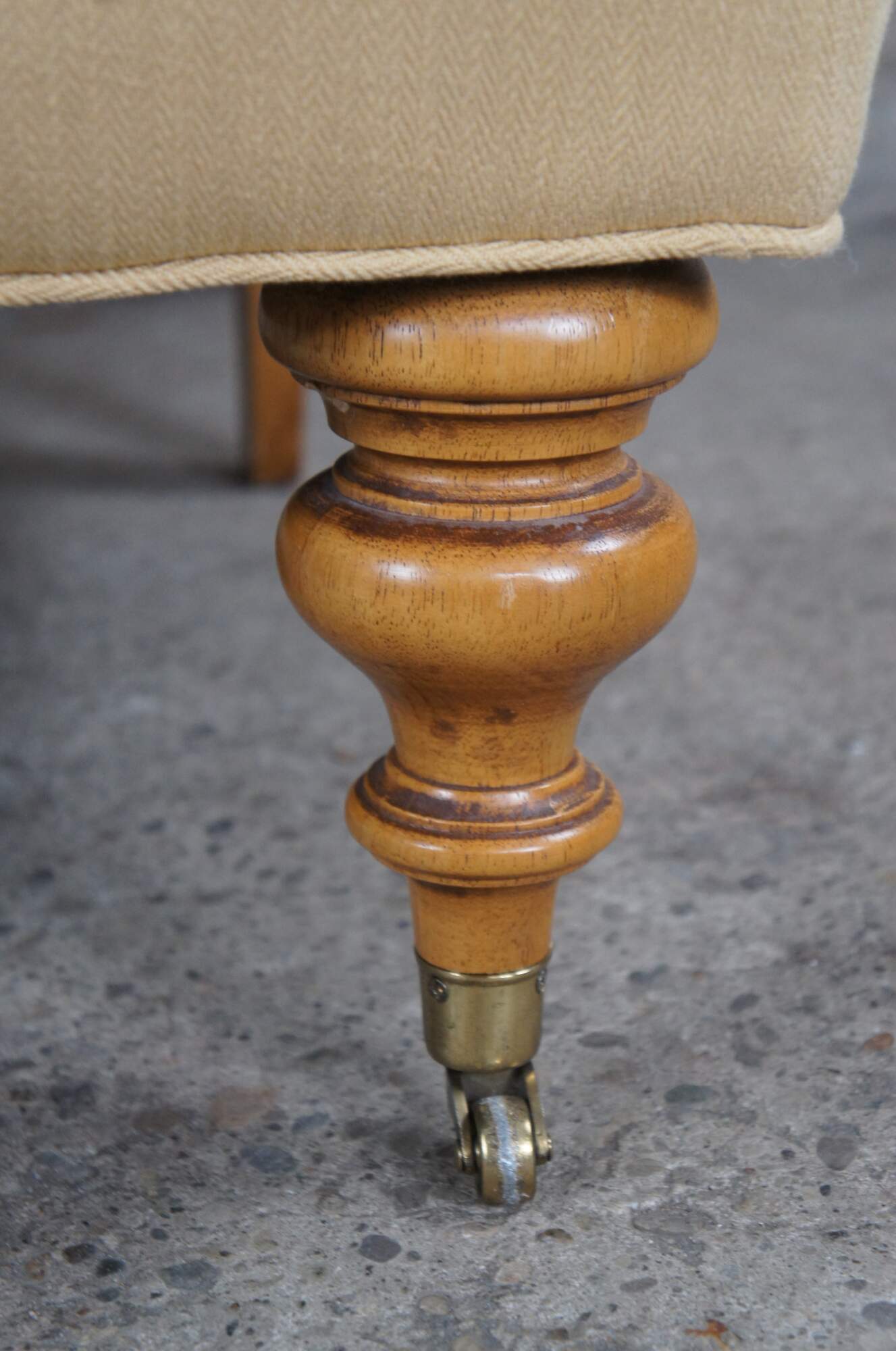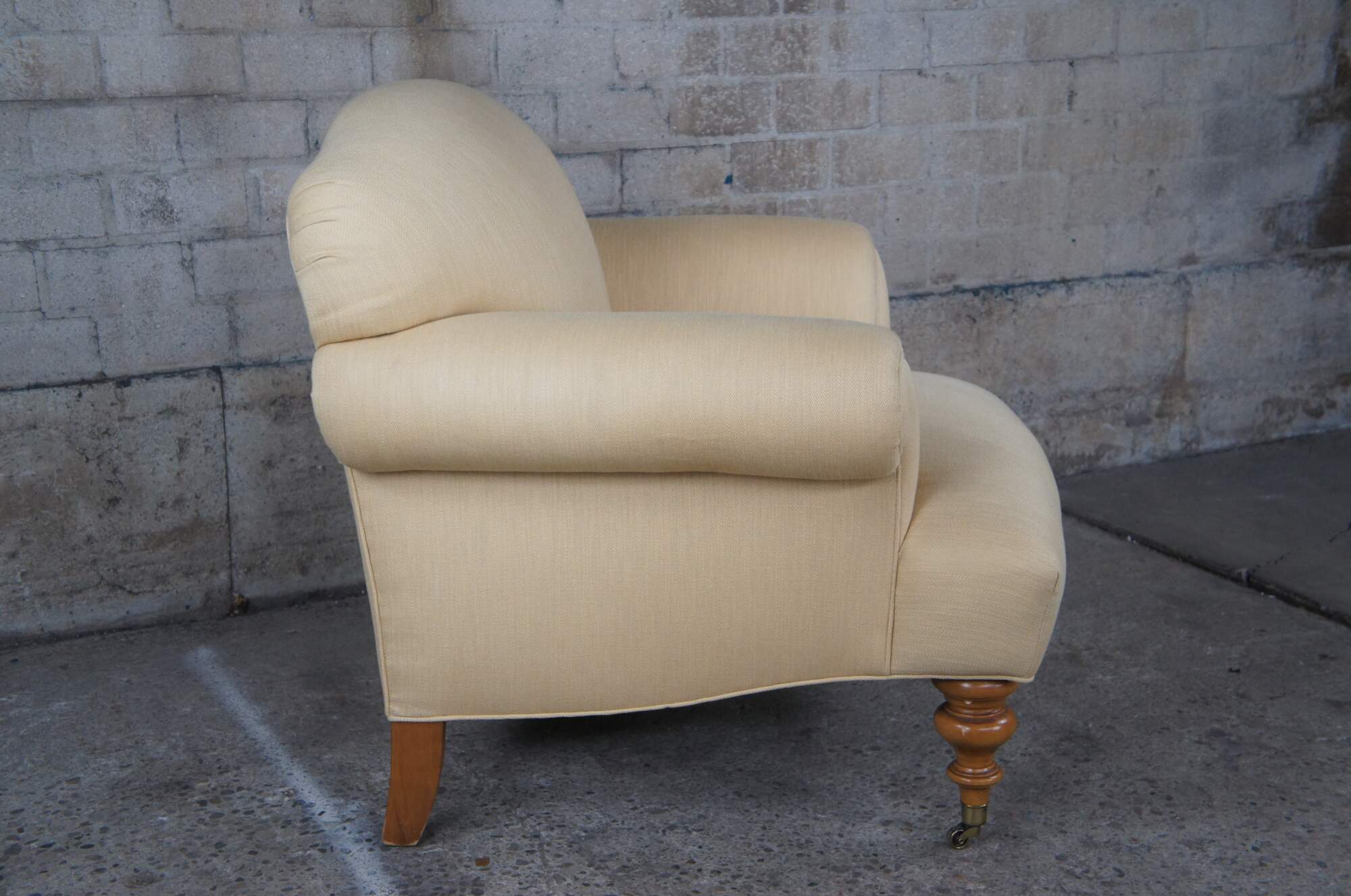 Vintage club or lounge chair by Taylor King. Features flared rolled arms with turned legs and swivel castors. Fabric is biege with a herringbone design.