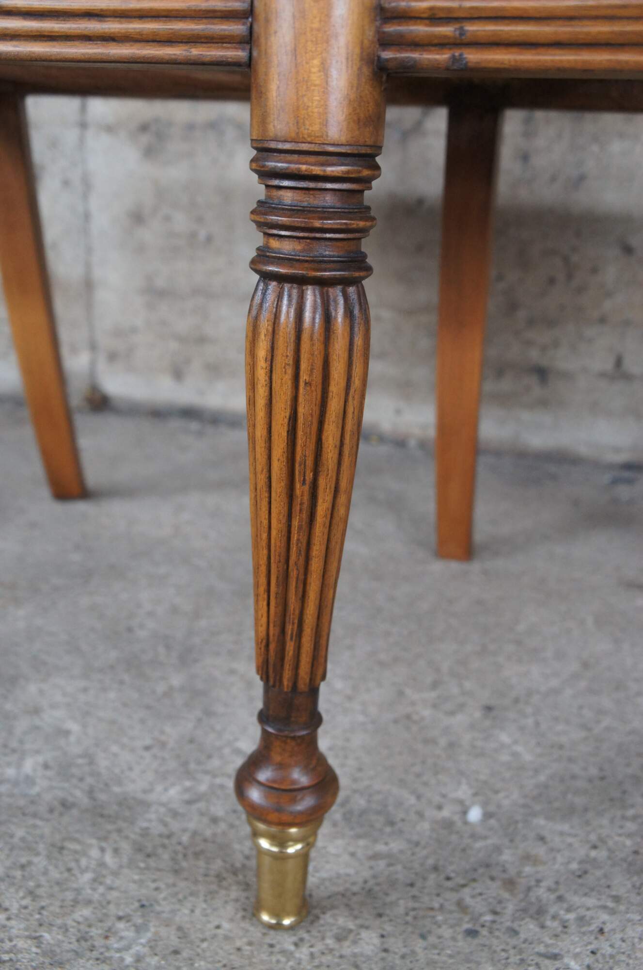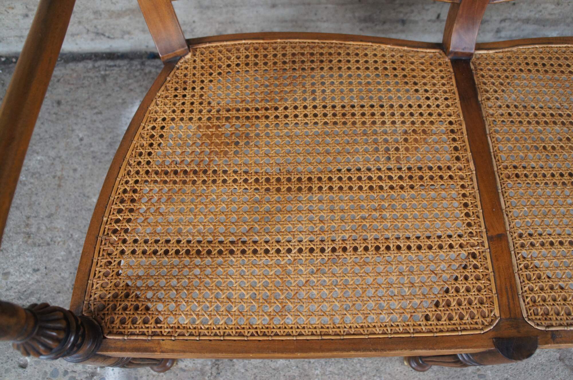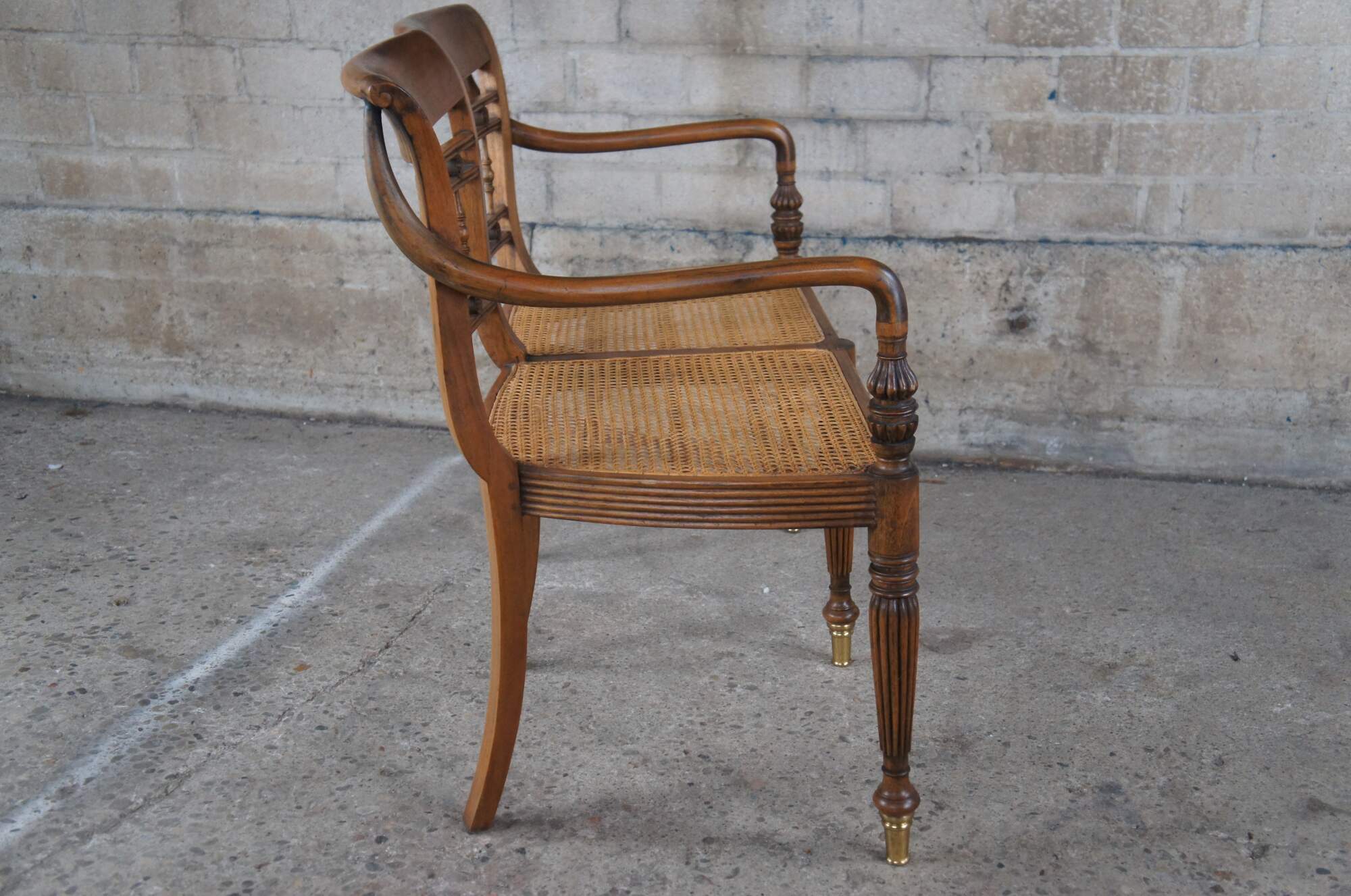 Vintage Pierce Martin British Colonial Regency Plantation bench. Made of mahogany featuring caned seat with piereced spindel and floral medallion back support, sloped arms, caned seats, and fluted tapered legs with brass capped feet.