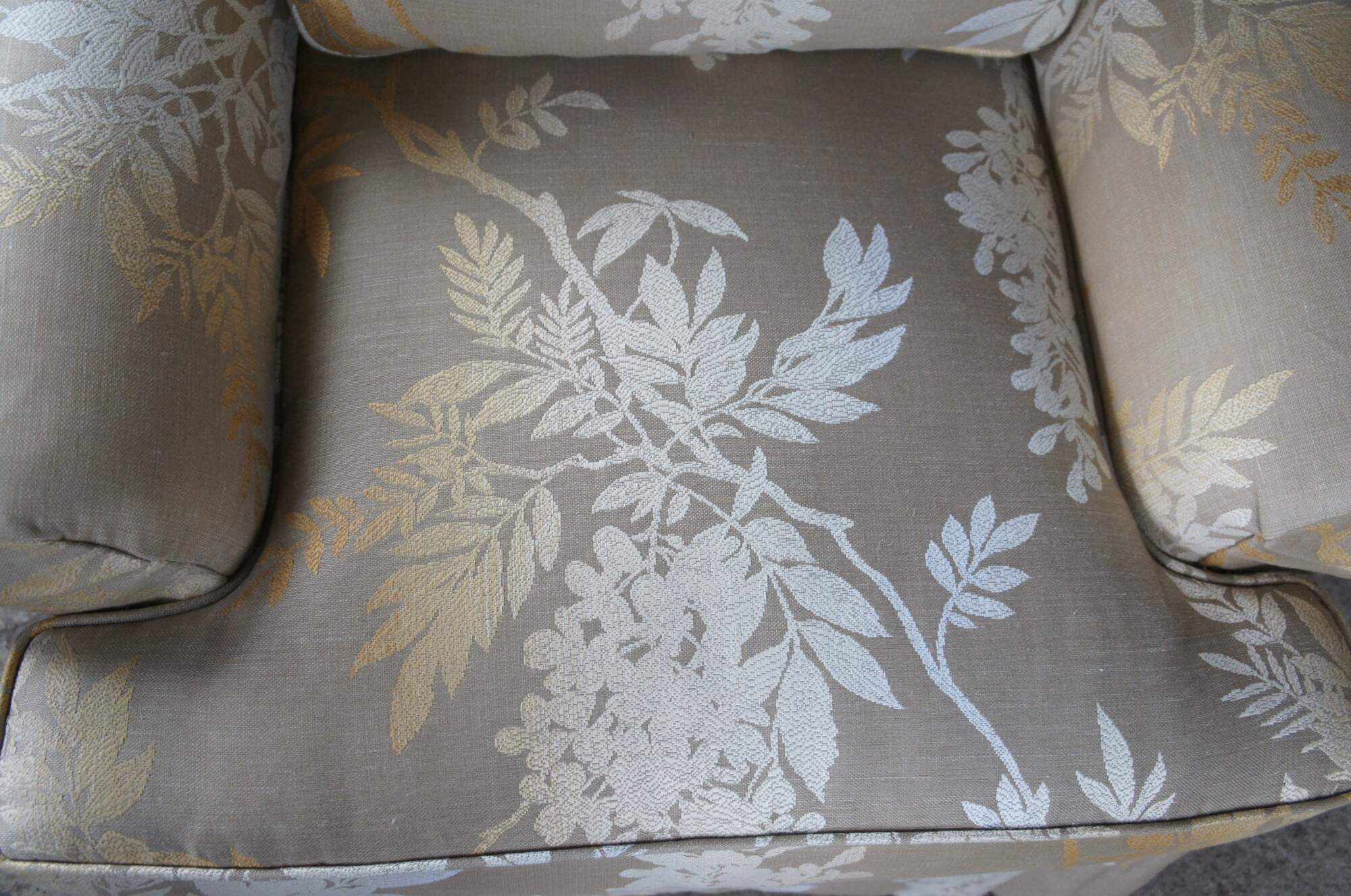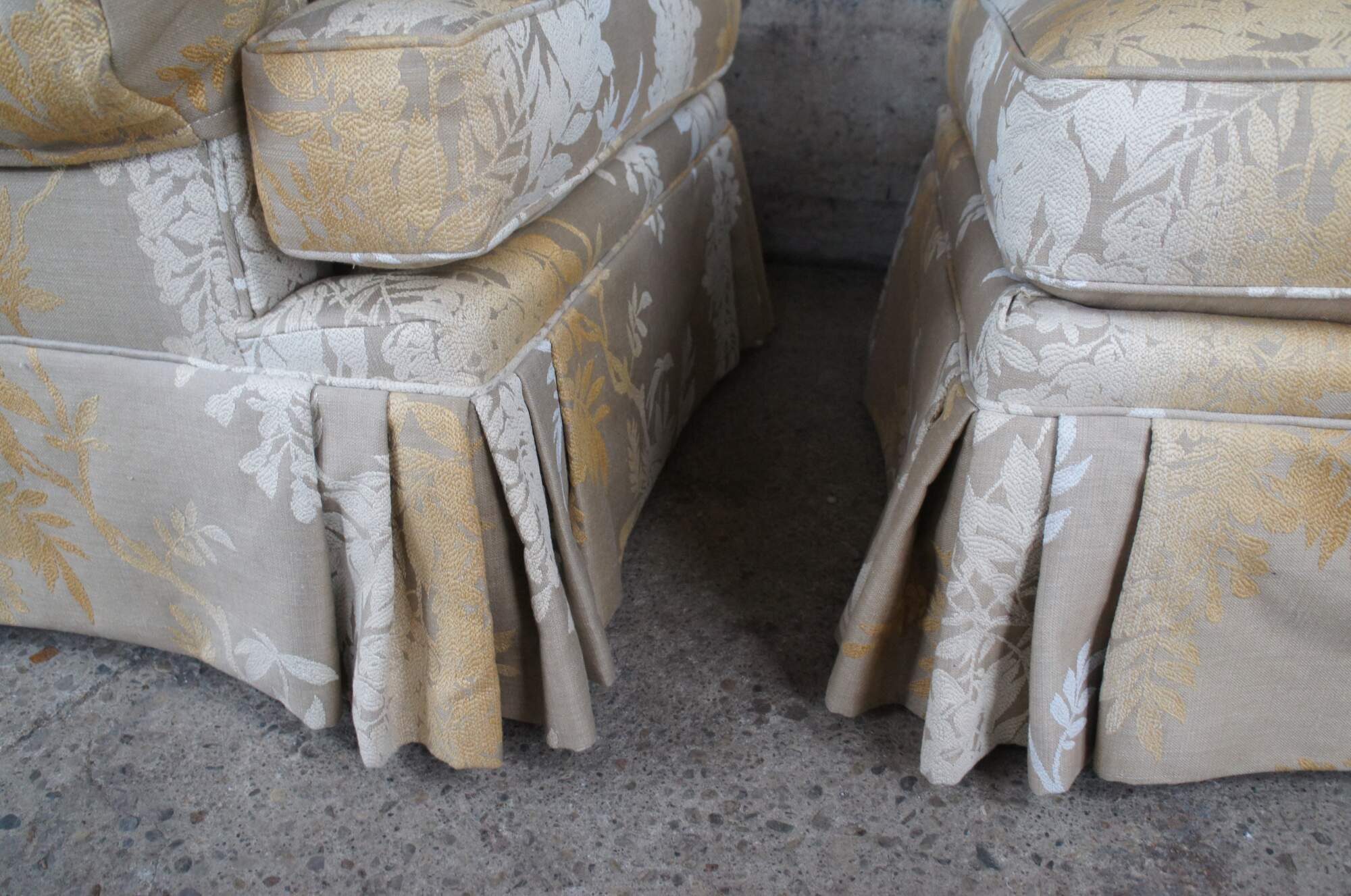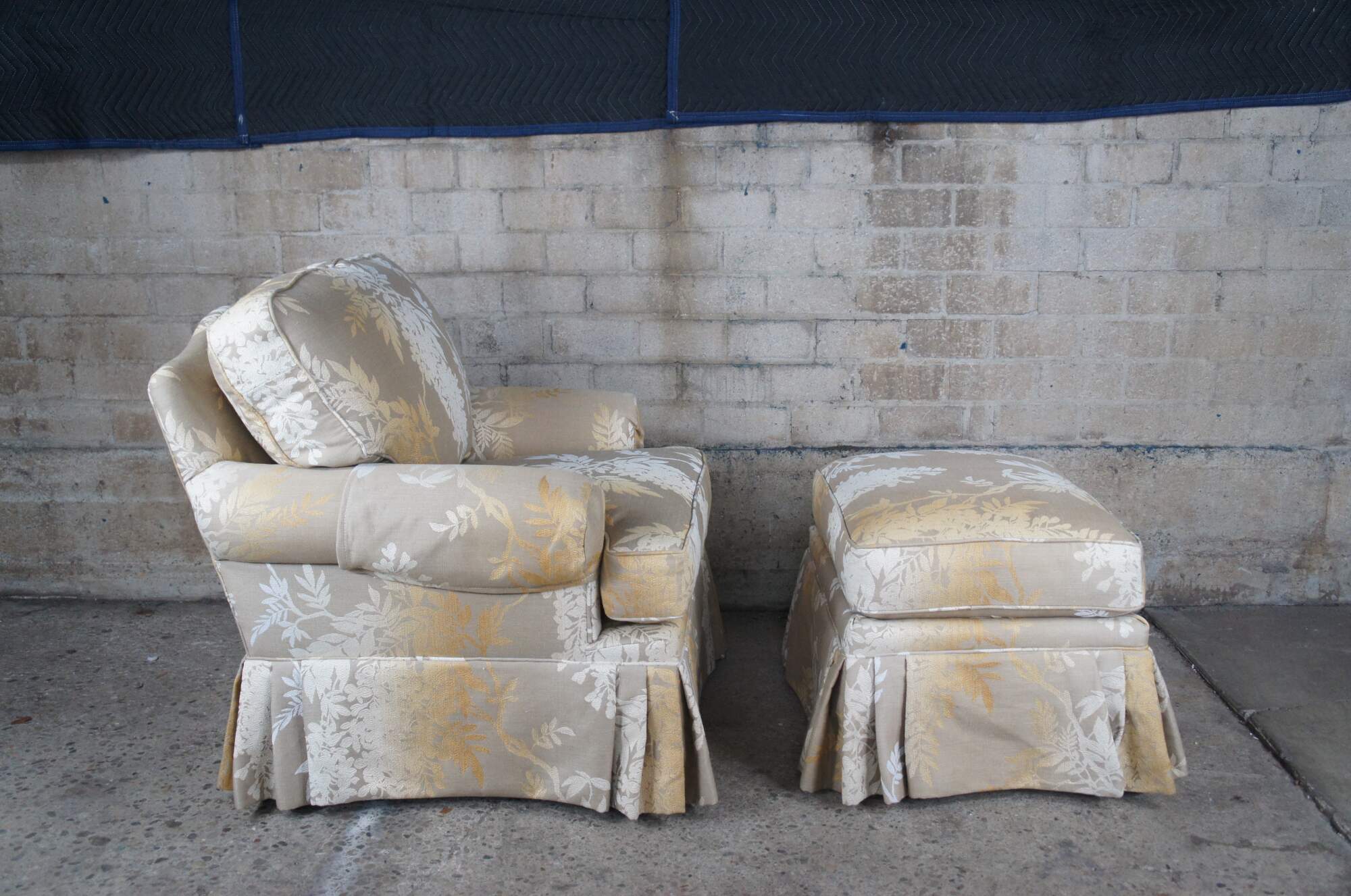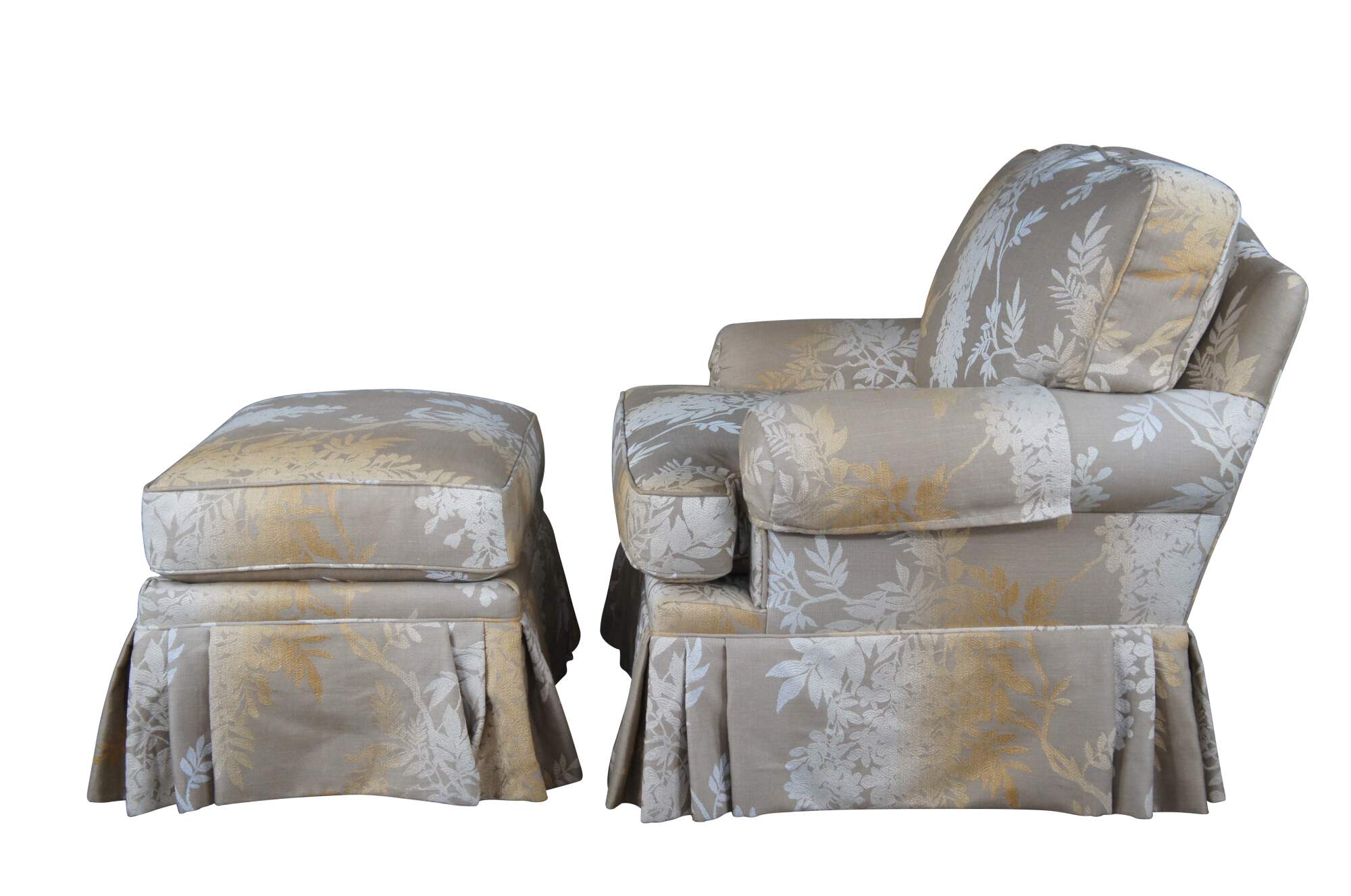 Vintage Lynch Chair & Ottoman by Taylor King, #5316-01, 5316-00. featuring rolled arms with beige / gold / whitish silver floral skirted upholstery.