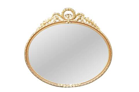 Mid 20th Century T. Eaton & Co oval wall hanging mirror. Neoclassical inspired with ribboned accents and foliate detail. Made from wood and gesso.