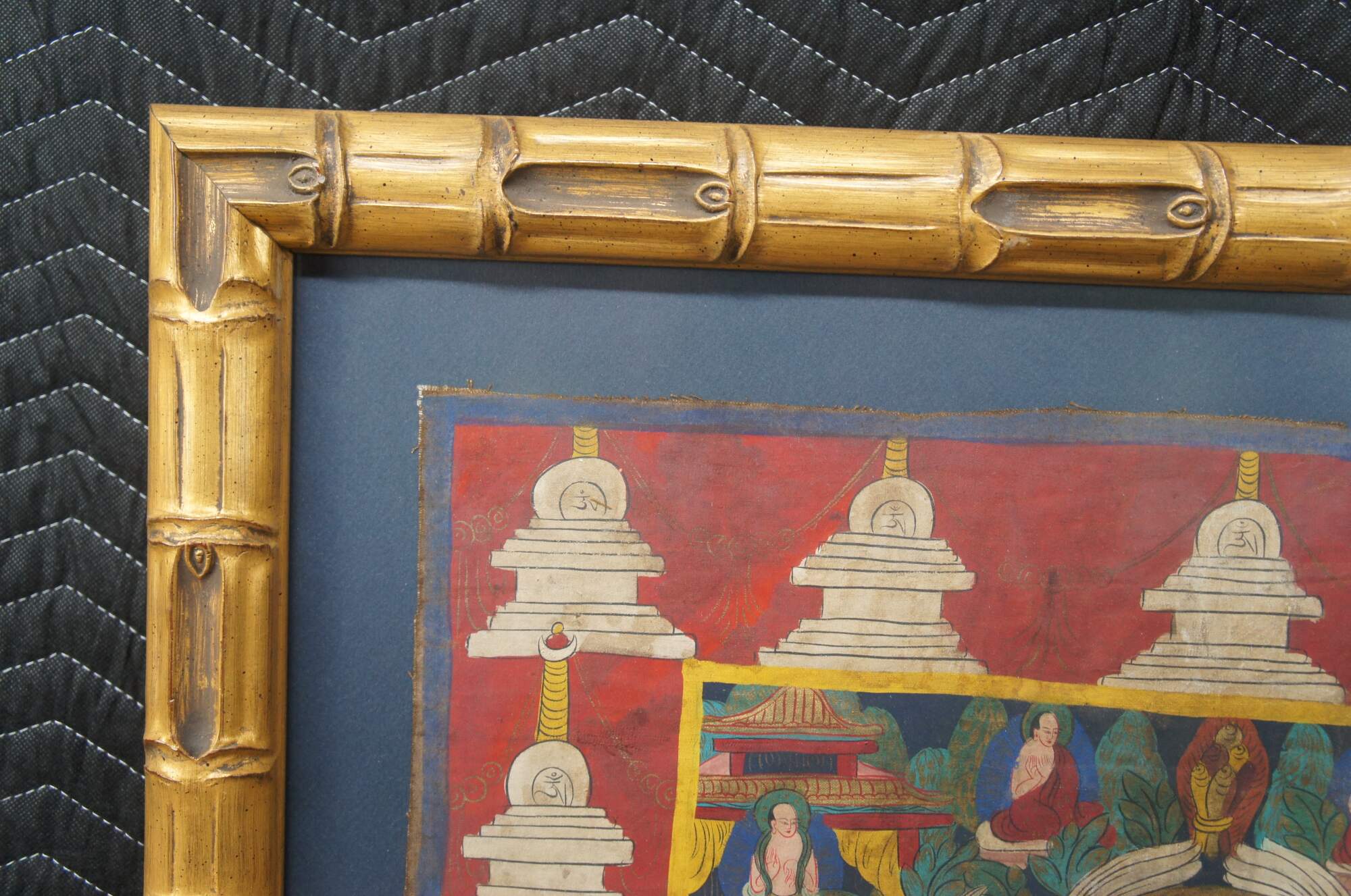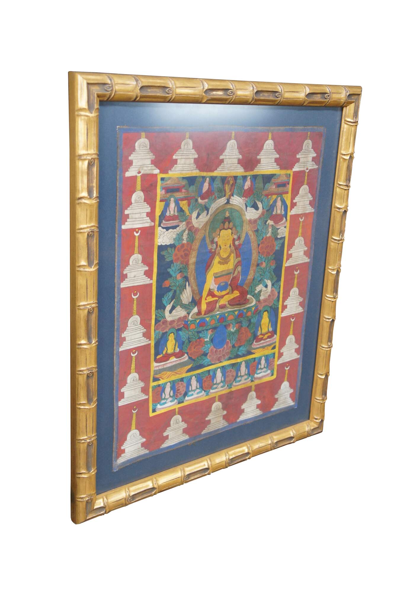 Hand Painted Tibetan Thangka from the last half of the 20th century. Features a central buddha surrounded by foliate, flowers, whooper swans and smaller buddha figures. The border is framed in Stupa's (Pagodas). Framed in wood with raised faux bamboo