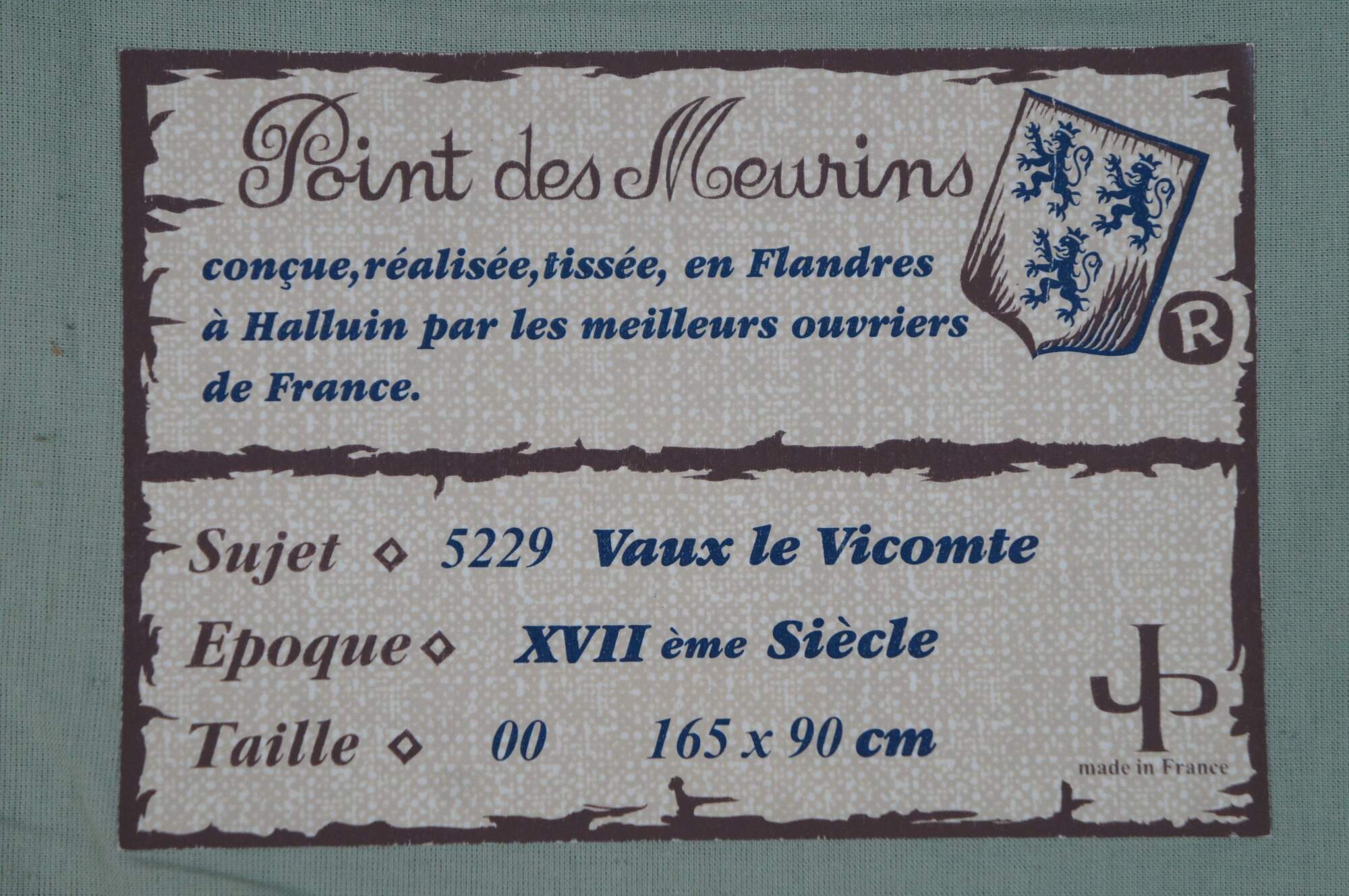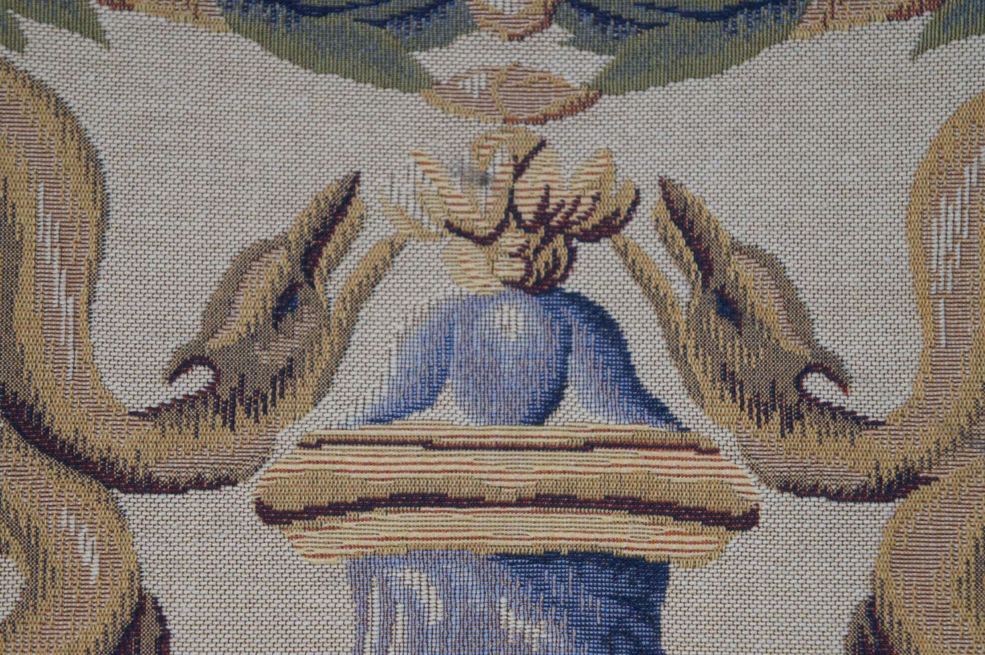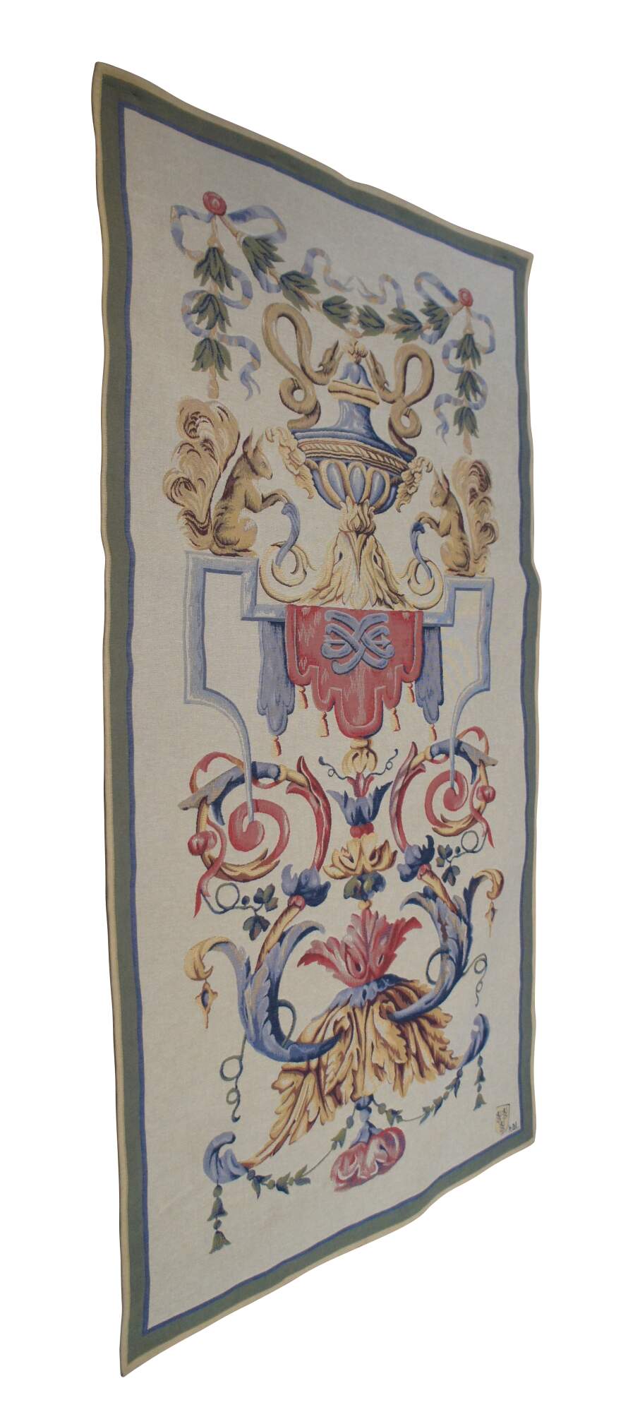 Vaux-Le-Vicomte is a genuine Jules Pansu tapestry. It is adapted from the wainscoting decorating the "Salle des Buffets" at the castle of Vaux-le-Vicomte. This castle, built between 1656 and 1661 for Nicolas Fouquet, Superintendent of Finance for Louis XIV, was the masterwork of three gifted Medieval Renaissance artists: the architect Louis Le Vau, André Le Nôtre for the gardens, and Charles Le Brun for the interior decoration. On this arabesque setting, inspired by the loggia style of Raphaël at the Vatican, one can see Fouquet’s emblem, a squirrel, a serpent. This tapestry is fully lined incorporating a rod pocket on the back for hanging.