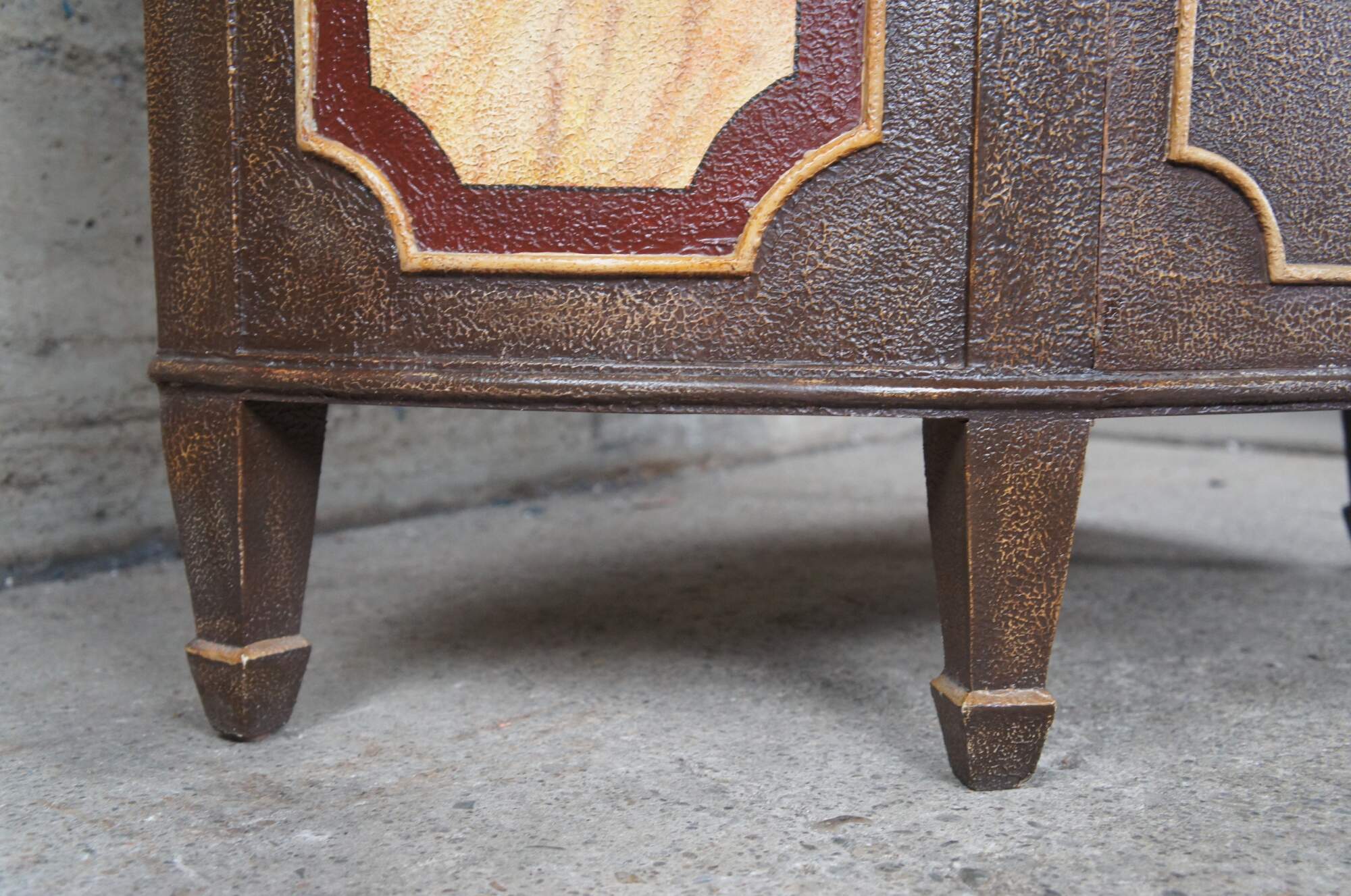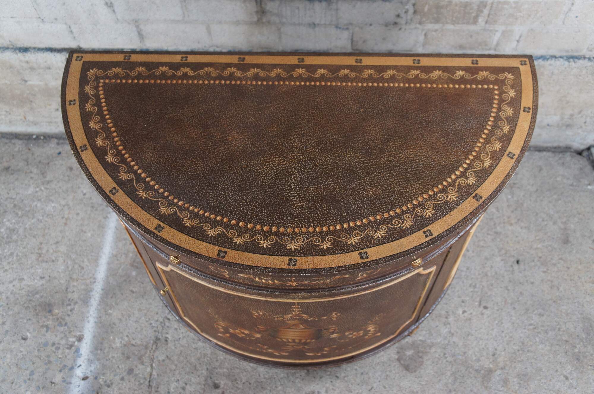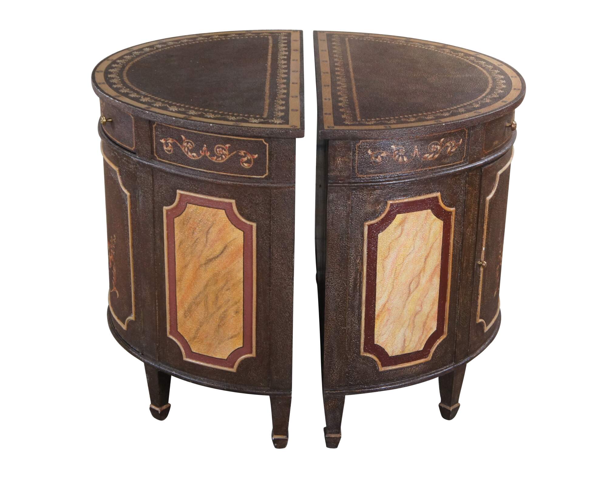 Pair of two Maitland Smith Poise Chiffonier sideboard cabinets, console tables or commodes featuring demilune / half round form with upper drawer, lower cabinet and textured hand painted finish of a Neoclassical urn with lion heads surrounded by scrolled floral / acanthus accents.