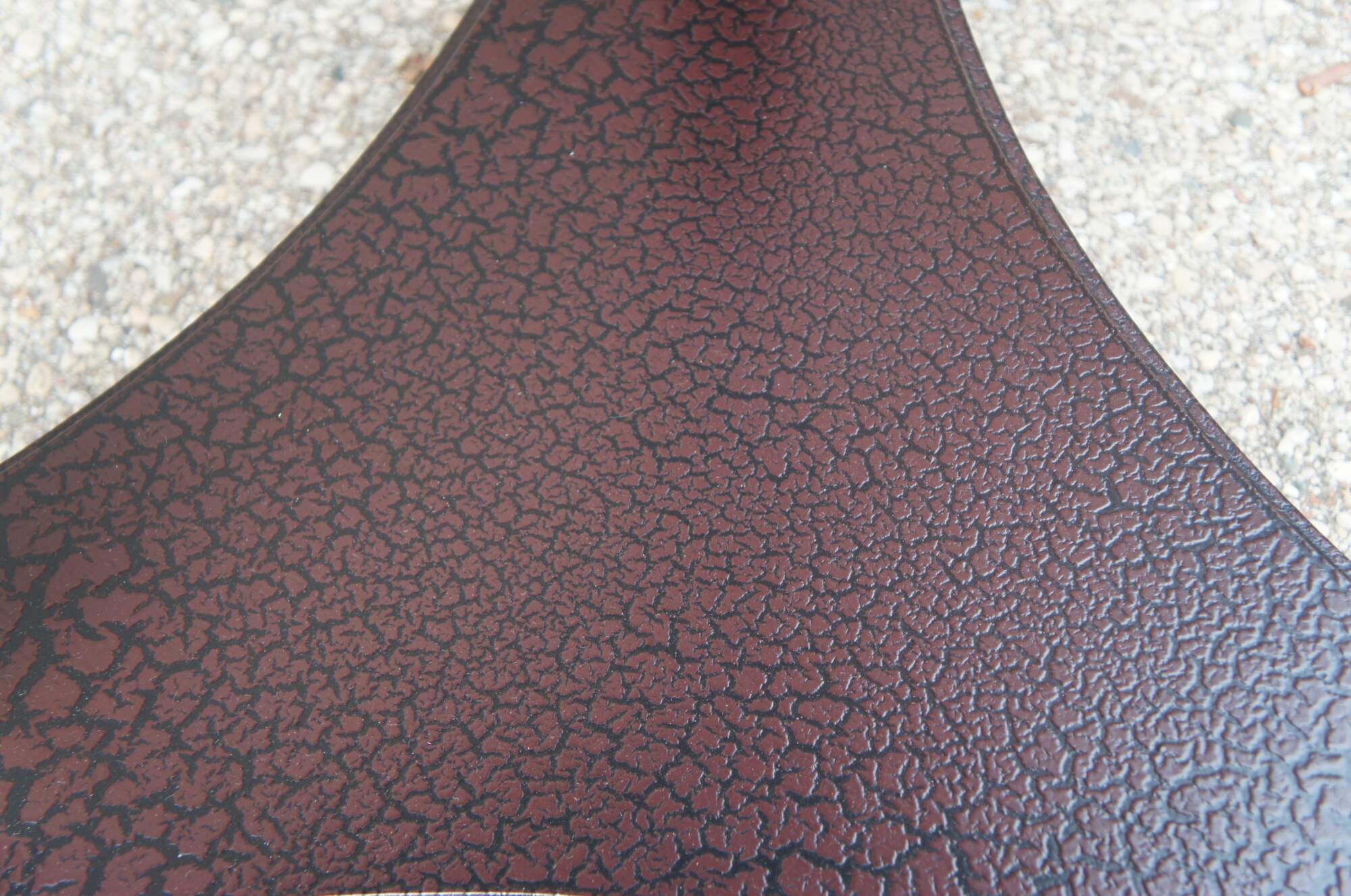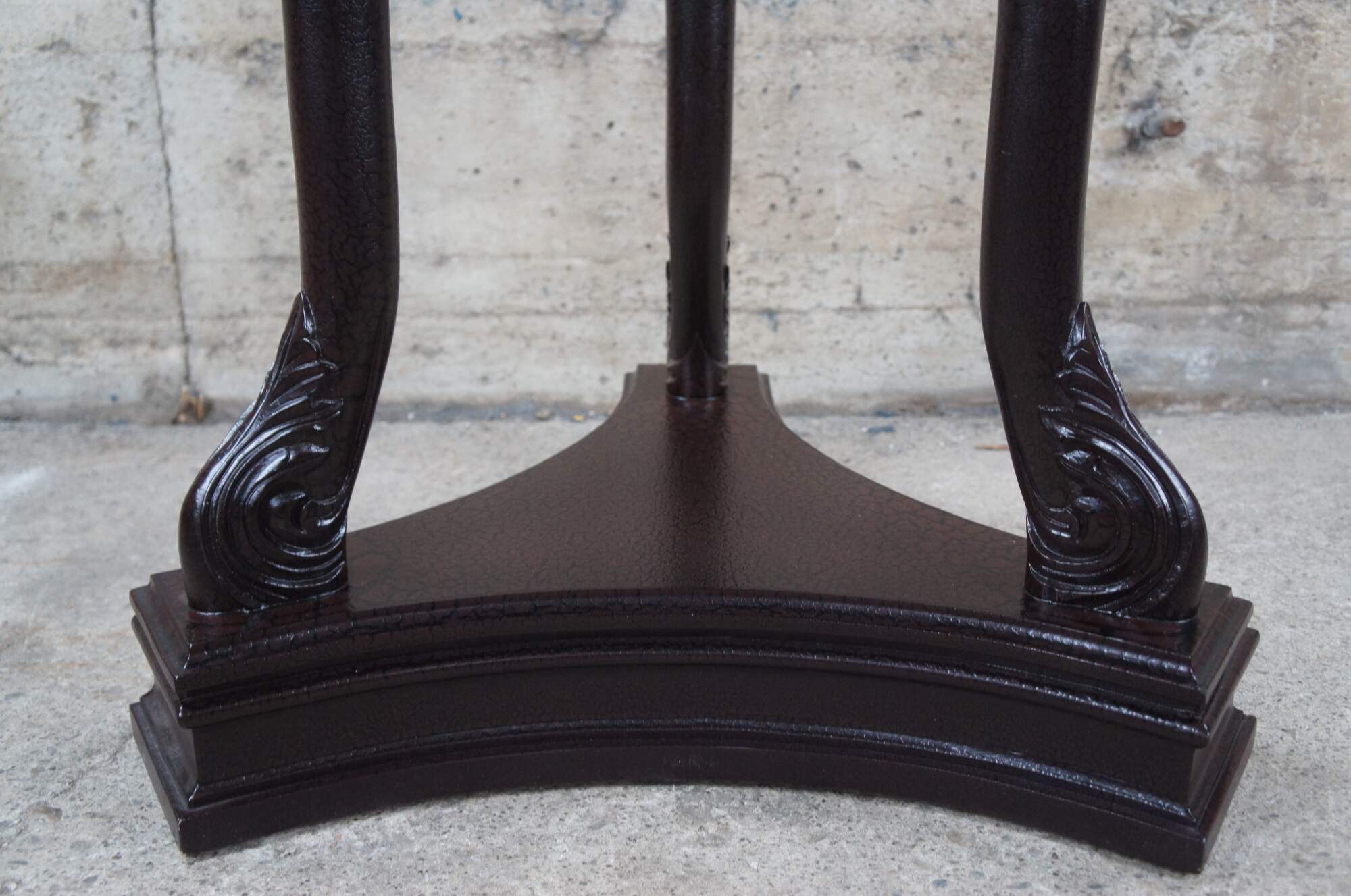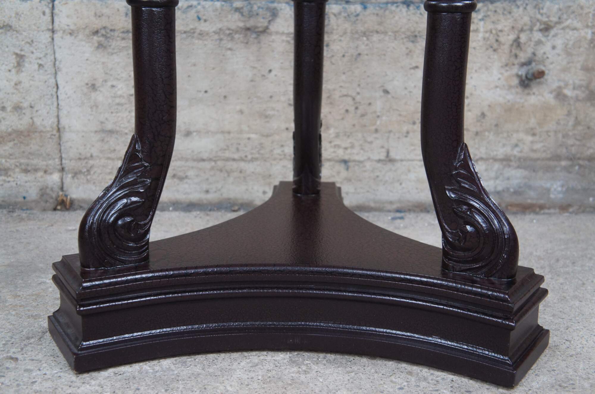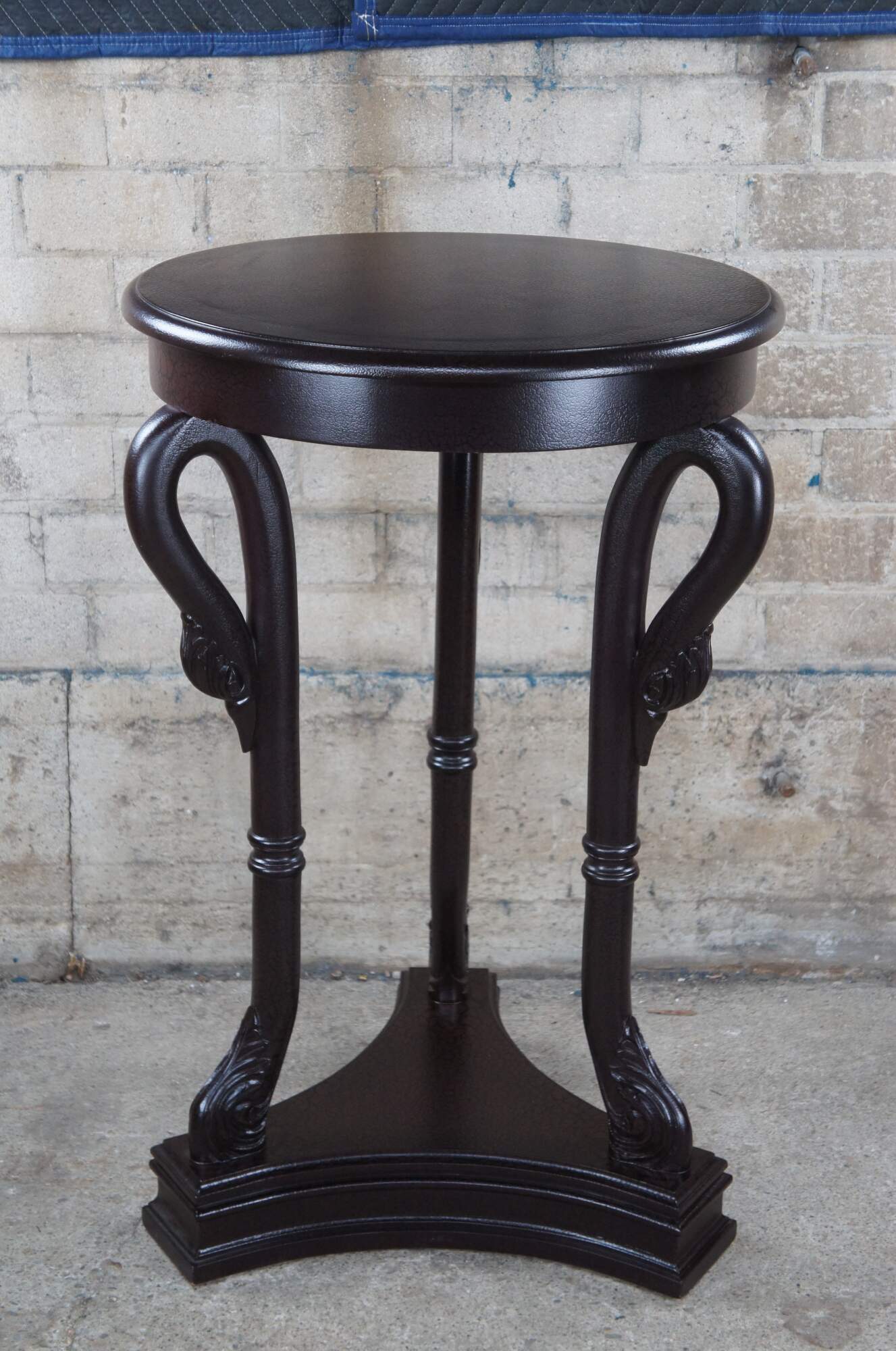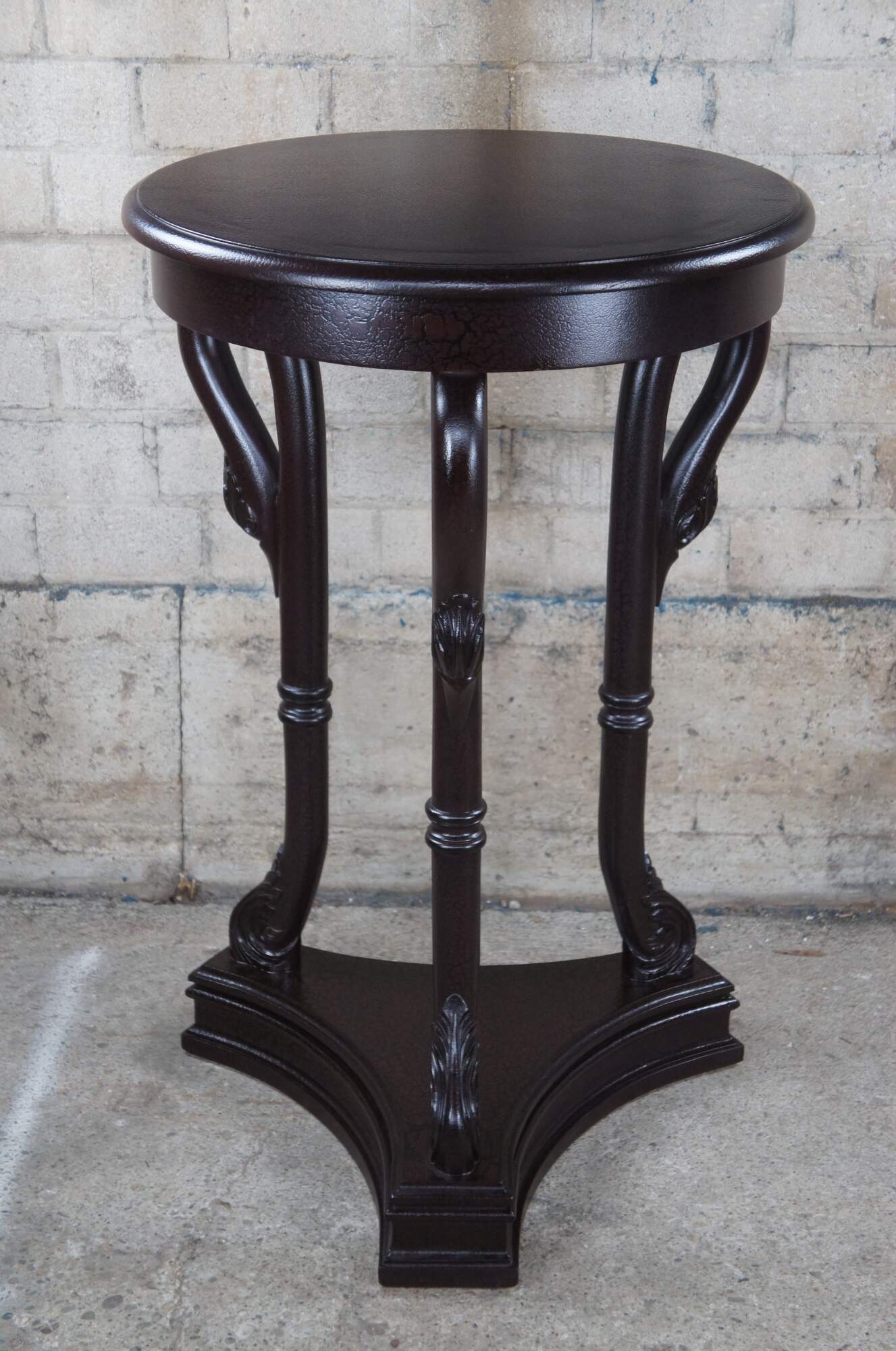 Stately French Directoire and Empire inspired Pedestal or Sculpture Stand. Made from hardwood with a crackle lacquer finish. Features three intricate downswept swan supports leading to an acanthus scrolled foot over a tripod base. Finish is a reddish brown with black crackle lines. The tables large stature allows for use as a pub bar table or stands out for display of any sculpture or plant.