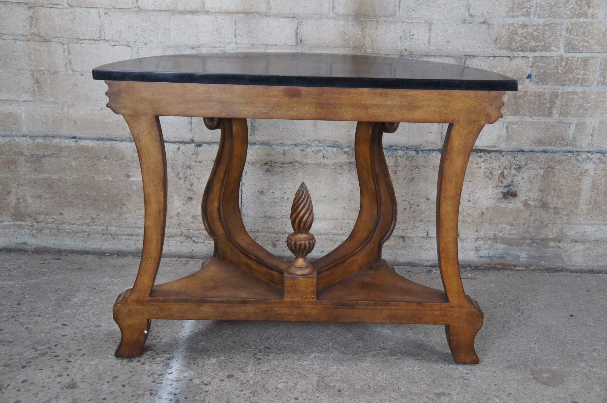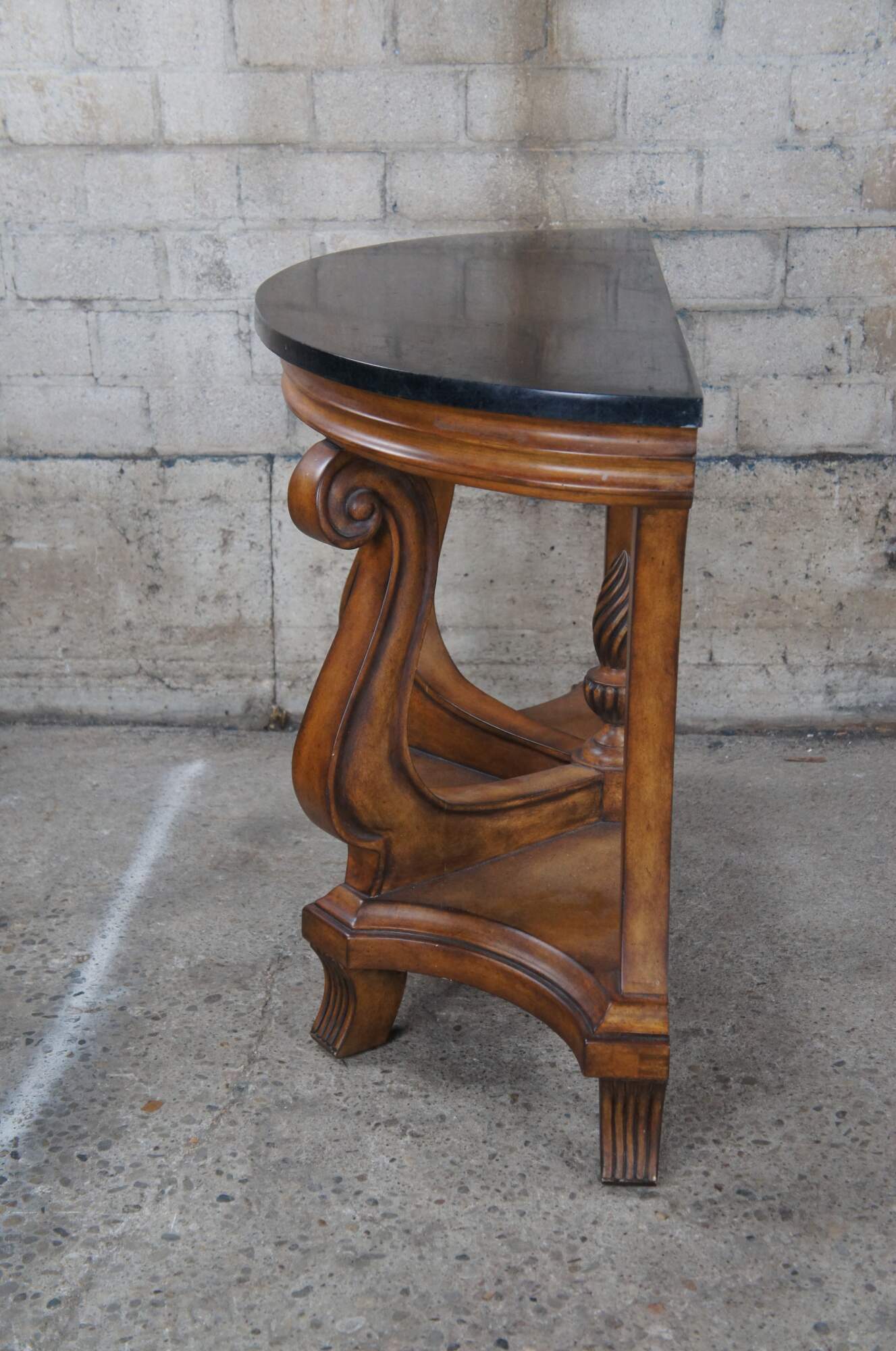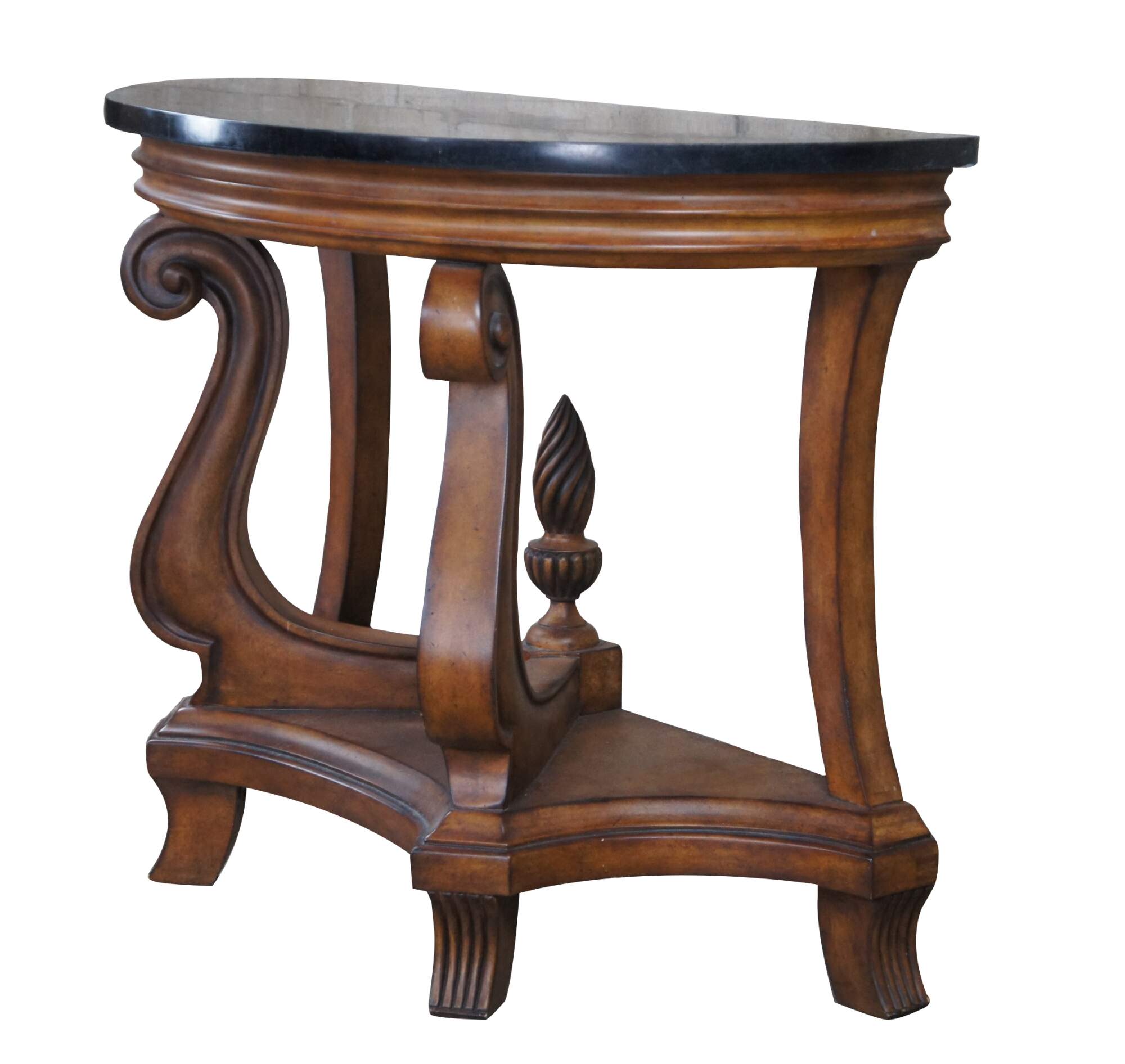 Traditional French inspired crescent shaped console table. Features a tessellated stone top and mahogany finish. The top is supported by cruved and scrolled supports with a central turned trophy finial. The table has curved and fluted feet.