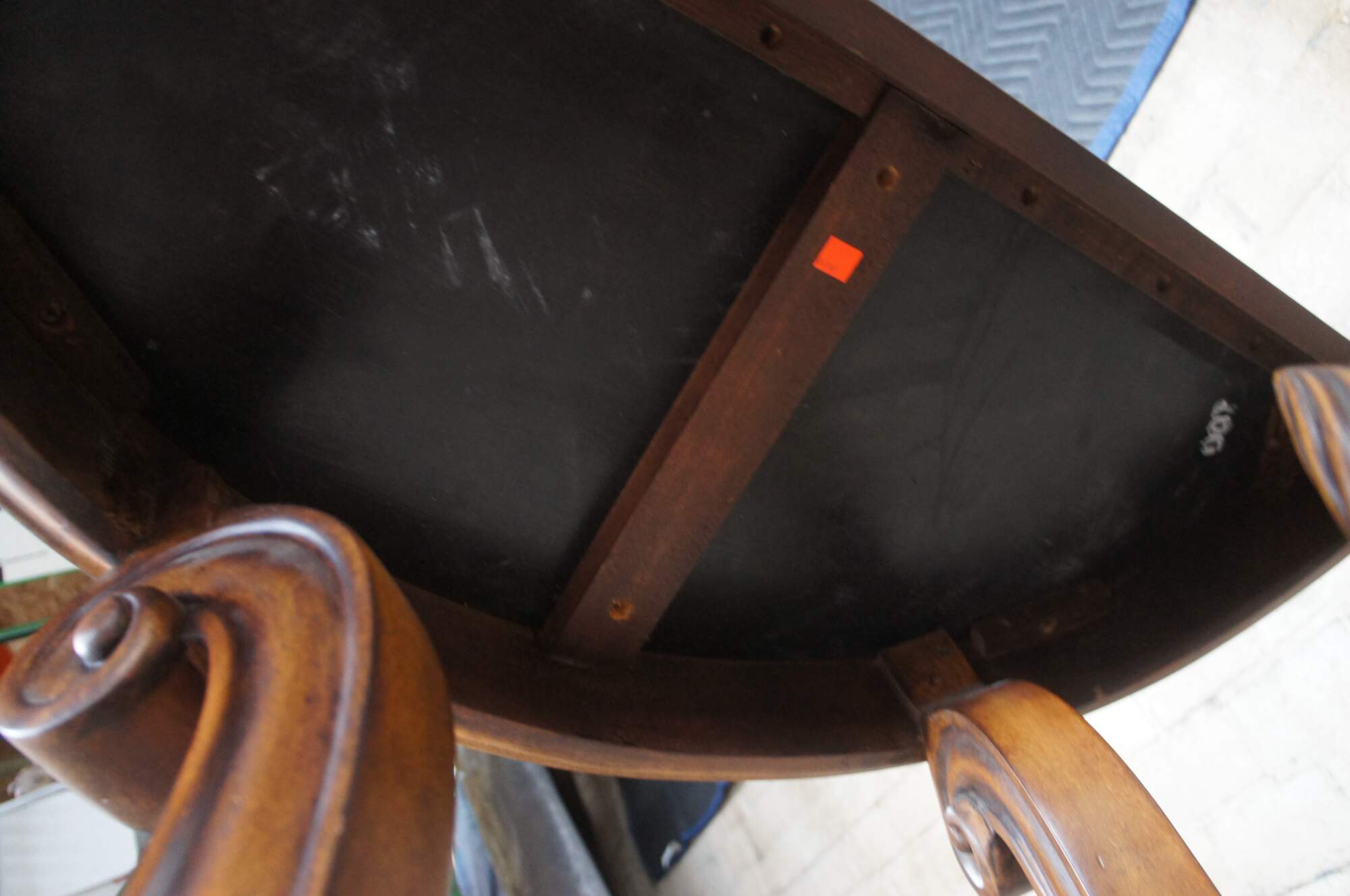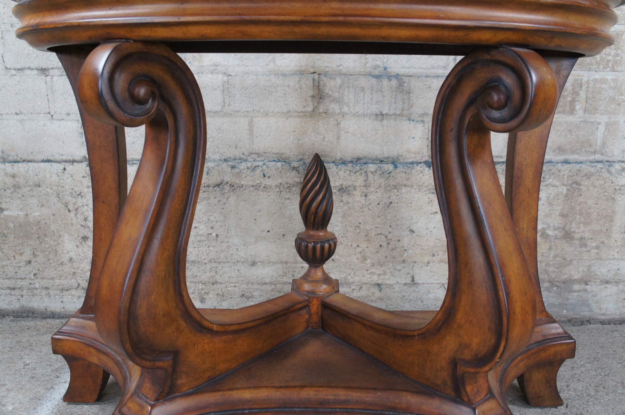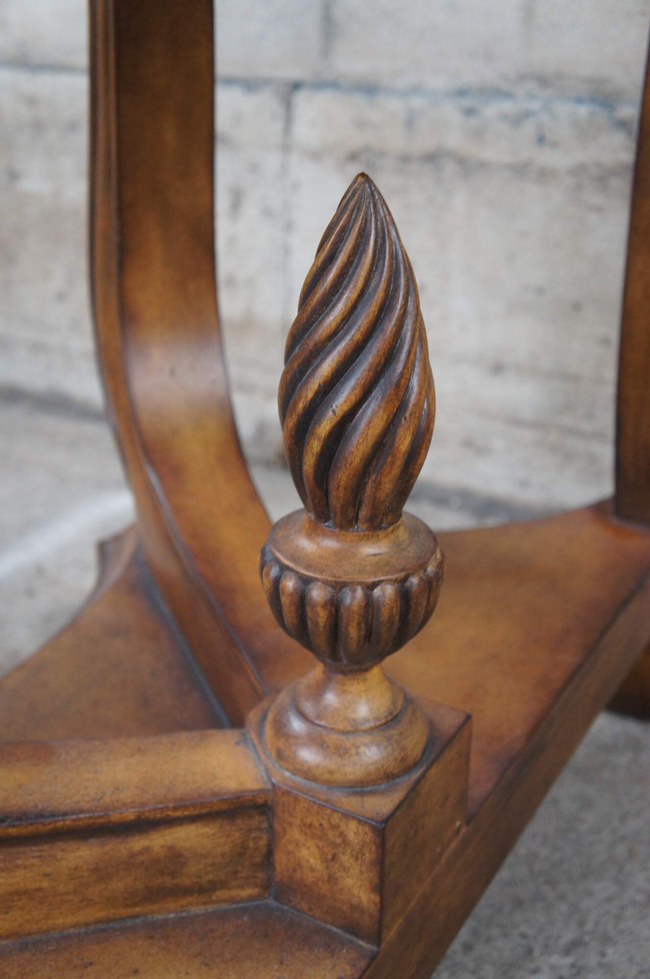 Traditional French inspired crescent shaped console table. Features a tessellated stone top and mahogany finish. The top is supported by cruved and scrolled supports with a central turned trophy finial. The table has curved and fluted feet.