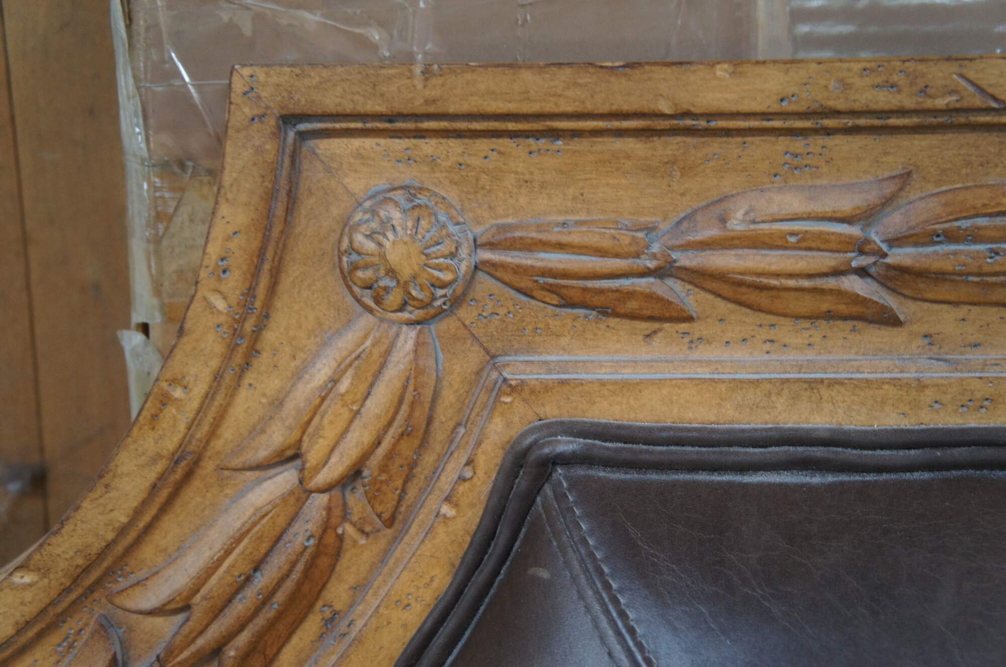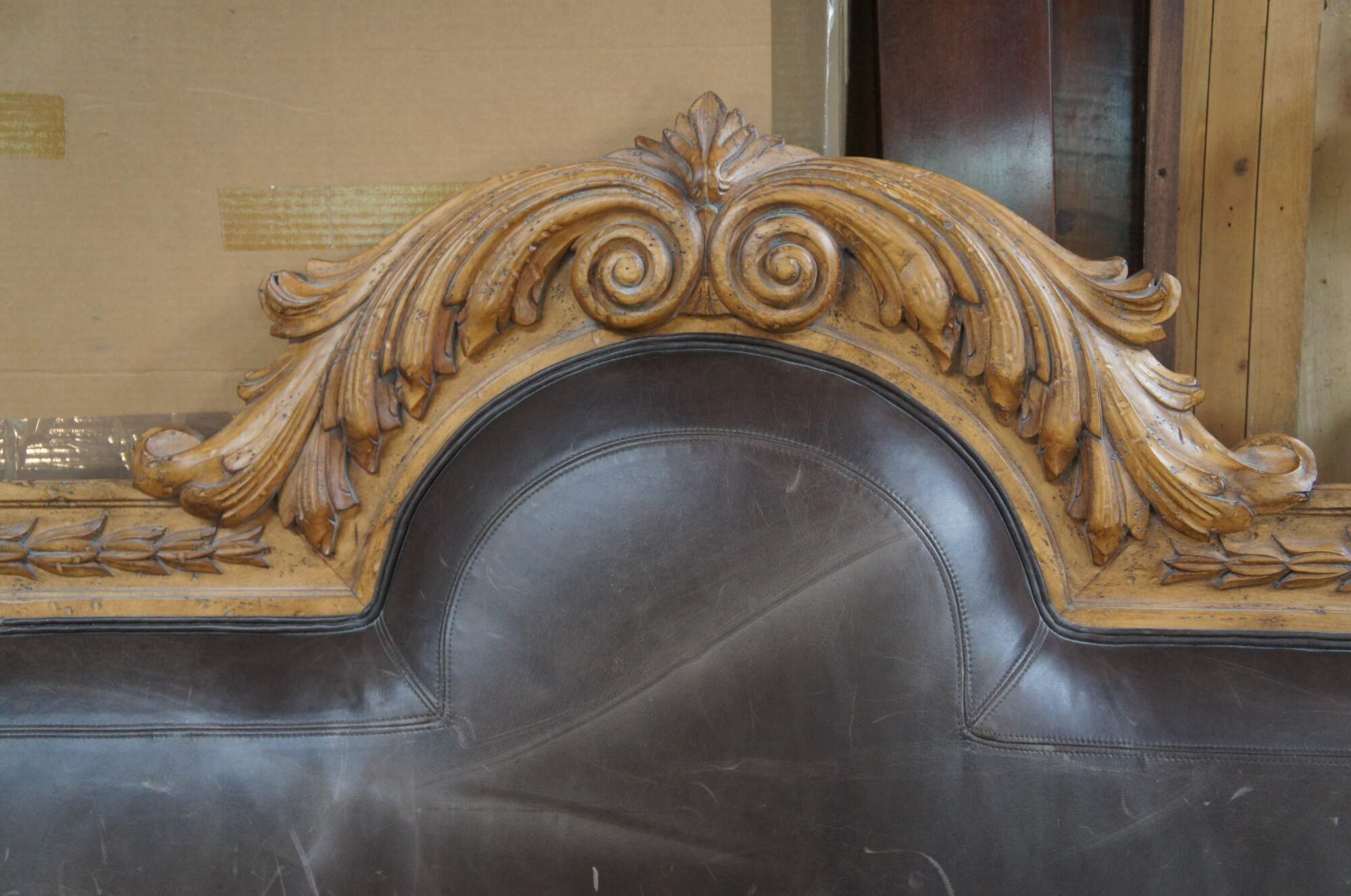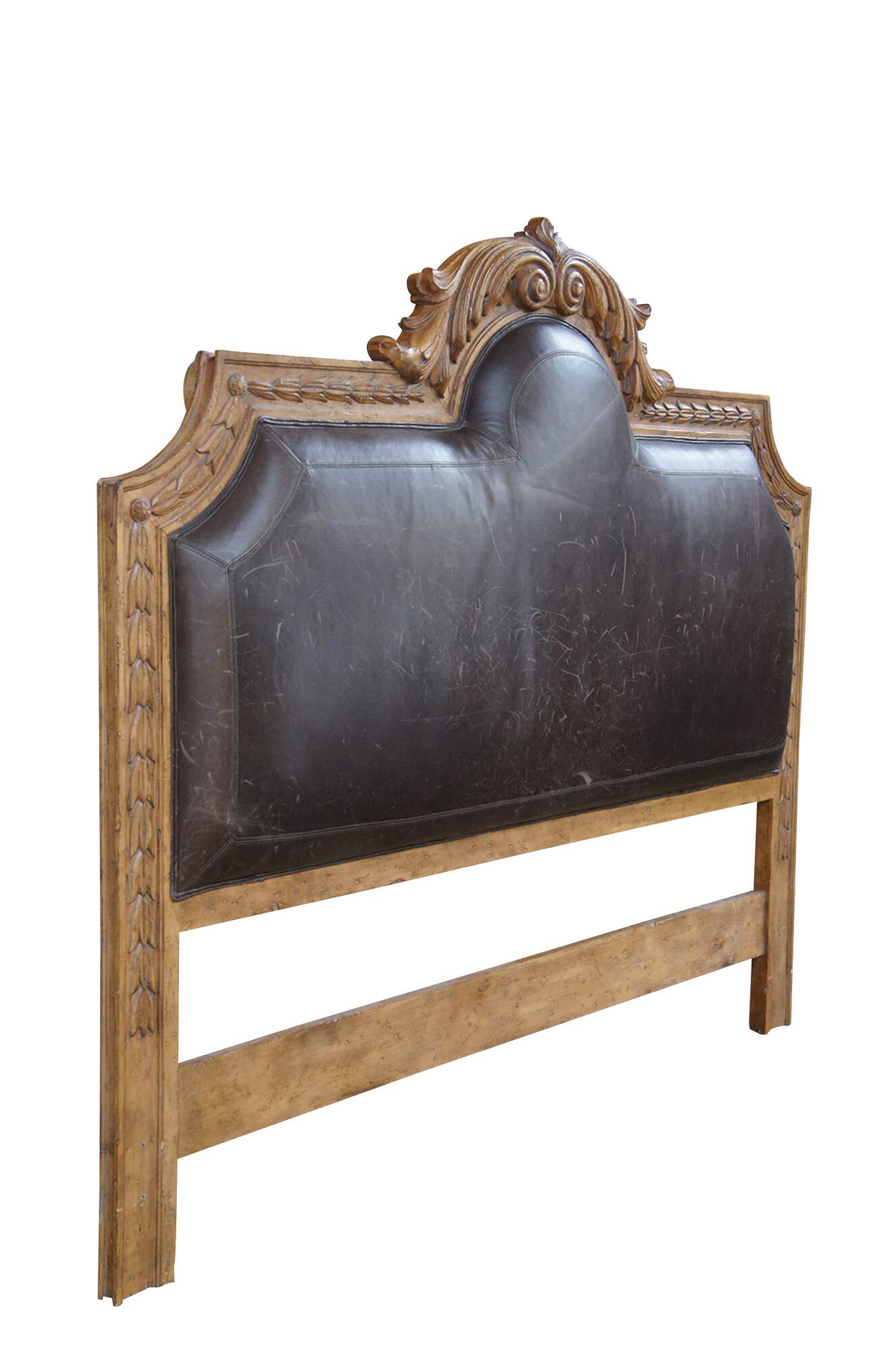 Vintage king size headboard featuring padded leather head rest and domed serpentine frame with French acanthus and tulip design.