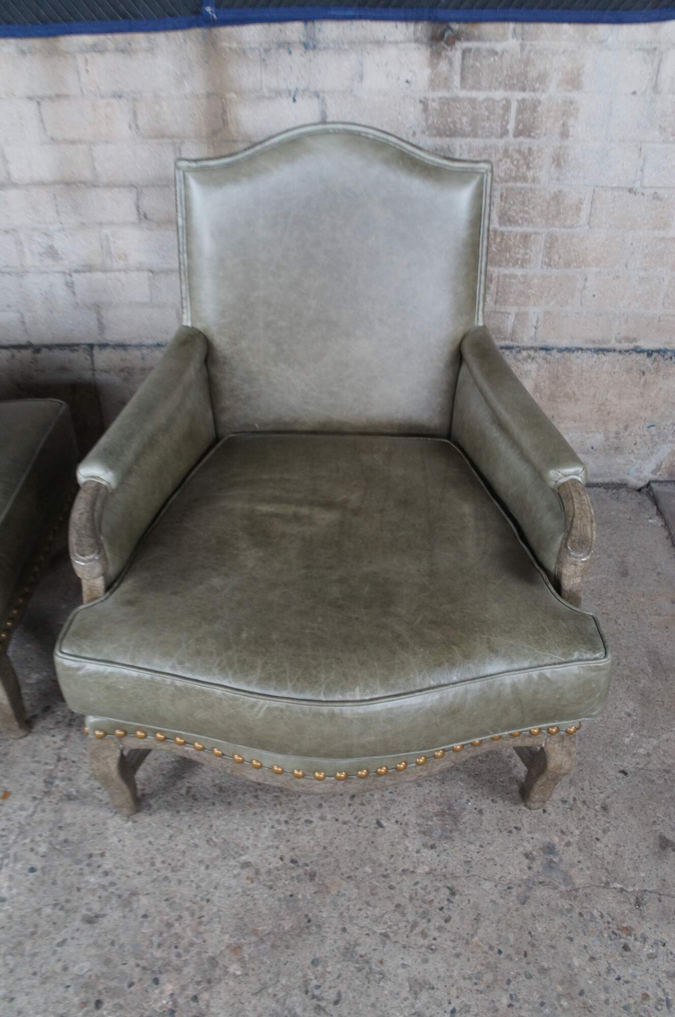 Vintage Dakota Bergere chair and ottoman by Hammer Fine Furniture. Featuring French styling with Tuscan Field Green Leather and Brixton Crackle finish frame with nailhead trim. Made for Joseph Interiors of North Palm Beach Florida.