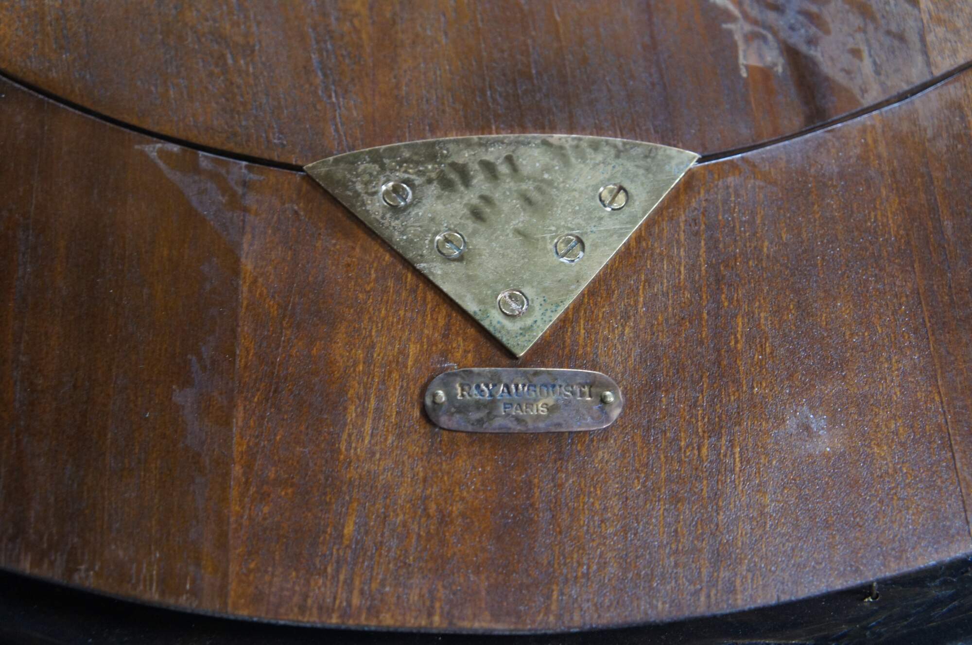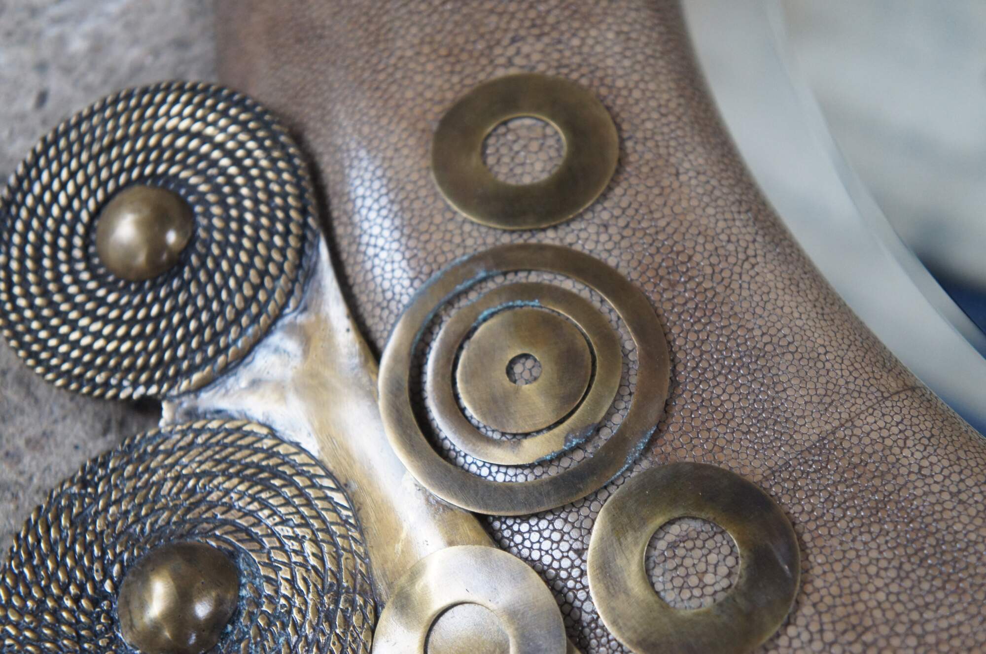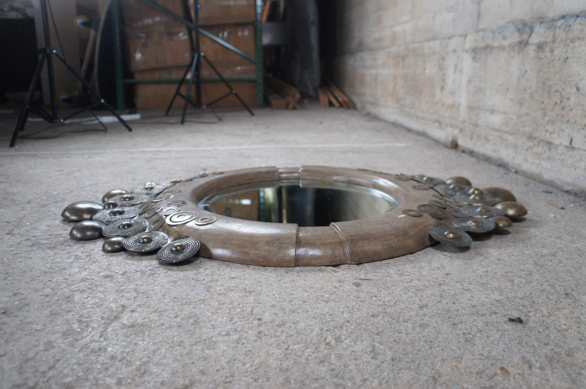 Vintage Atlantis mirror by Ria and Youri Augousti (French). Features brass patinated copper / metal and shagreen leather with layered textured and patterned geometric circles. Made in Paris France.