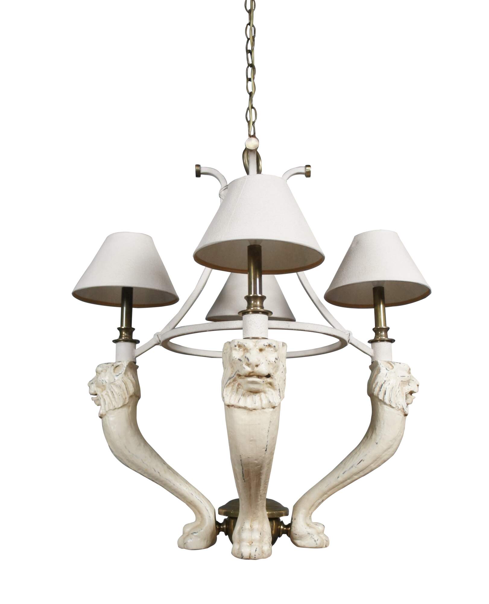 Vintage Hart Associates four light chandelier featuring white painted iron frame with brass candlesticks and trophy finial with composite lion head arms / legs and claw / paw feet.