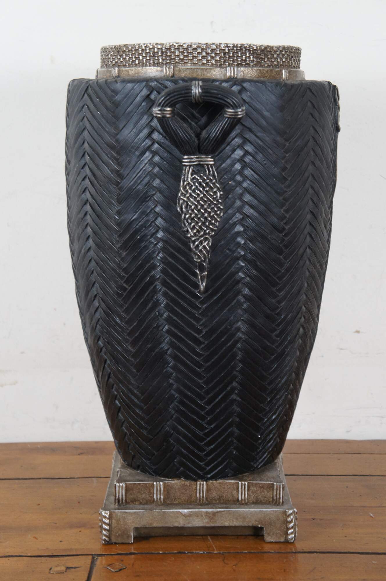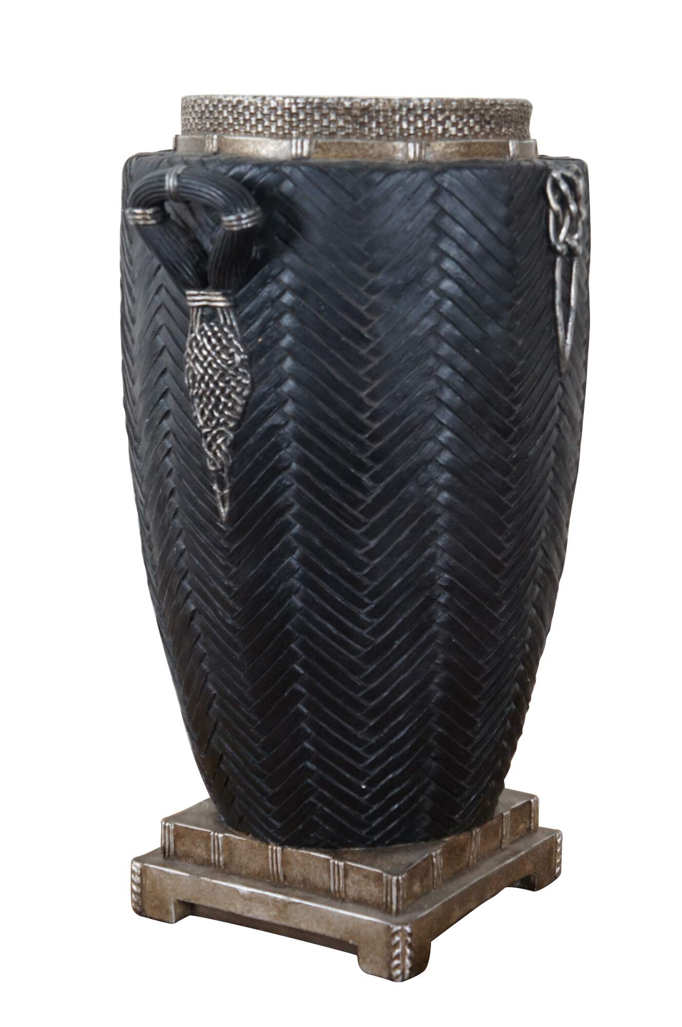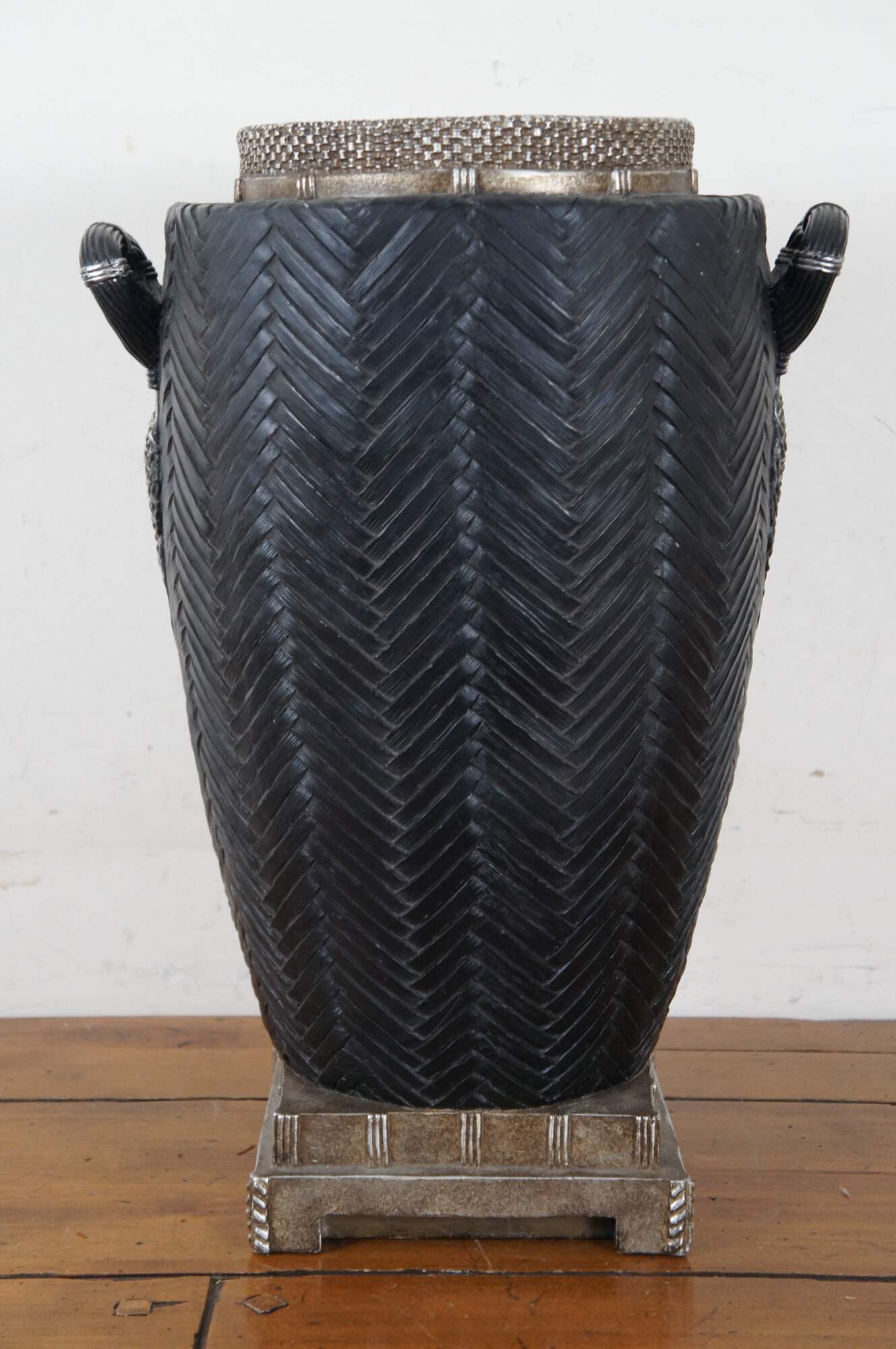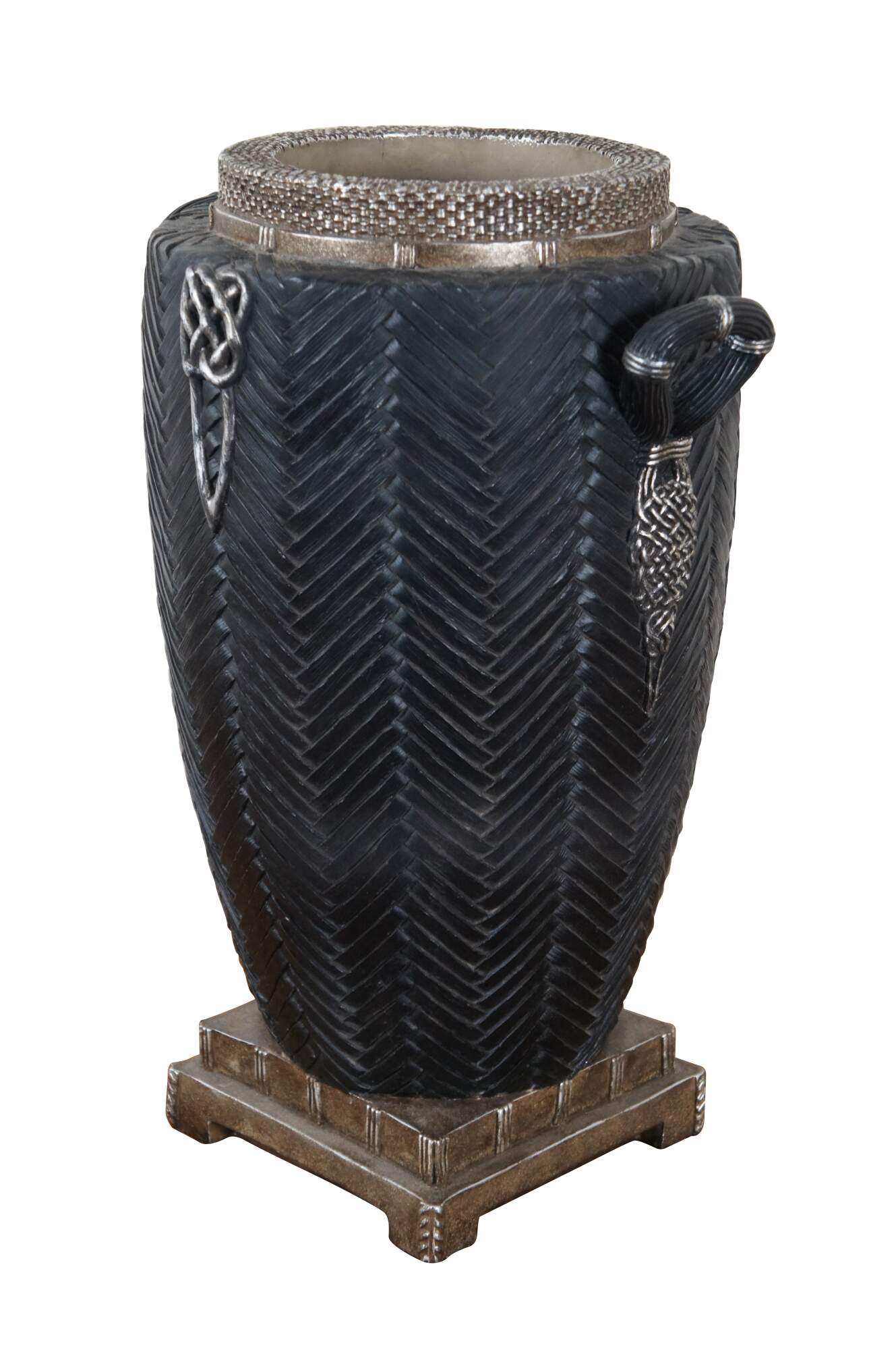Vintage composite / resin floor vase in the shape of a trophy urn on a light bronze colored, square, tiered base and matching upper rim. The body sports a black herringbone basket weave texture and two handles, decorated with applied pieces of knot work in silver.
