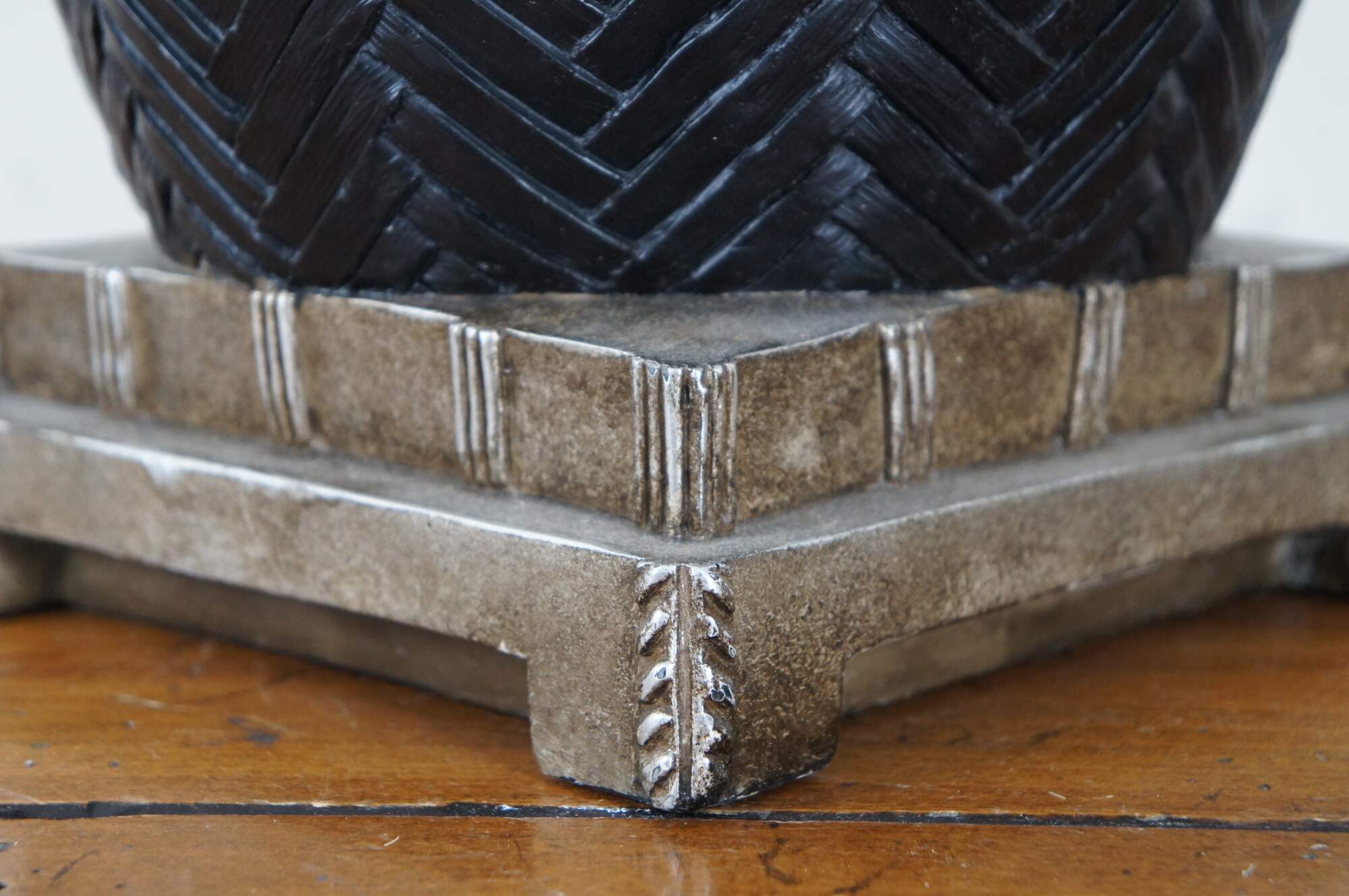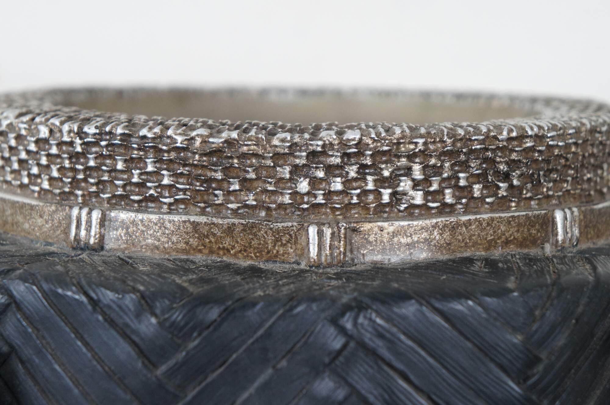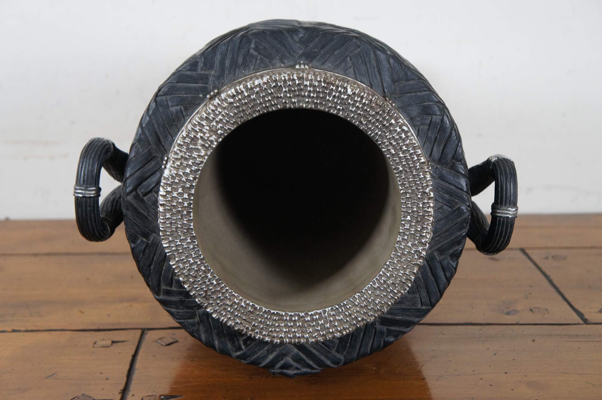 Vintage composite / resin floor vase in the shape of a trophy urn on a light bronze colored, square, tiered base and matching upper rim. The body sports a black herringbone basket weave texture and two handles, decorated with applied pieces of knot work in silver.
