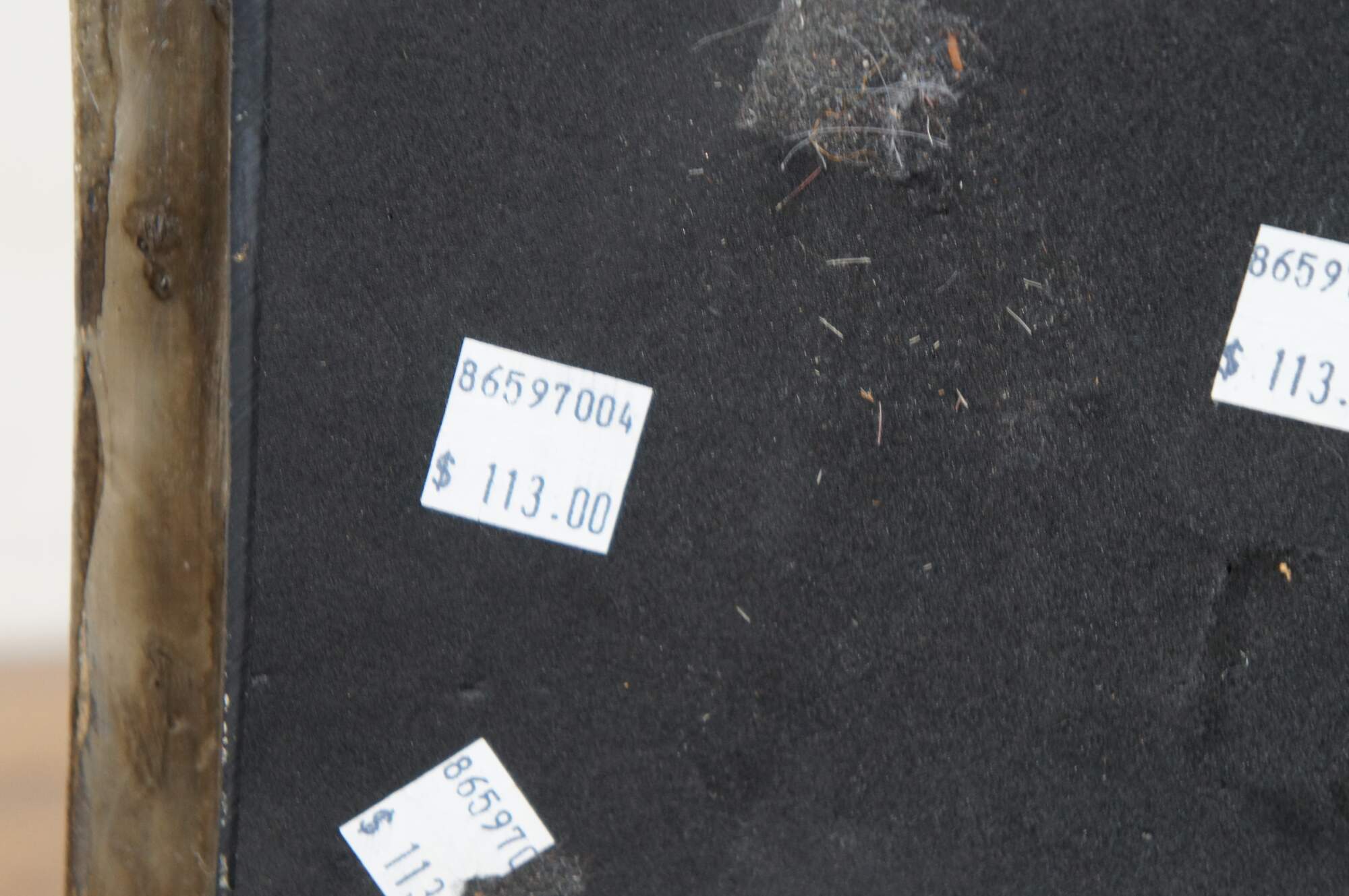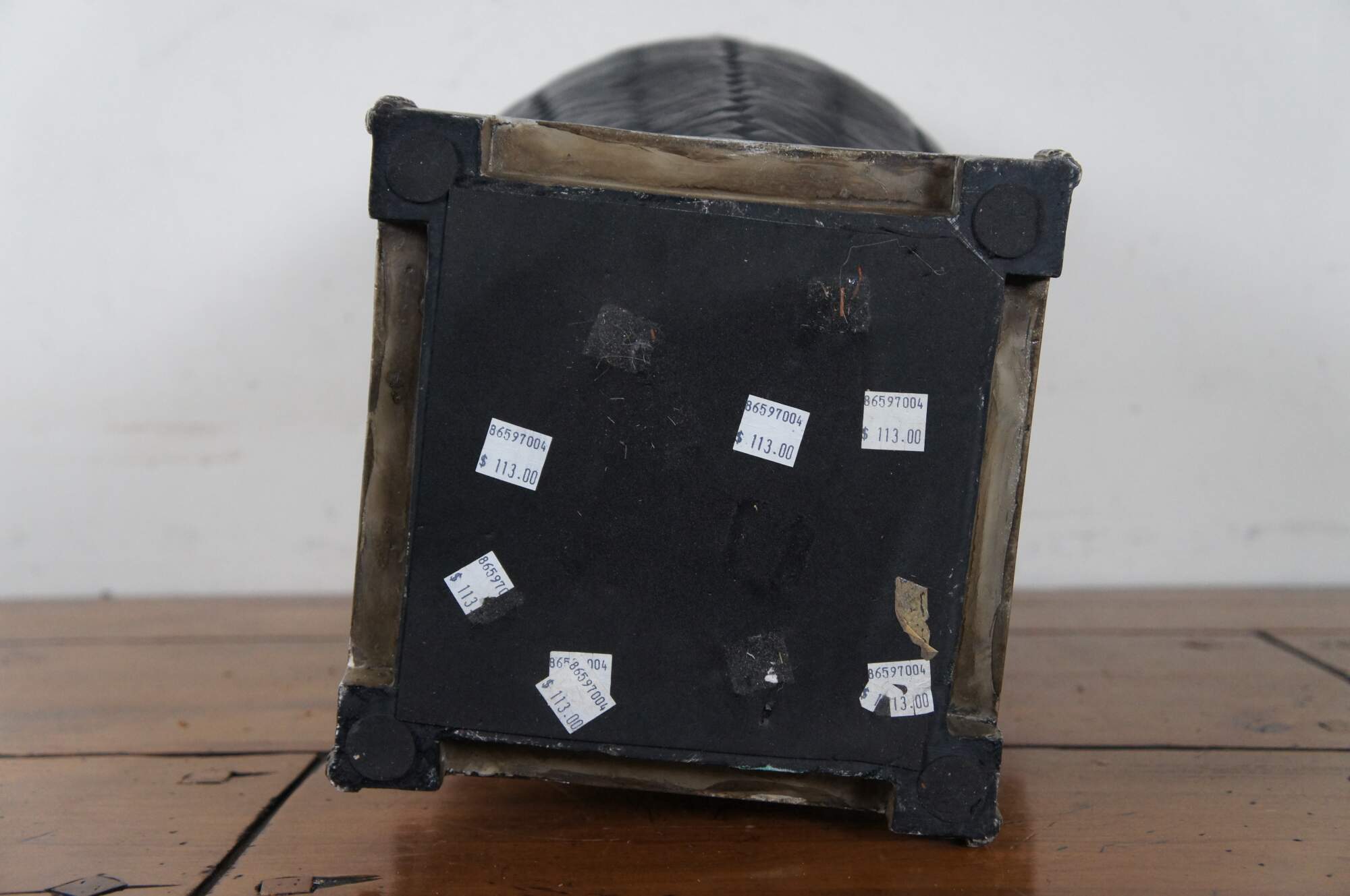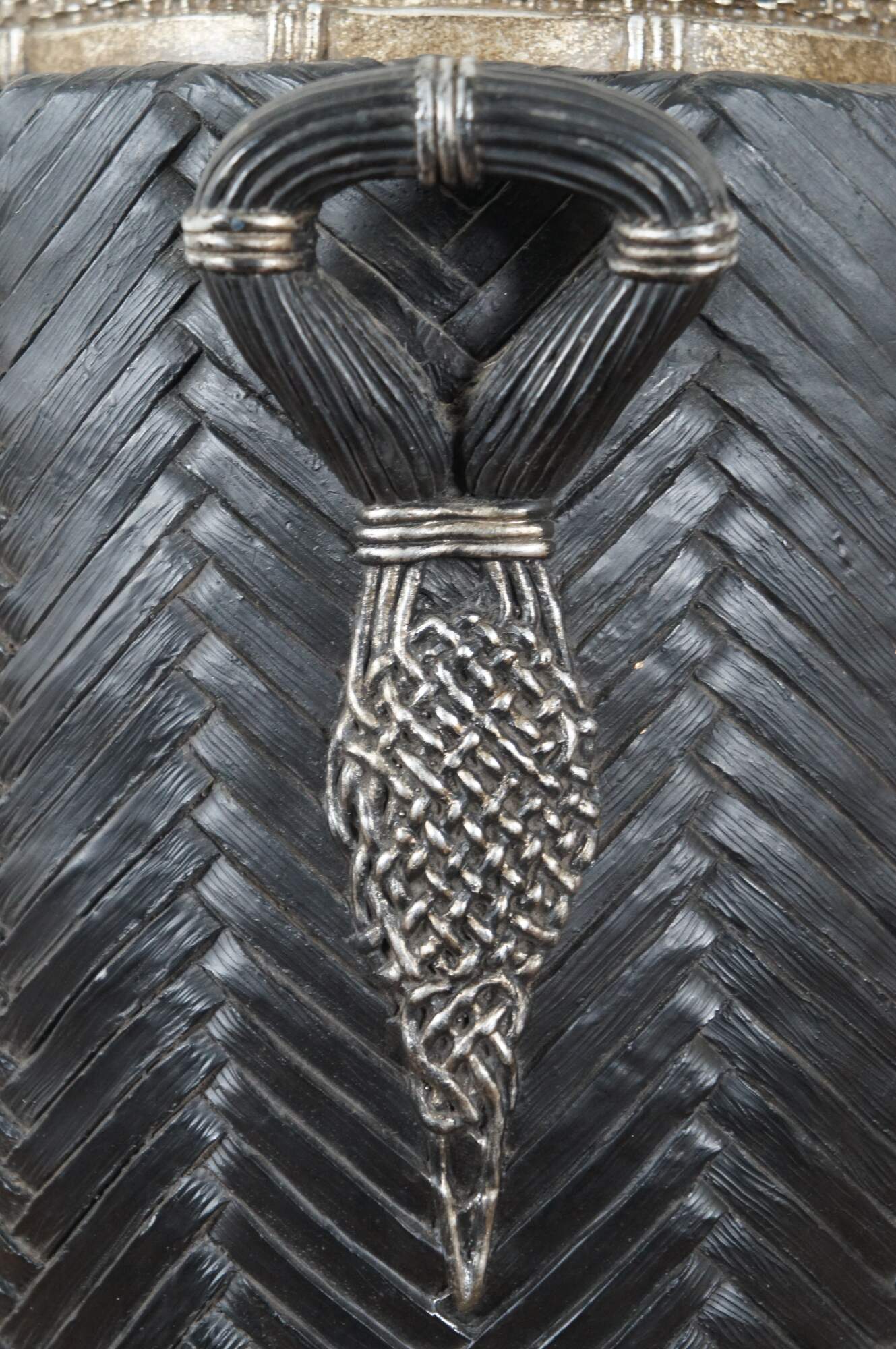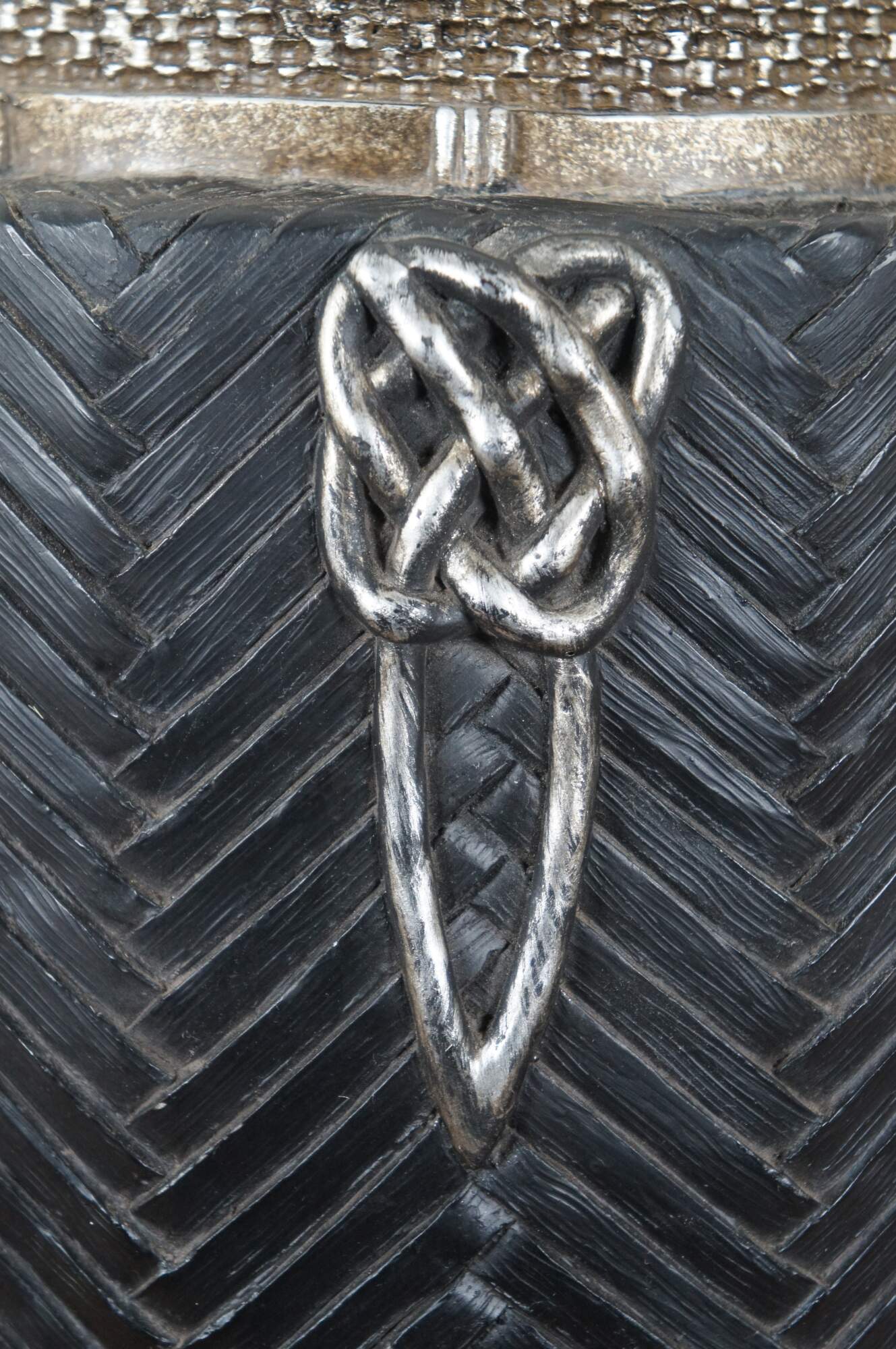 Vintage composite / resin floor vase in the shape of a trophy urn on a light bronze colored, square, tiered base and matching upper rim. The body sports a black herringbone basket weave texture and two handles, decorated with applied pieces of knot work in silver.