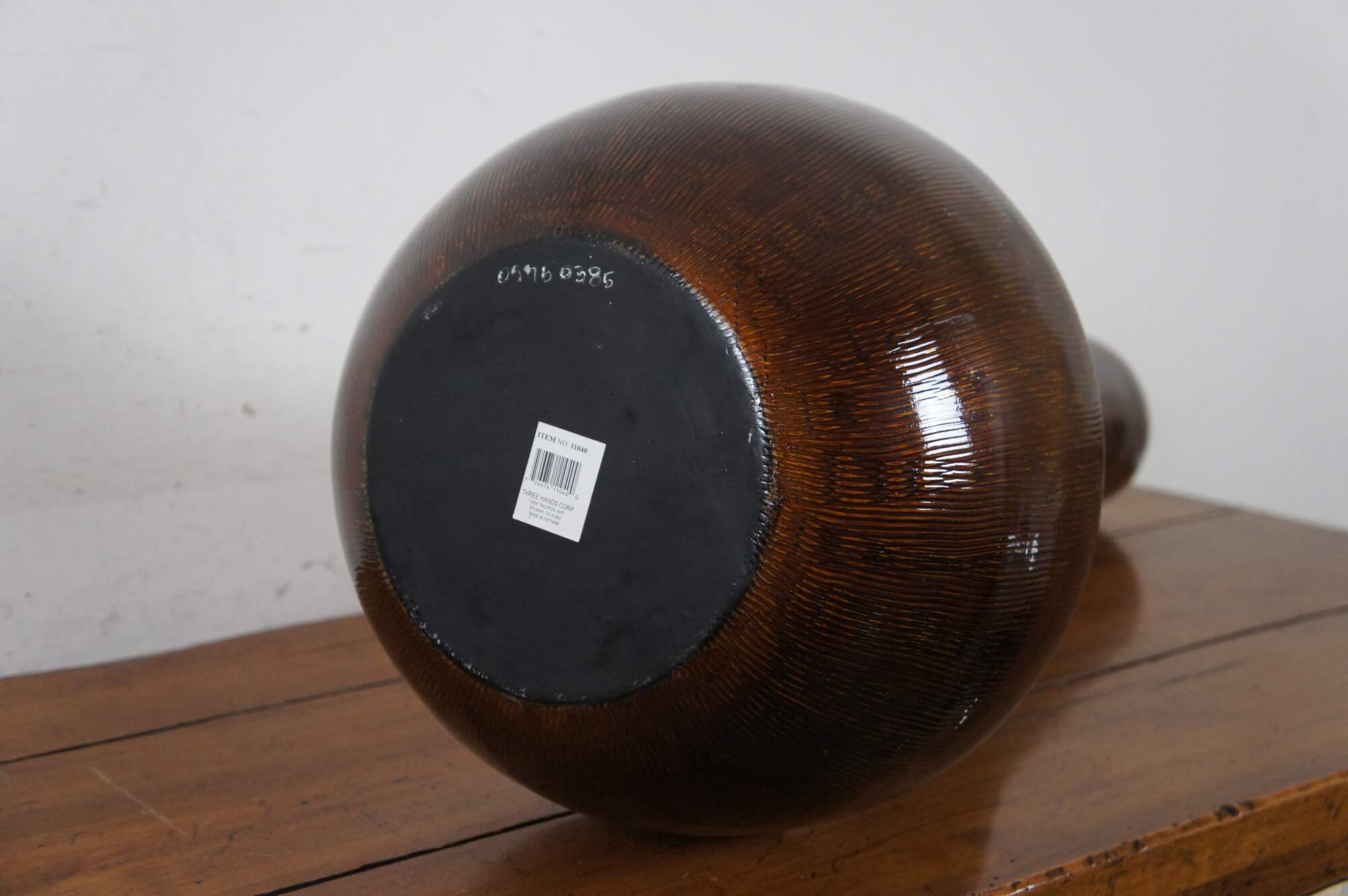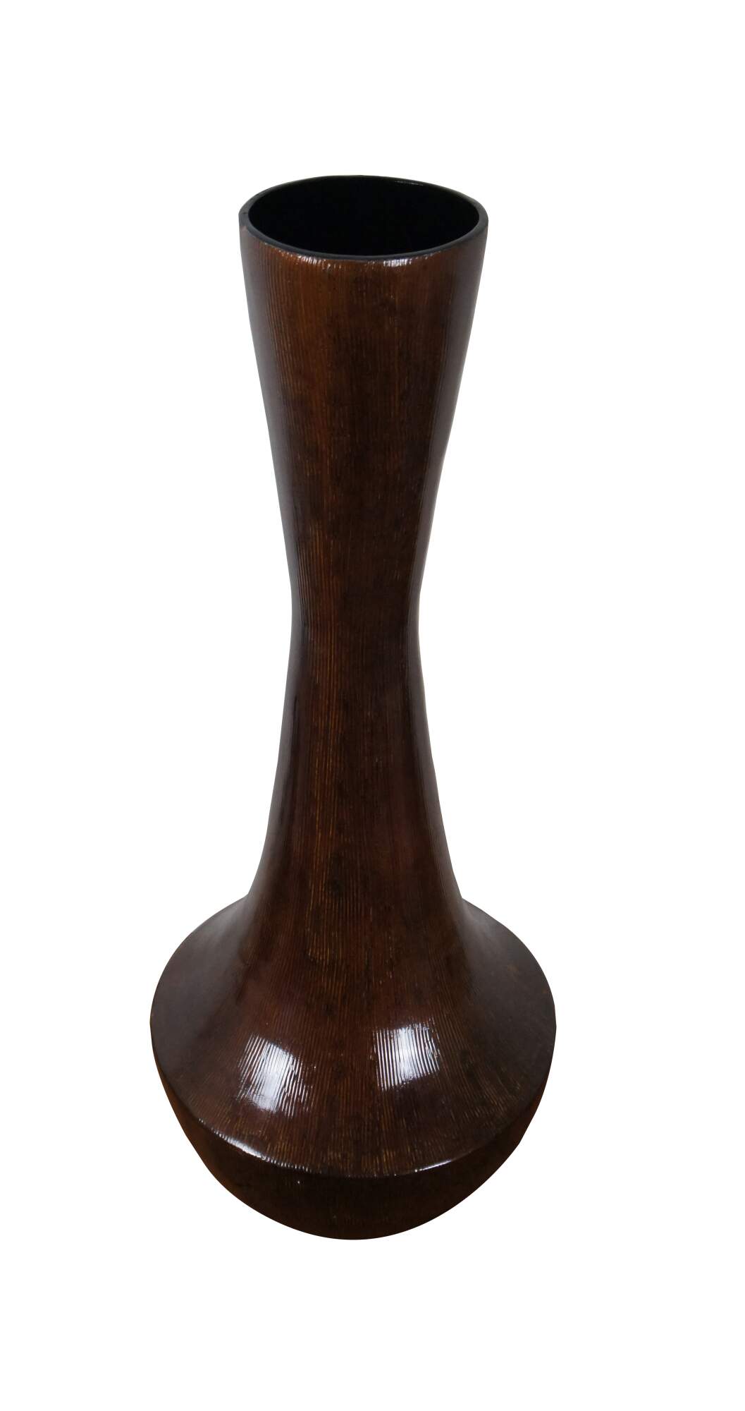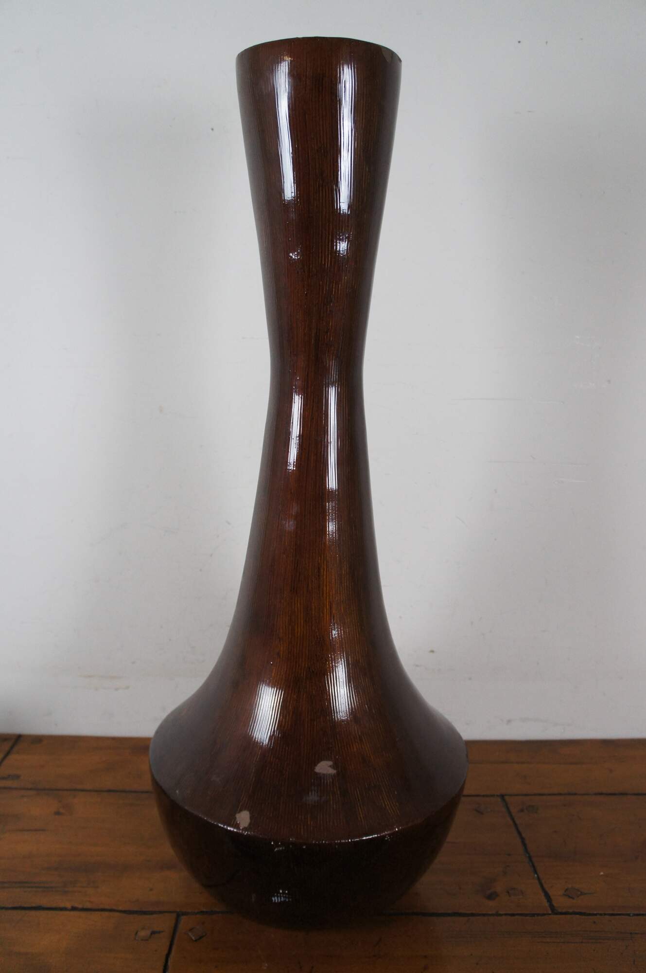 Vintage floor vase featuring a mid-century modern inspired shape -a wide half-round base sweeping up into a cinched / tapered column. Light composite body with a glossy lacquered finish in mottled shades of brown and a finely ridged / fluted texture, evocative of carved wood. Black lacquer interior. Produced by the Three Hands Corporation. Bottom marked 05750385. Item No. 11040. Made in Vietnam.