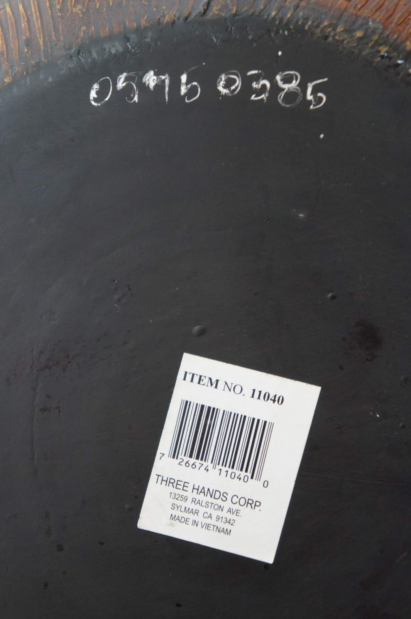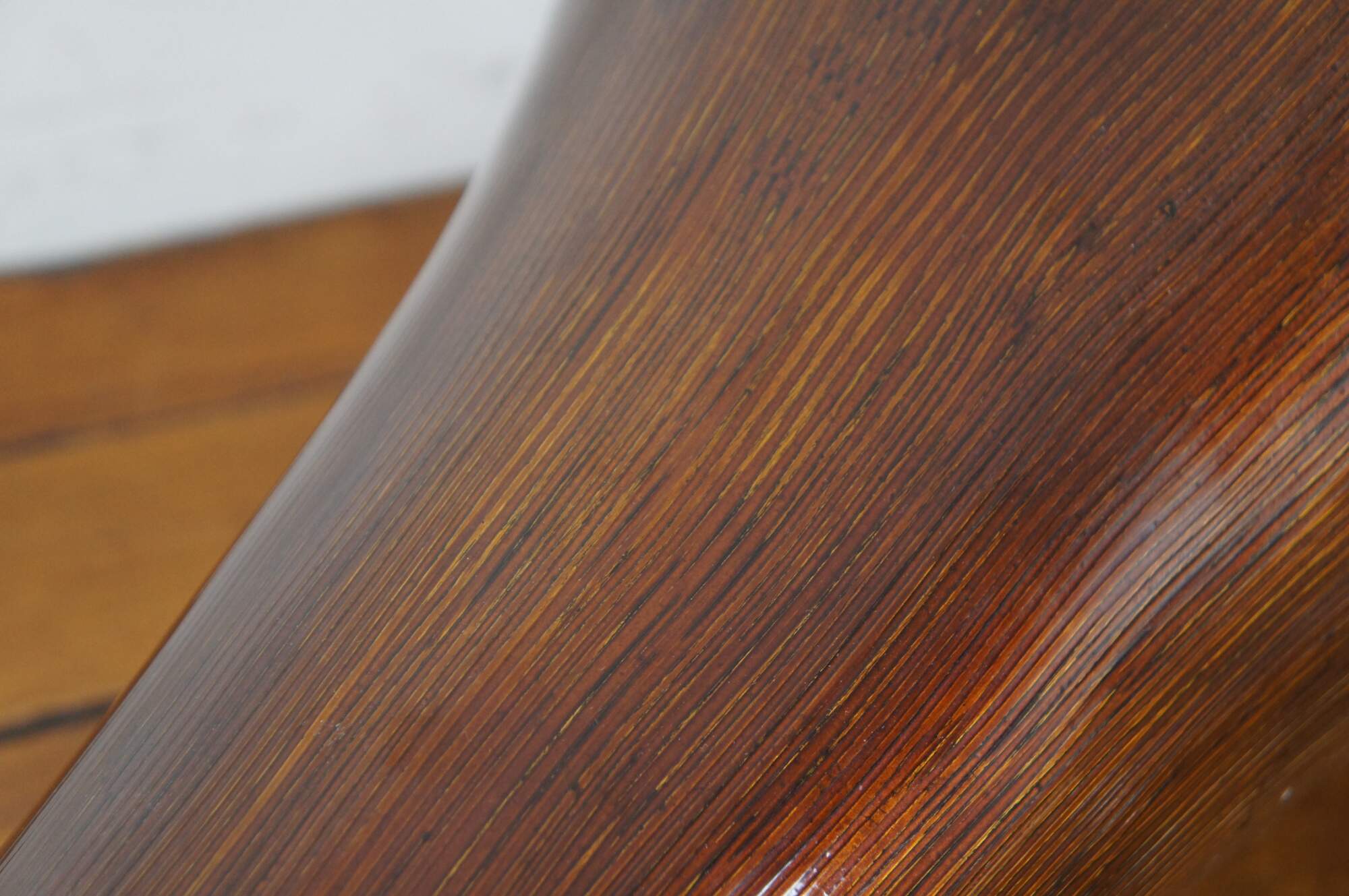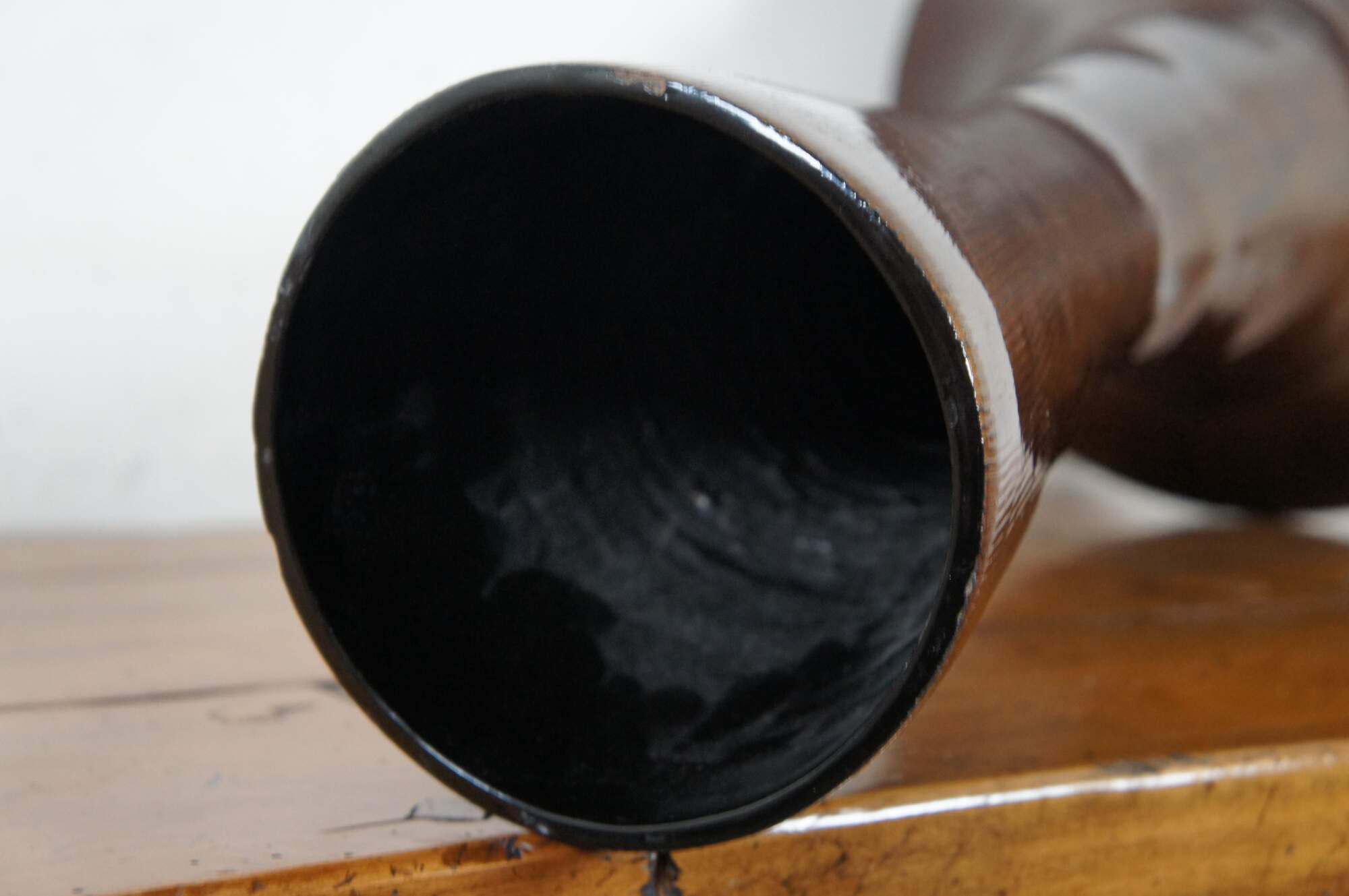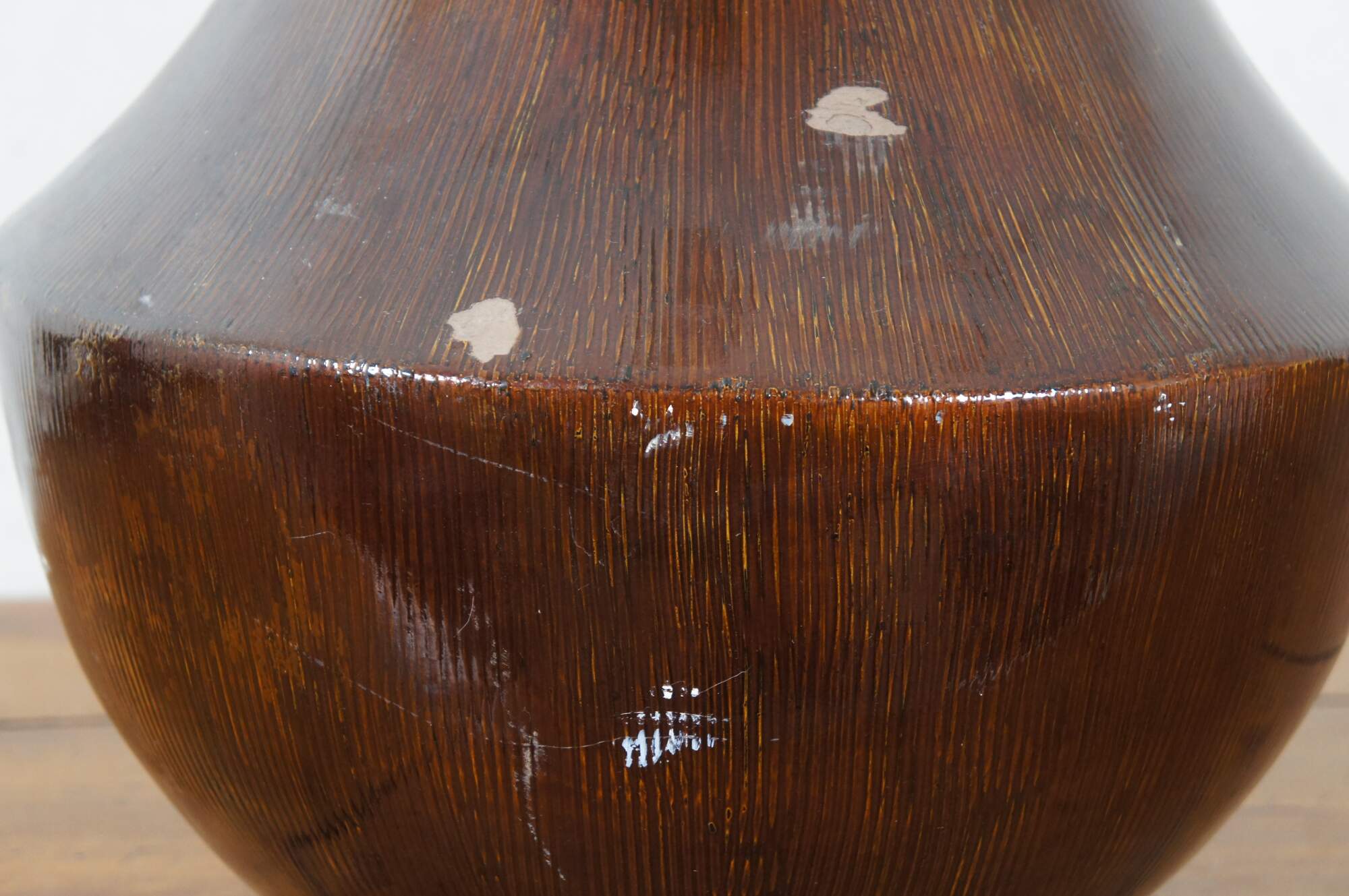 Vintage floor vase featuring a mid-century modern inspired shape -a wide half-round base sweeping up into a cinched / tapered column. Light composite body with a glossy lacquered finish in mottled shades of brown and a finely ridged / fluted texture, evocative of carved wood. Black lacquer interior. Produced by the Three Hands Corporation. Bottom marked 05750385. Item No. 11040. Made in Vietnam.
