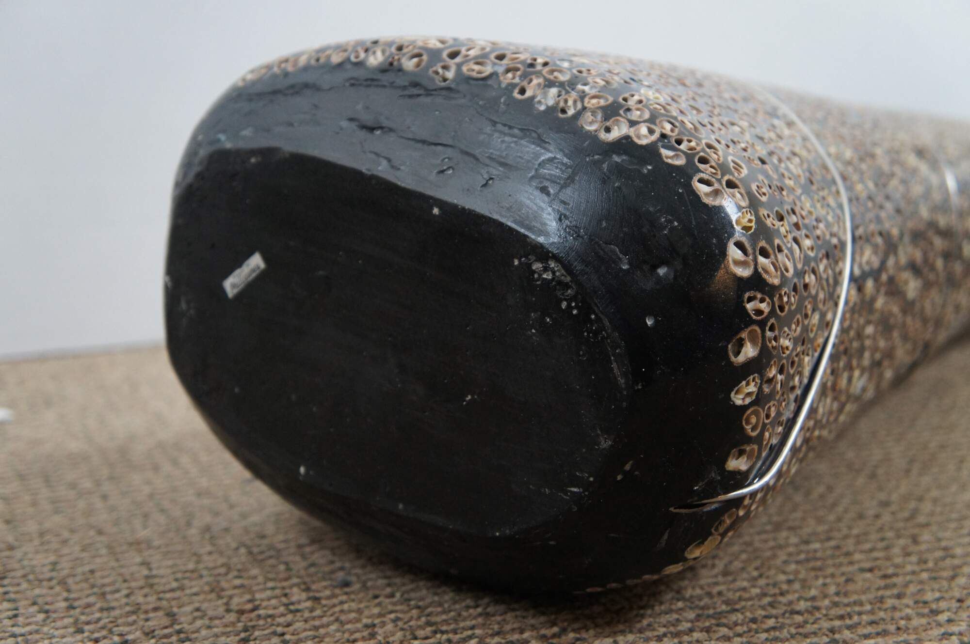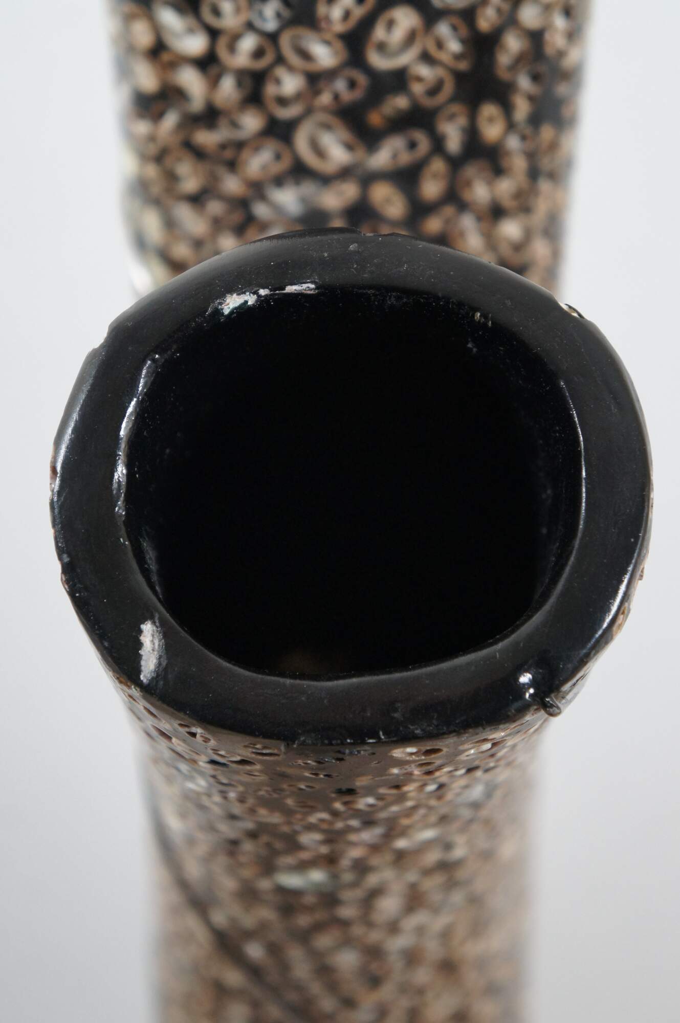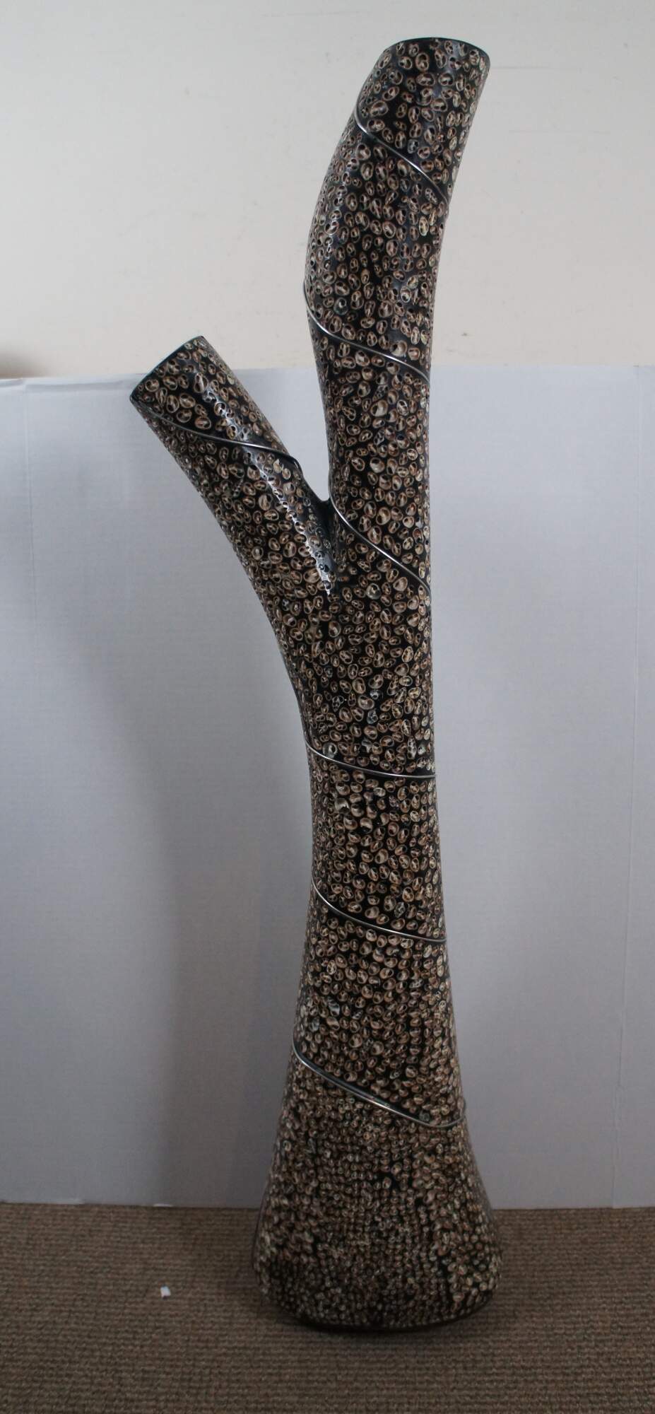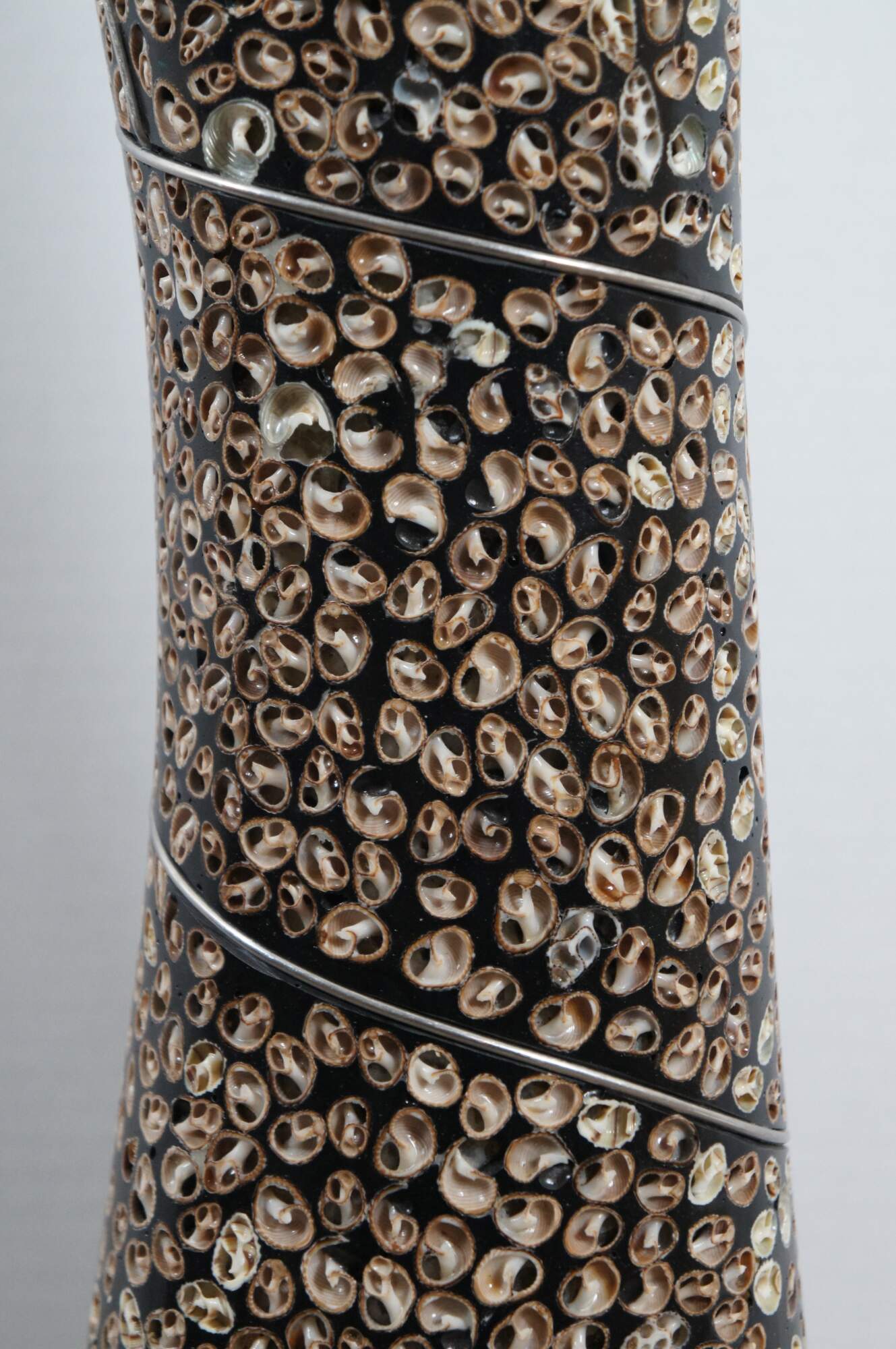 Vintage tree or giant coral shaped floor vase crafted of composite / resin finished in black lacquer, thoroughly embedded with small sea shells, their exteriors ground flush with the surface to reveal the chambers inside. Wrapped with a lightly embedded silver toned wire. Made in the Philippines.