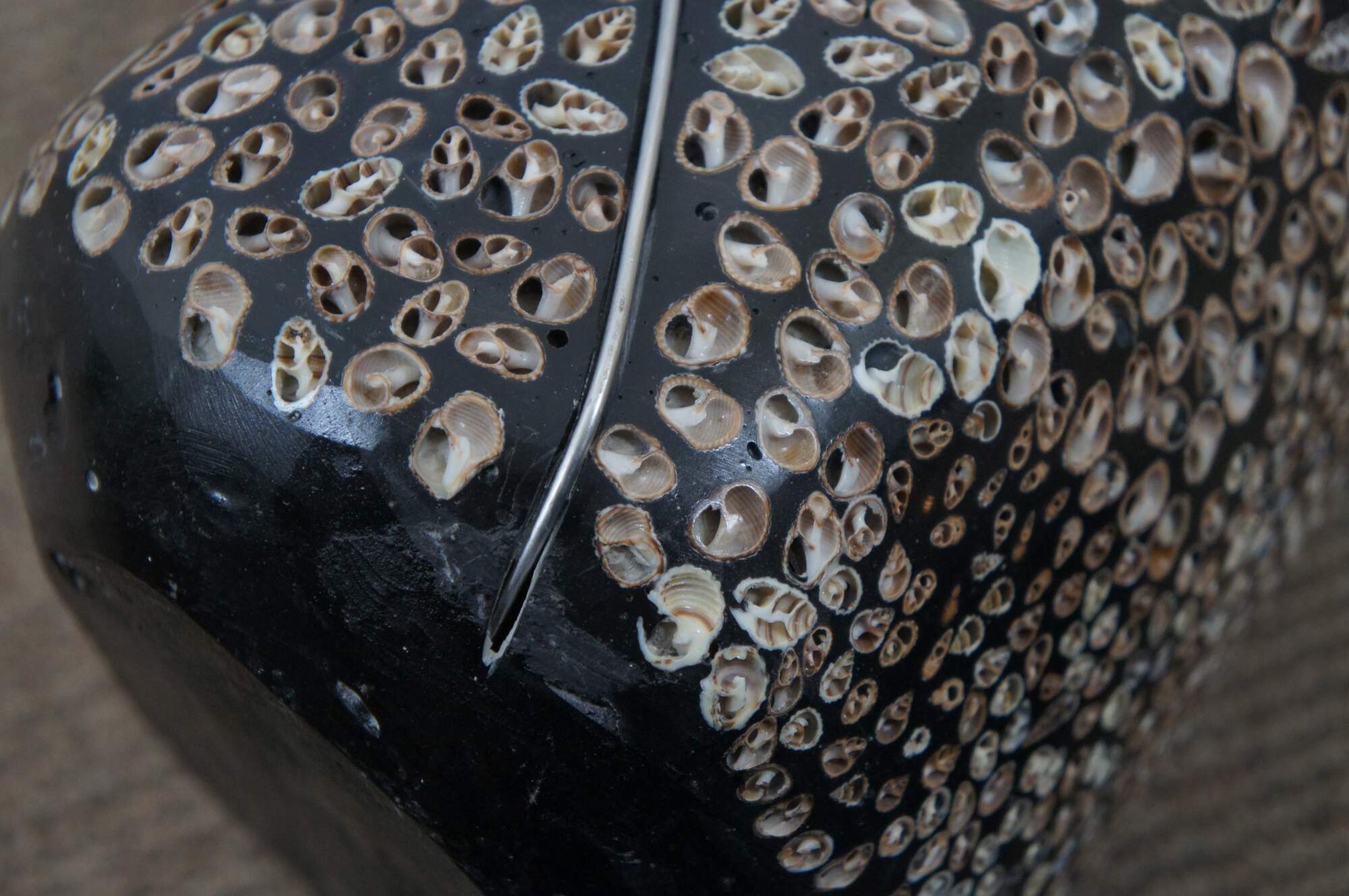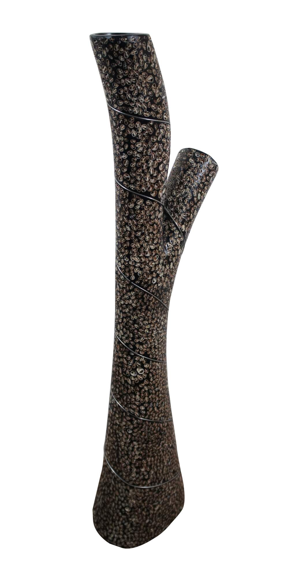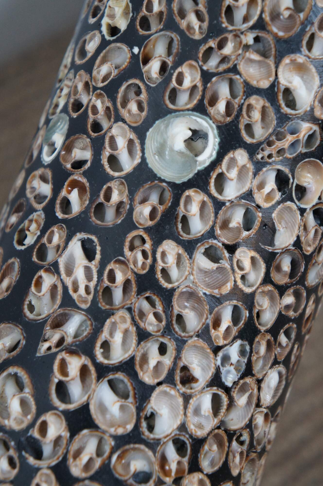 Vintage tree or giant coral shaped floor vase crafted of composite / resin finished in black lacquer, thoroughly embedded with small sea shells, their exteriors ground flush with the surface to reveal the chambers inside. Wrapped with a lightly embedded silver toned wire. Made in the Philippines.