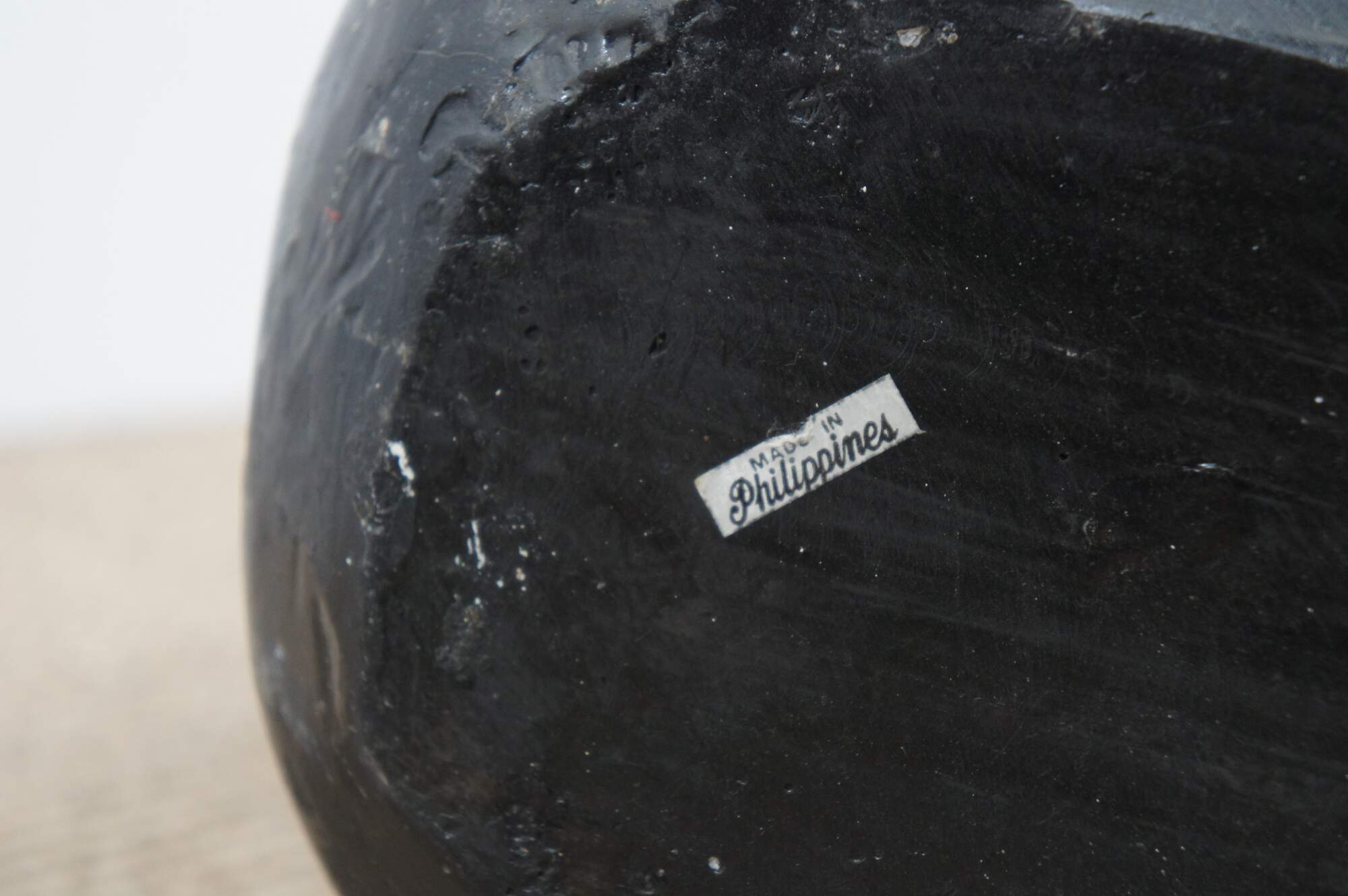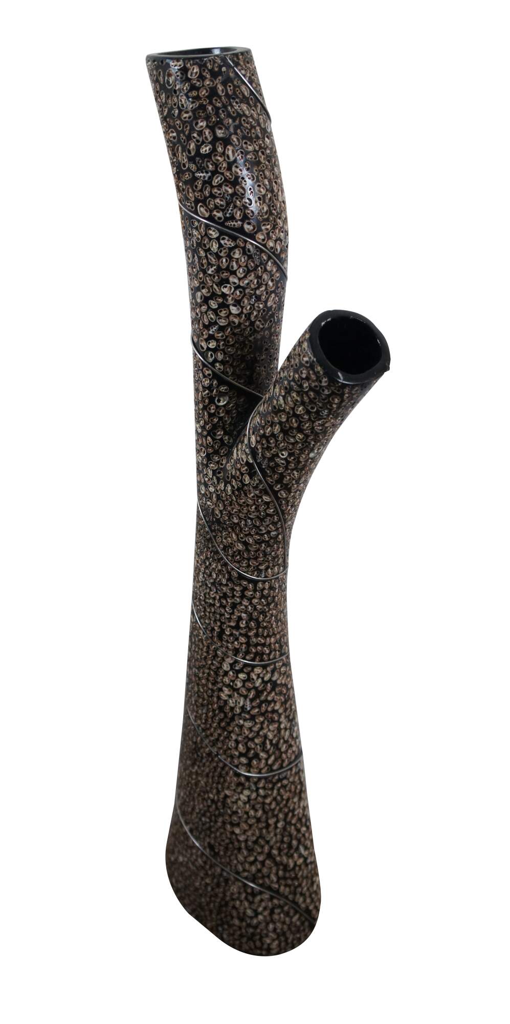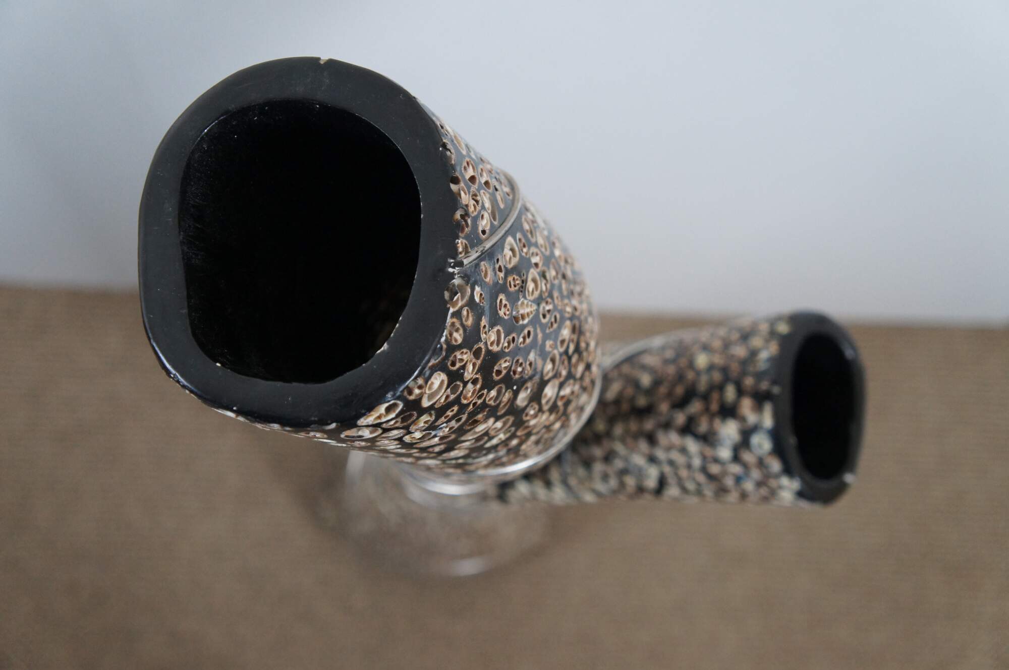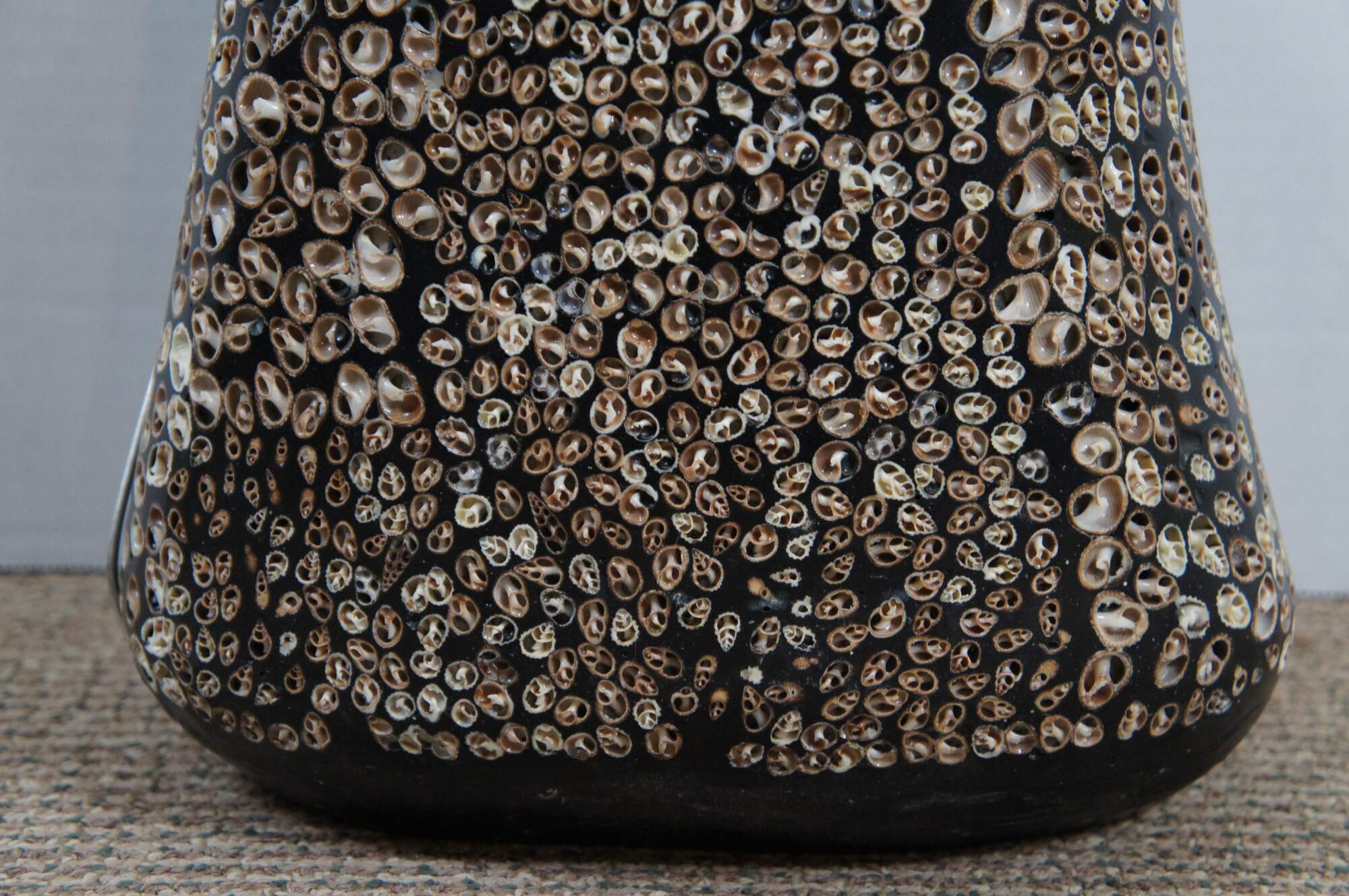 Vintage tree or giant coral shaped floor vase crafted of composite / resin finished in black lacquer, thoroughly embedded with small sea shells, their exteriors ground flush with the surface to reveal the chambers inside. Wrapped with a lightly embedded silver toned wire. Made in the Philippines.
