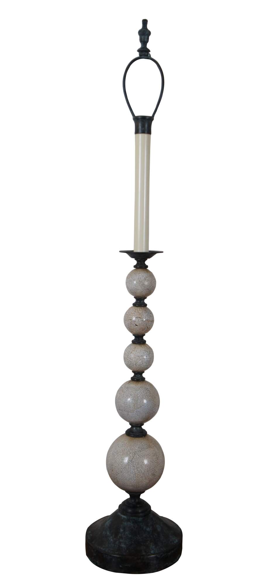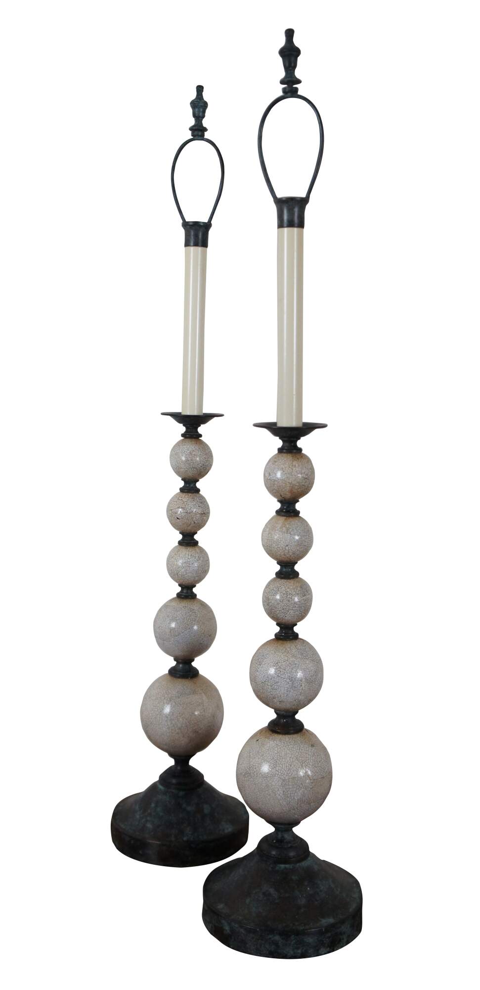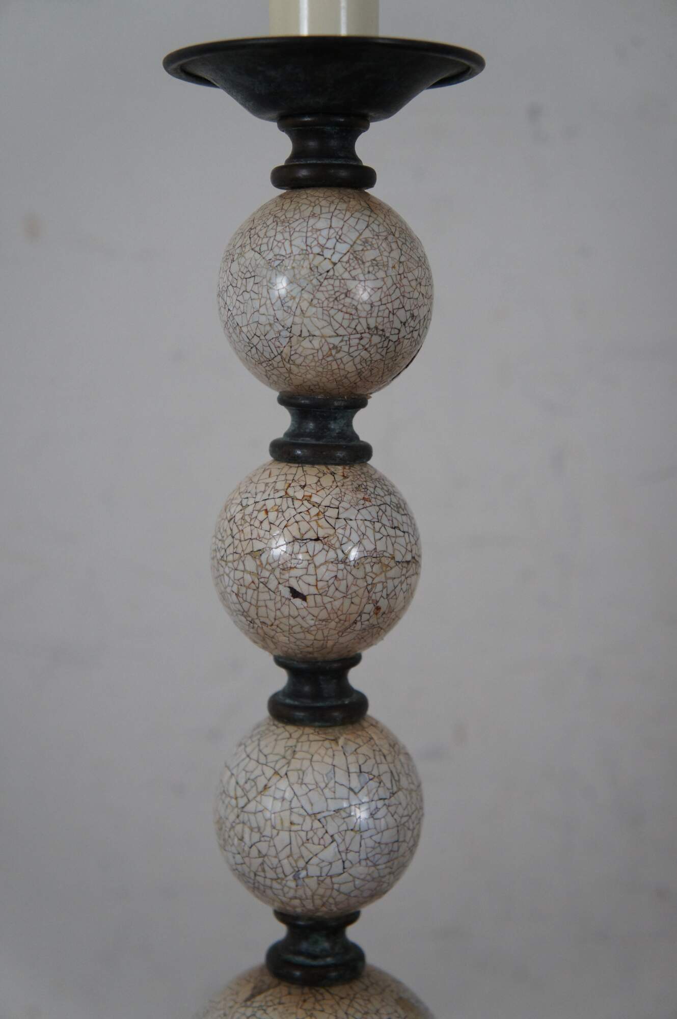 Pair of two Maitland Smith buffet / table lamps featuring round bronze bases and urn shaped finials with factory distressed patina / verdigris, with a series of five stacked white shell mosaic balls of graduated sizes supporting faux candlestick tops. Marked 168 on base. Hand Made in Vietnam.