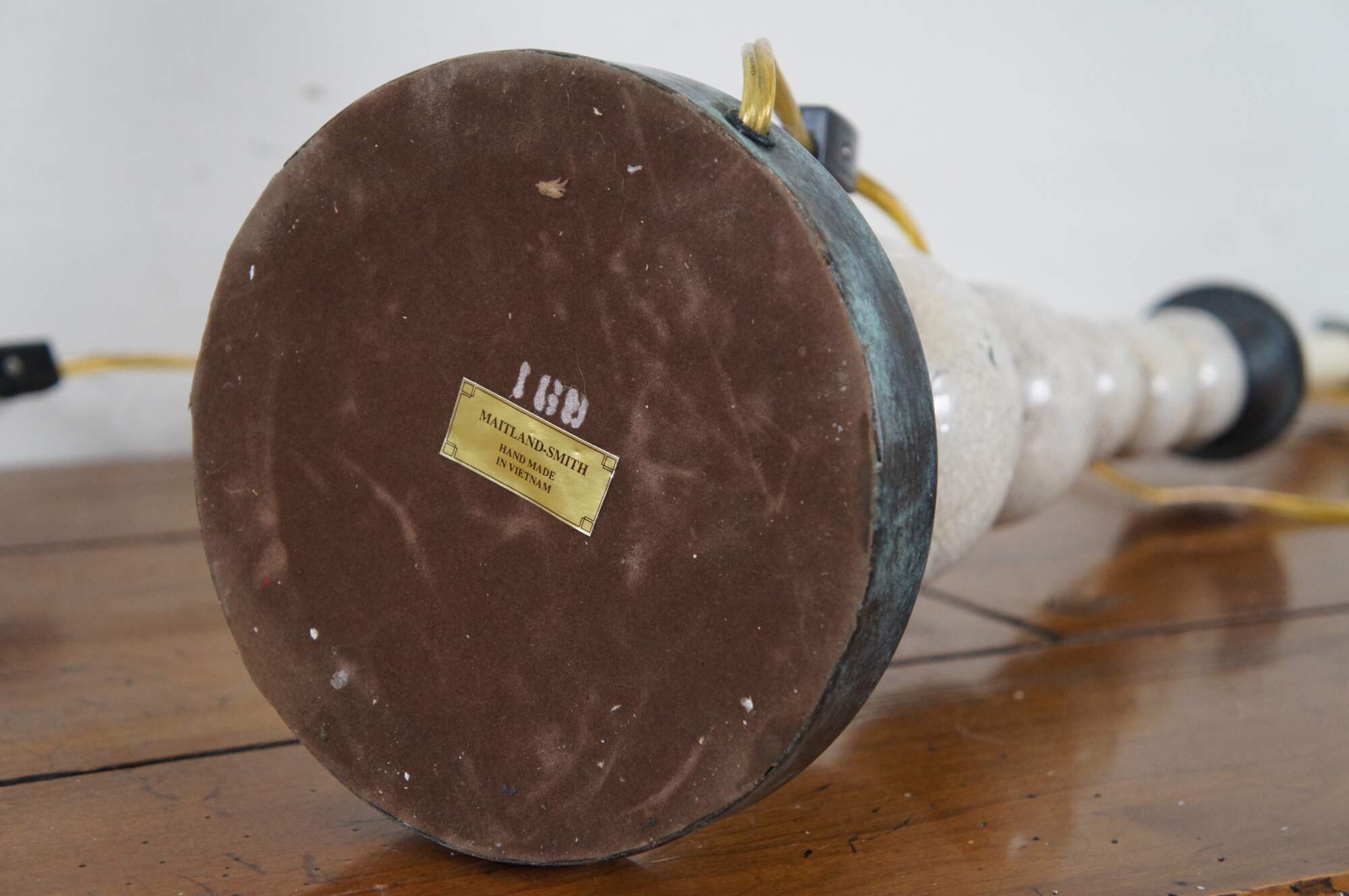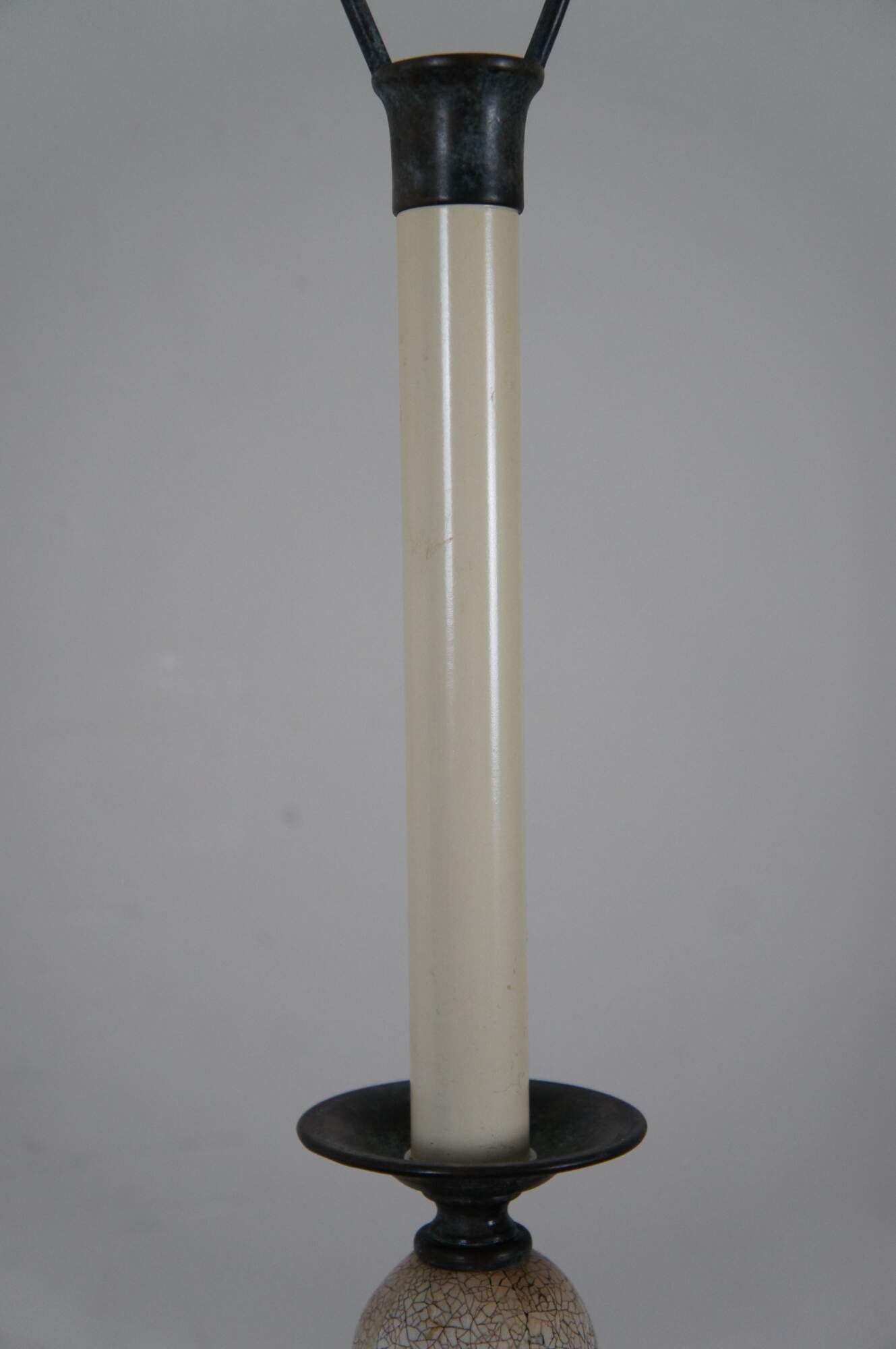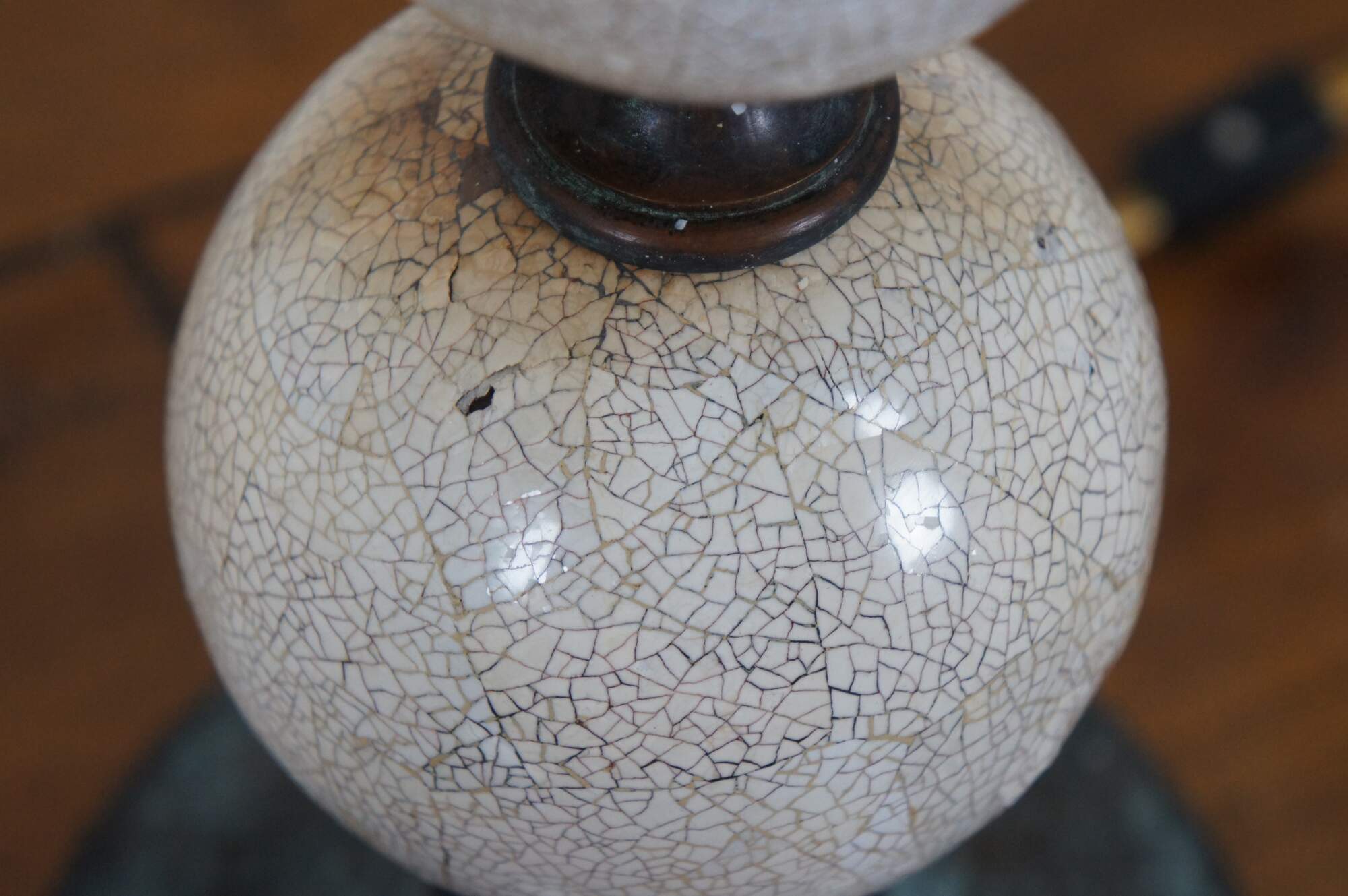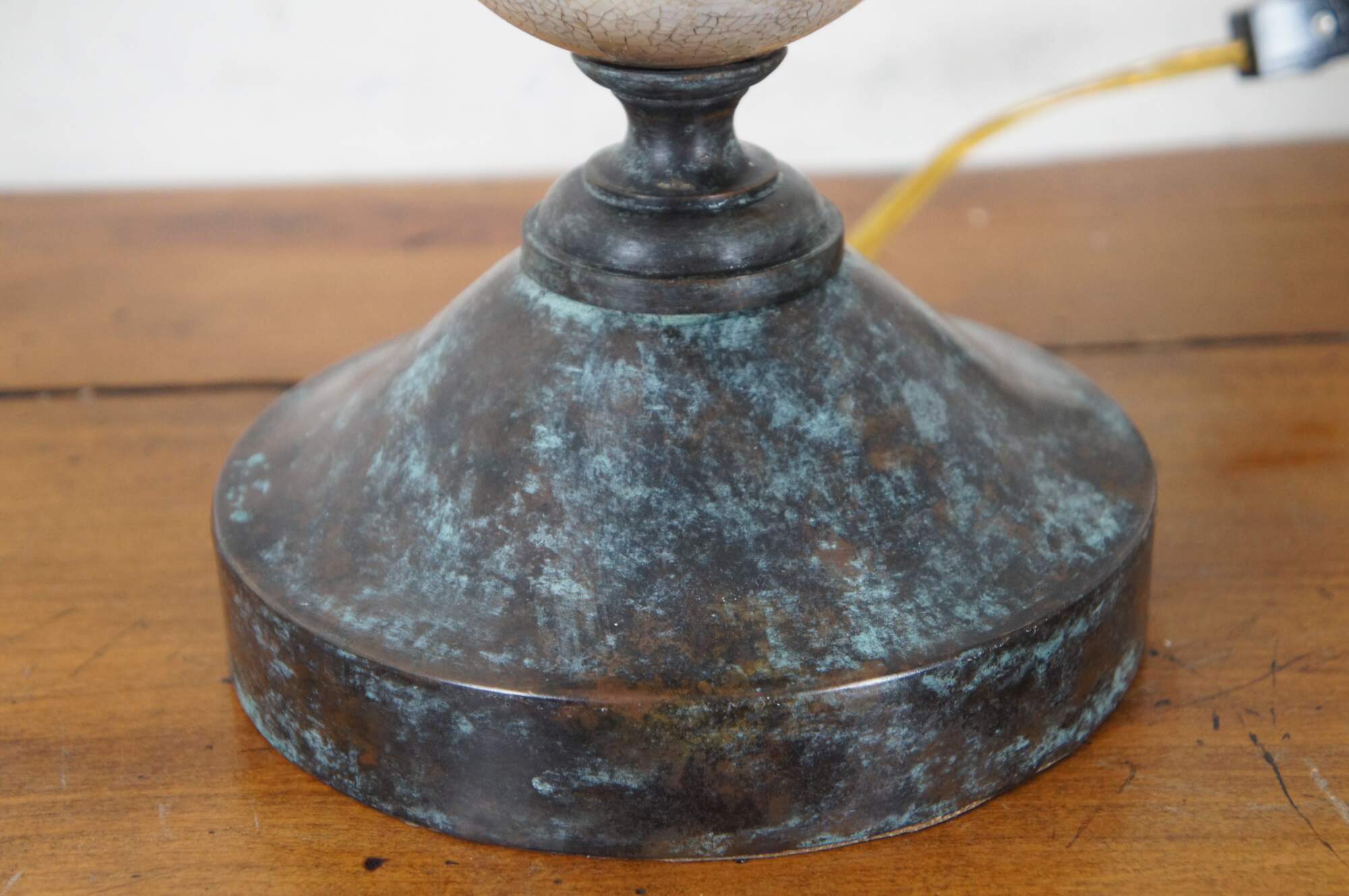 Pair of two Maitland Smith buffet / table lamps featuring round bronze bases and urn shaped finials with factory distressed patina / verdigris, with a series of five stacked white shell mosaic balls of graduated sizes supporting faux candlestick tops. Marked 168 on base. Hand Made in Vietnam.