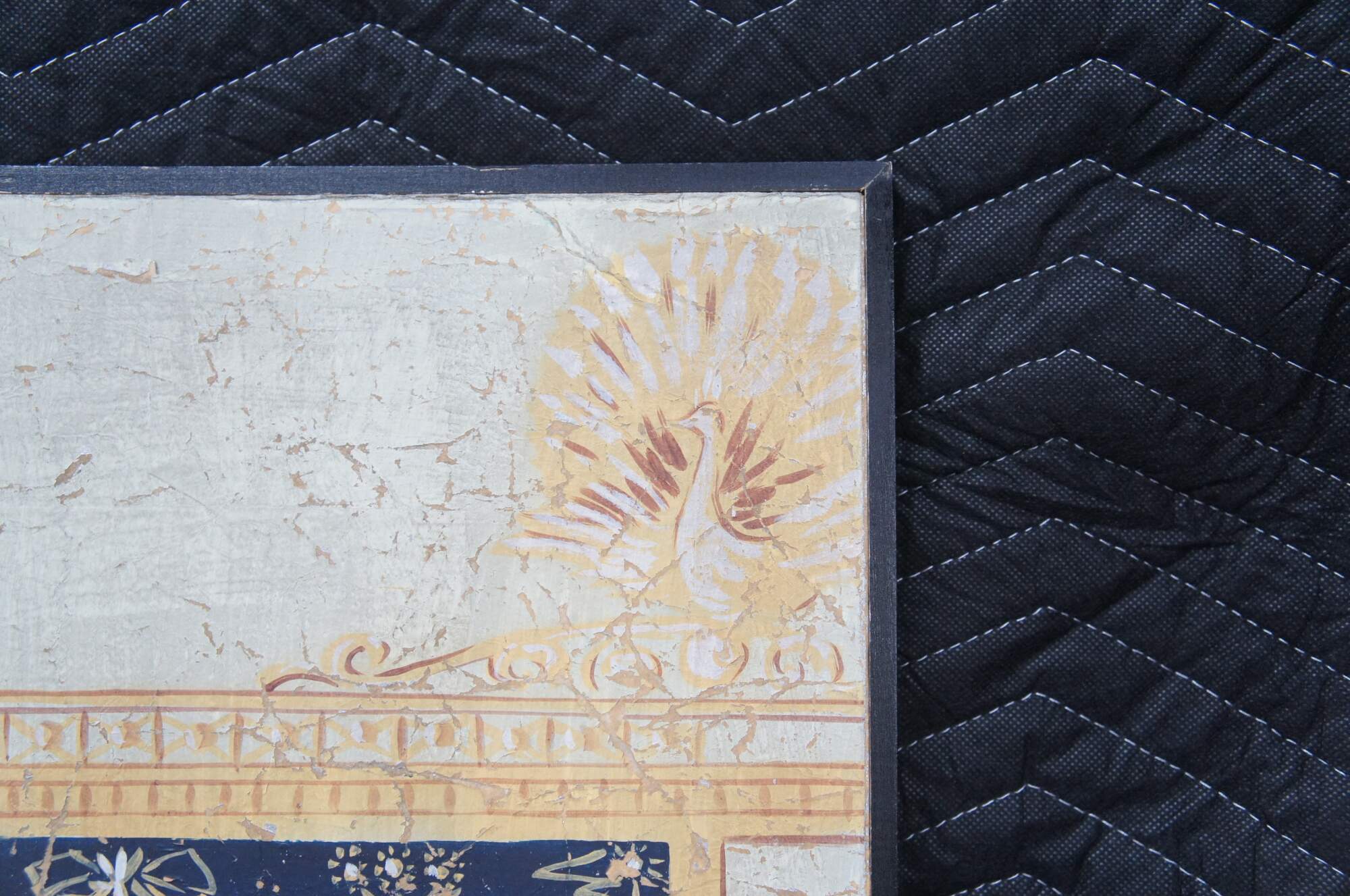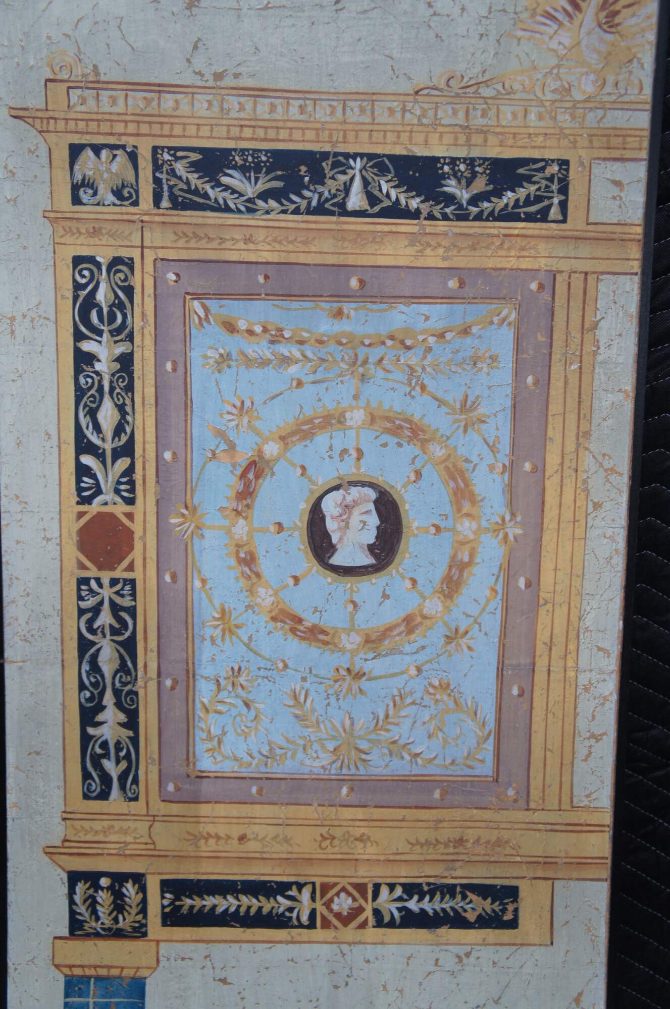 2 Wall hanging Neoclassical Archictural panels, circa last quarter 20th century. Depicting the interior walls of a temple or residence of royalty. Each is painted on board with a metal clip along the back for hanging display