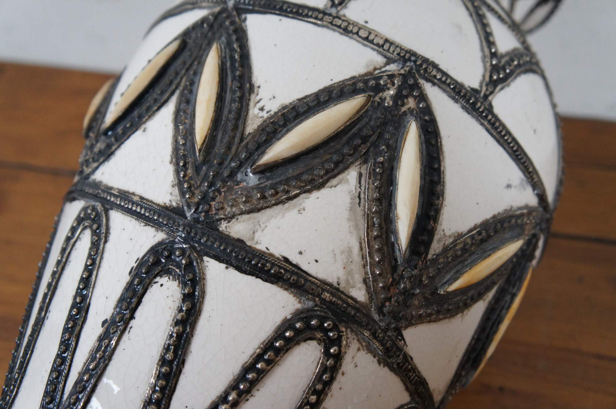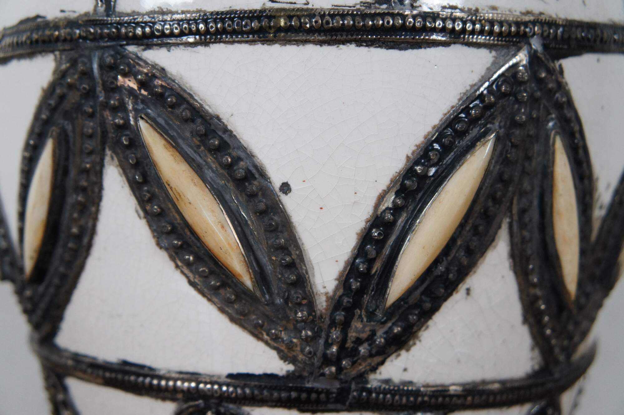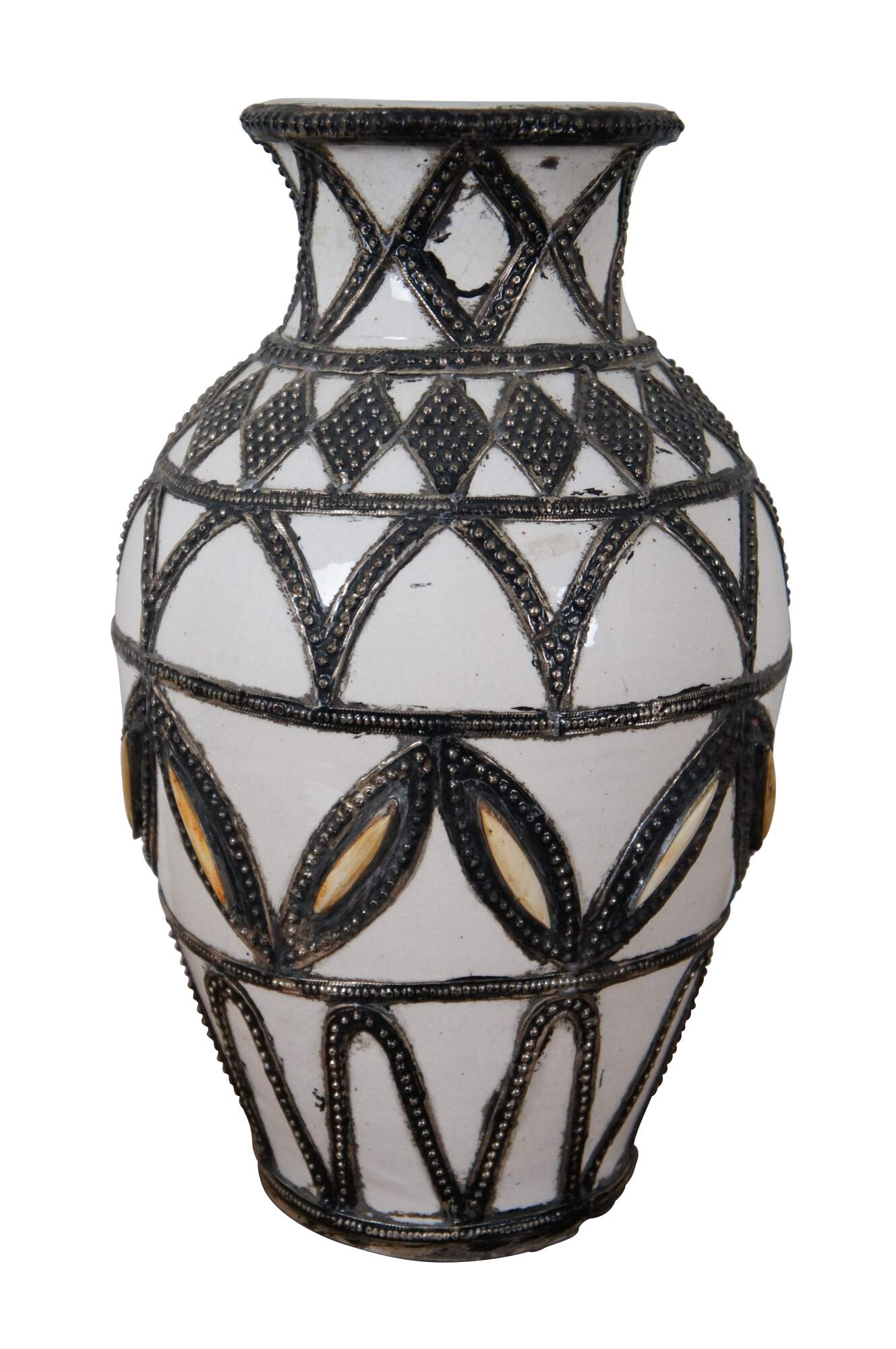 A large and impressive Moroccan ceramic vase, glazed in white with a variety of geometric inlaid studded nickel-silver designs.