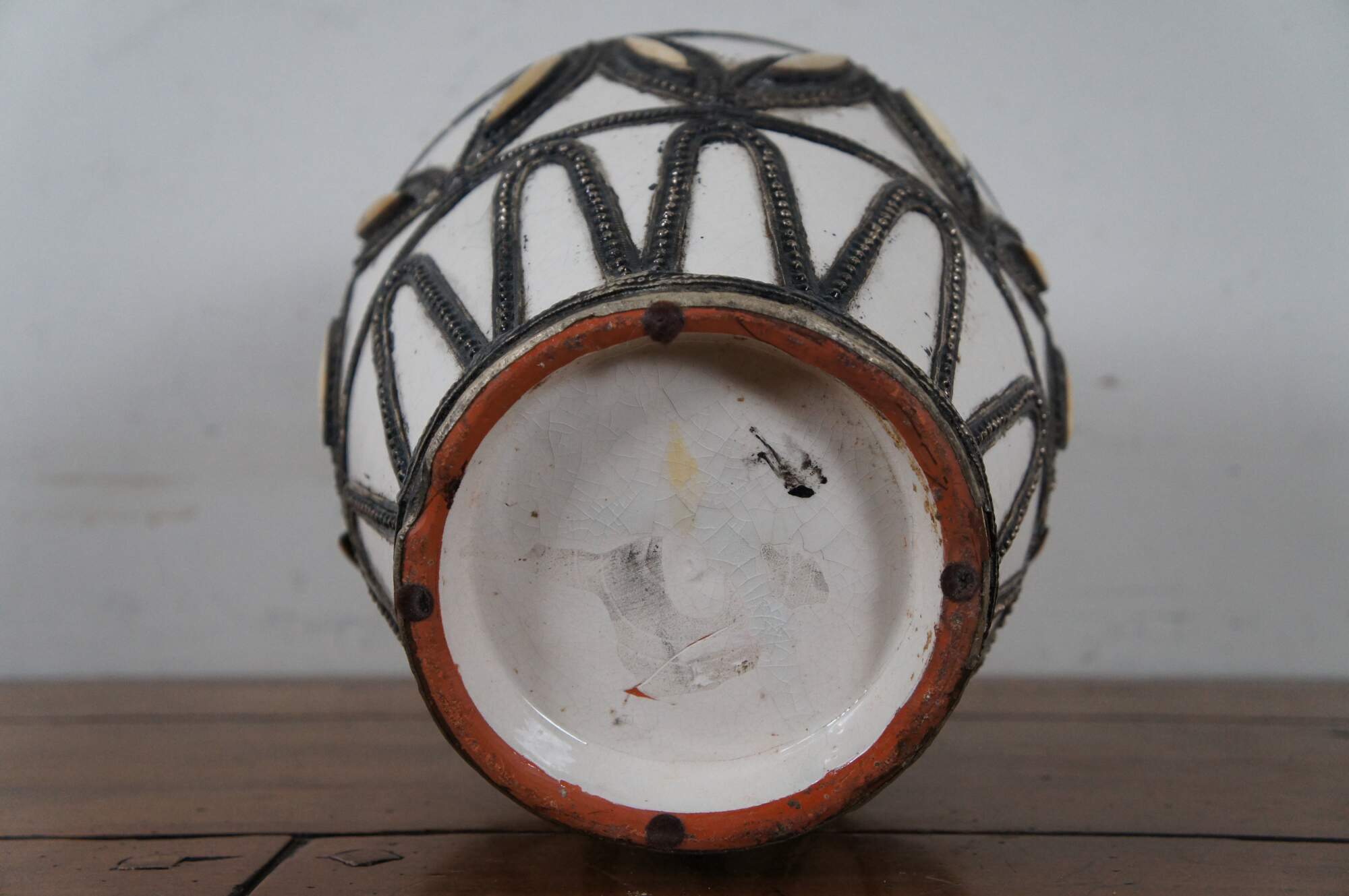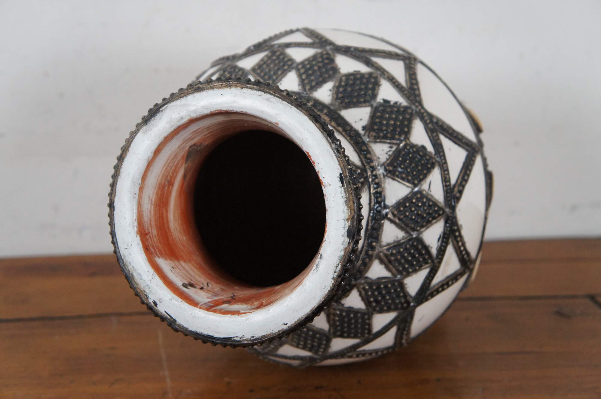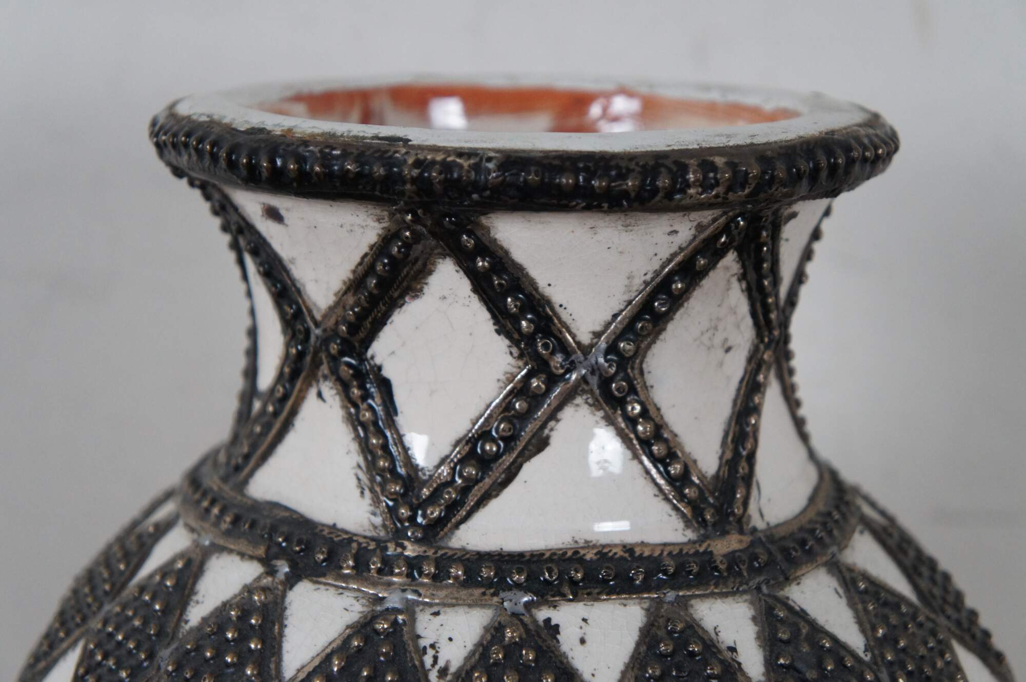 A large and impressive Moroccan ceramic vase, glazed in white with a variety of geometric inlaid studded nickel-silver designs.