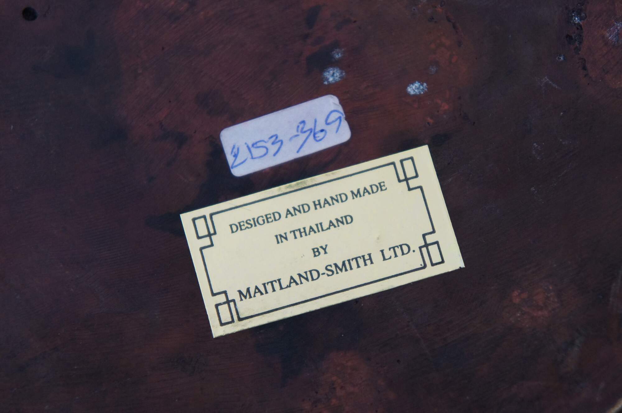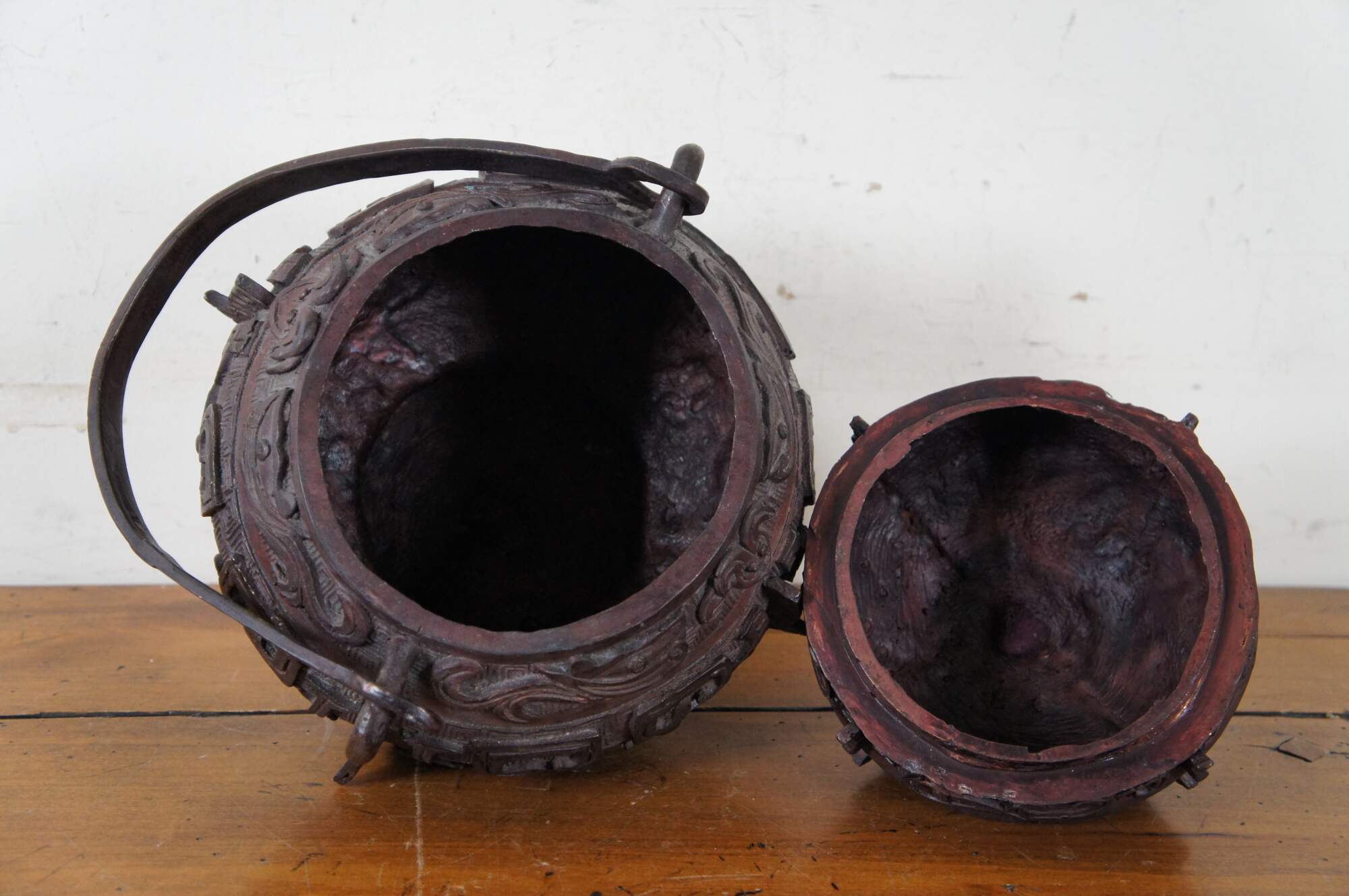 Rare Maitland Smith ancient Chinese style bronze cauldron with rotating bail handle and lid, with a reddish painted finish and semi-abstract dragon designs and faces. Hand written sticker on base marked 2153-369. Designed and hand made in Thailand.
