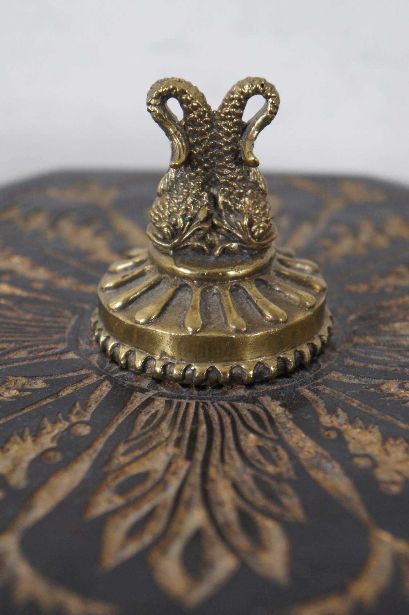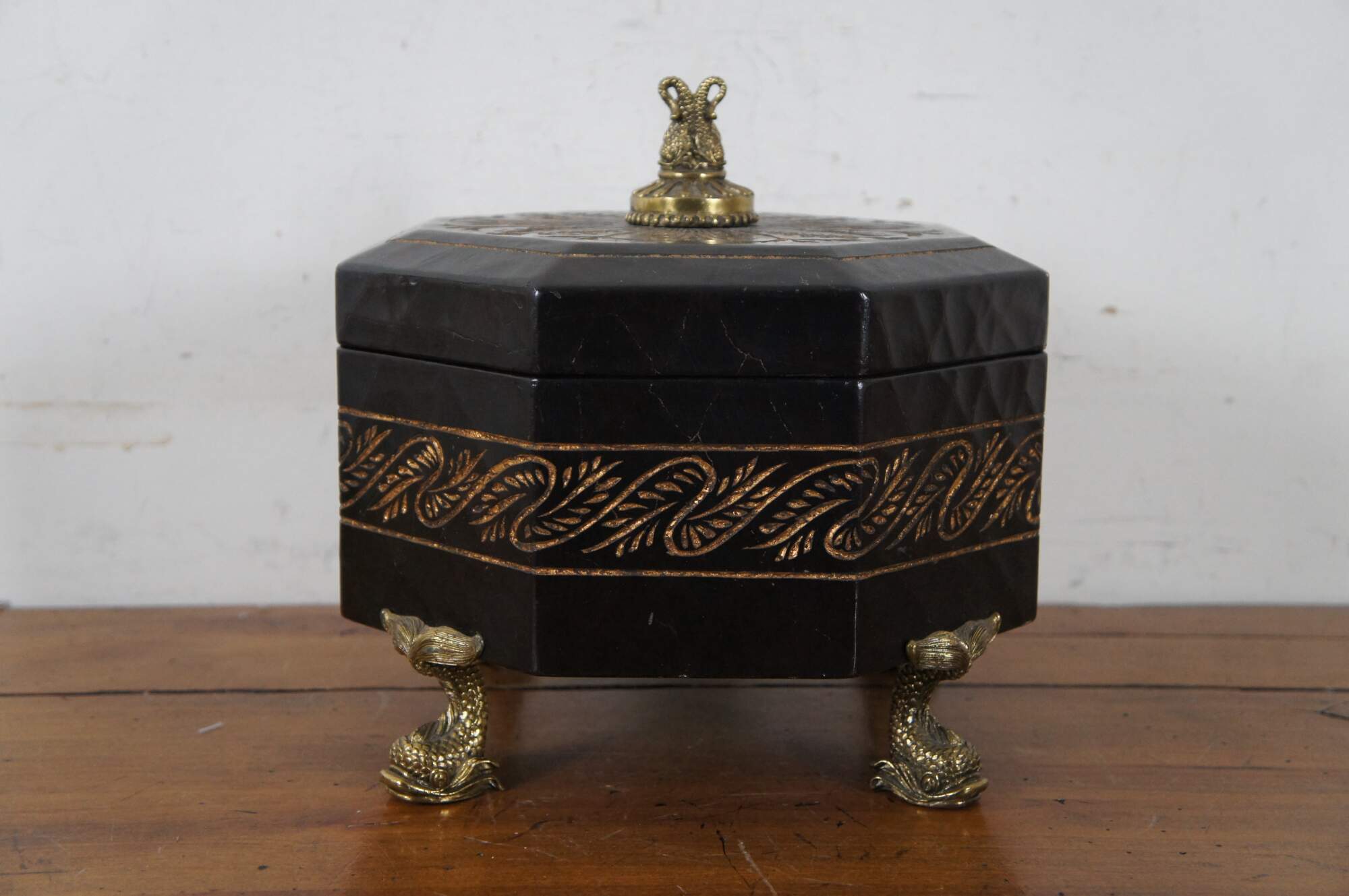 Vintage octagonal keepsake box, finished in black lacquer with engraved foliate designs painted with gold, supported by four gold / brass delphin / dolphin / fish shaped feet, and a matching double delphin finial on the lid.