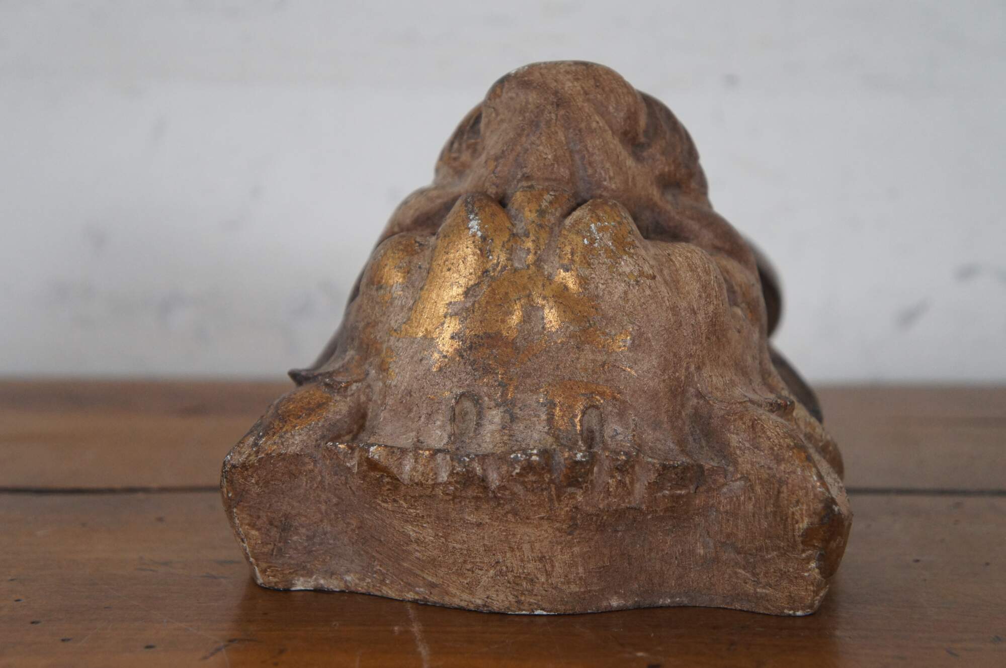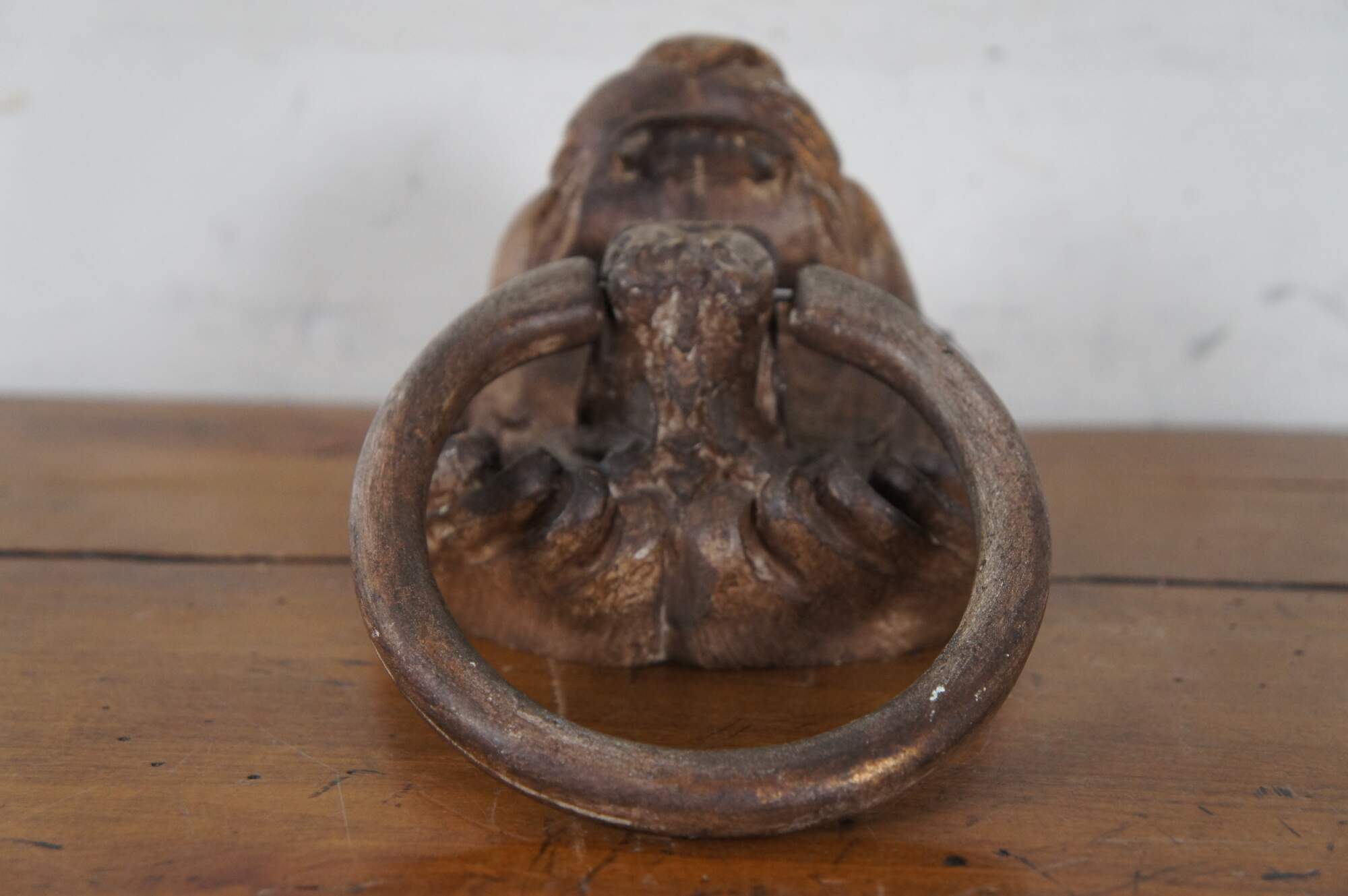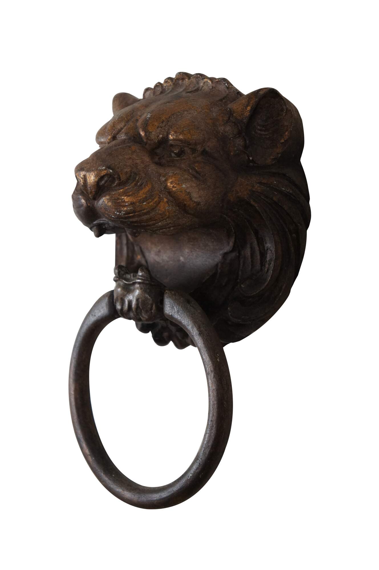 Vintage wall hanging plaque in the shape traditional door knocker showing a lion’s head with a ring in his mouth. Made of a composite resin and painted to resemble gilt bronze / iron.