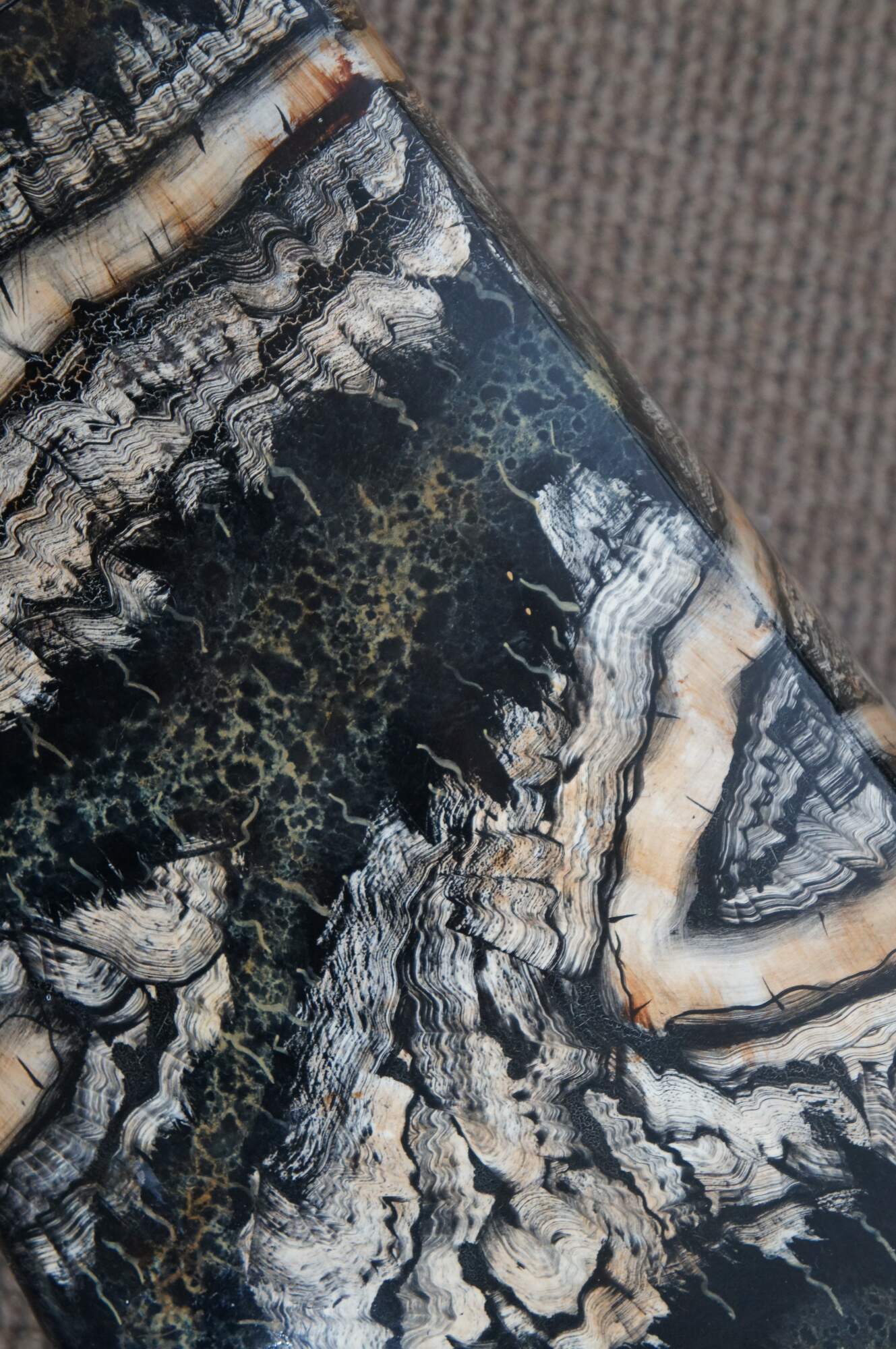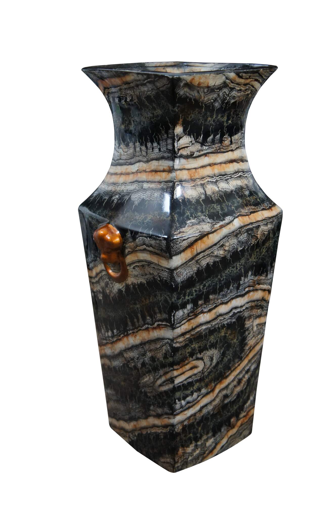 Late 20th century Maitland Smith floor vase featuring a traditional chinese famille form squared off vase shape and faux scallop shell knocker with ring handles, painted in copper. Made of porcelain / ceramic with a lacquered / enameled surface in black, cream and copper resembling marble. Marked on base with number 106. Hand written sticker marked 2185-888. Hand Made in the Philippines.