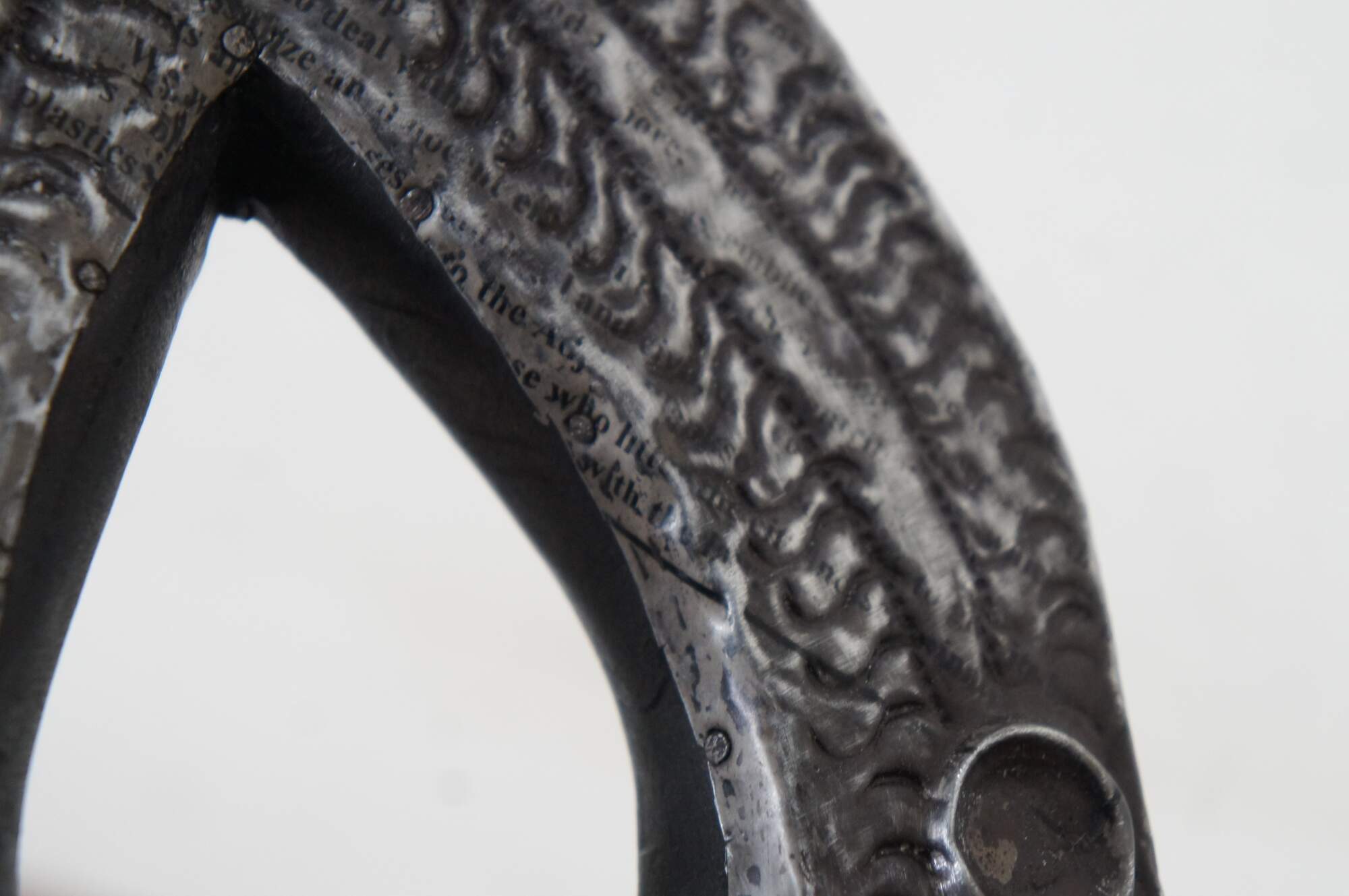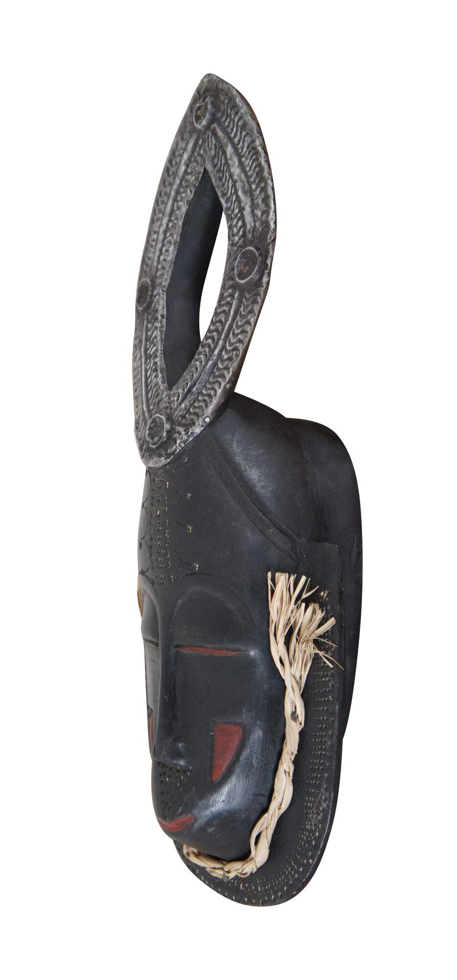 Late 20th century African tribal / folk art hand carved dark wood mask, featuring a gently smiling painted face with U-shaped beard trimmed with braided raffia and an open almond shaped headpiece overlaid with a hammered / embossed metal sheet. Line of text like newspaper print are partially visible on the metal. Leather strap for wall display on reverse.