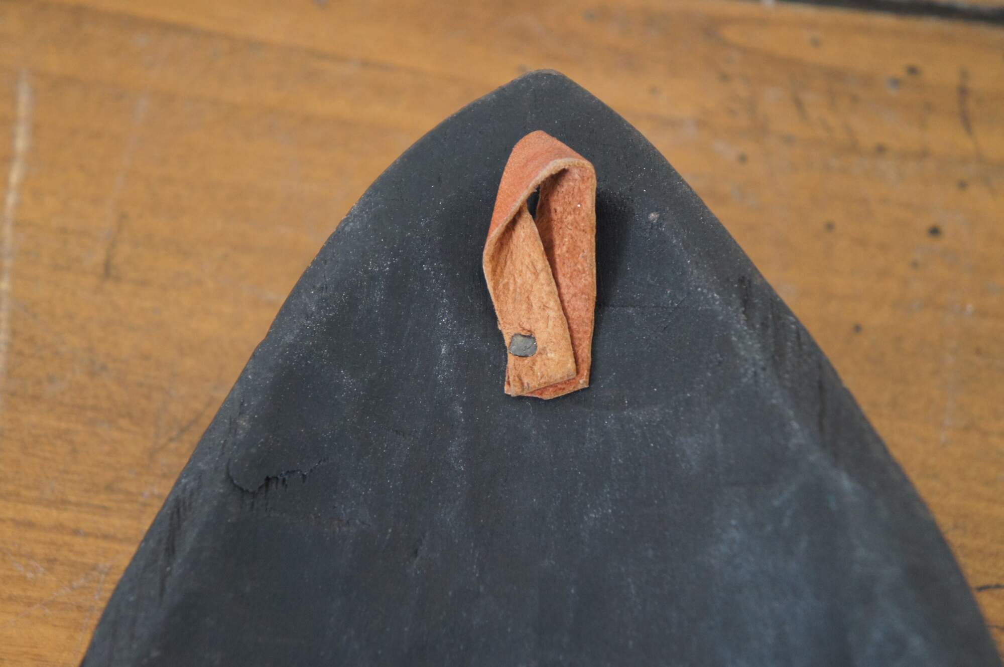 Late 20th century West African Akan tribal / folk art carved dark wood mask featuring an almond shaped face with open mouth, triangular nose, round disc shaped eyes and decorated with hammered / embossed sheets of silvery / copper metal. Leather strap for wall display on reverse.