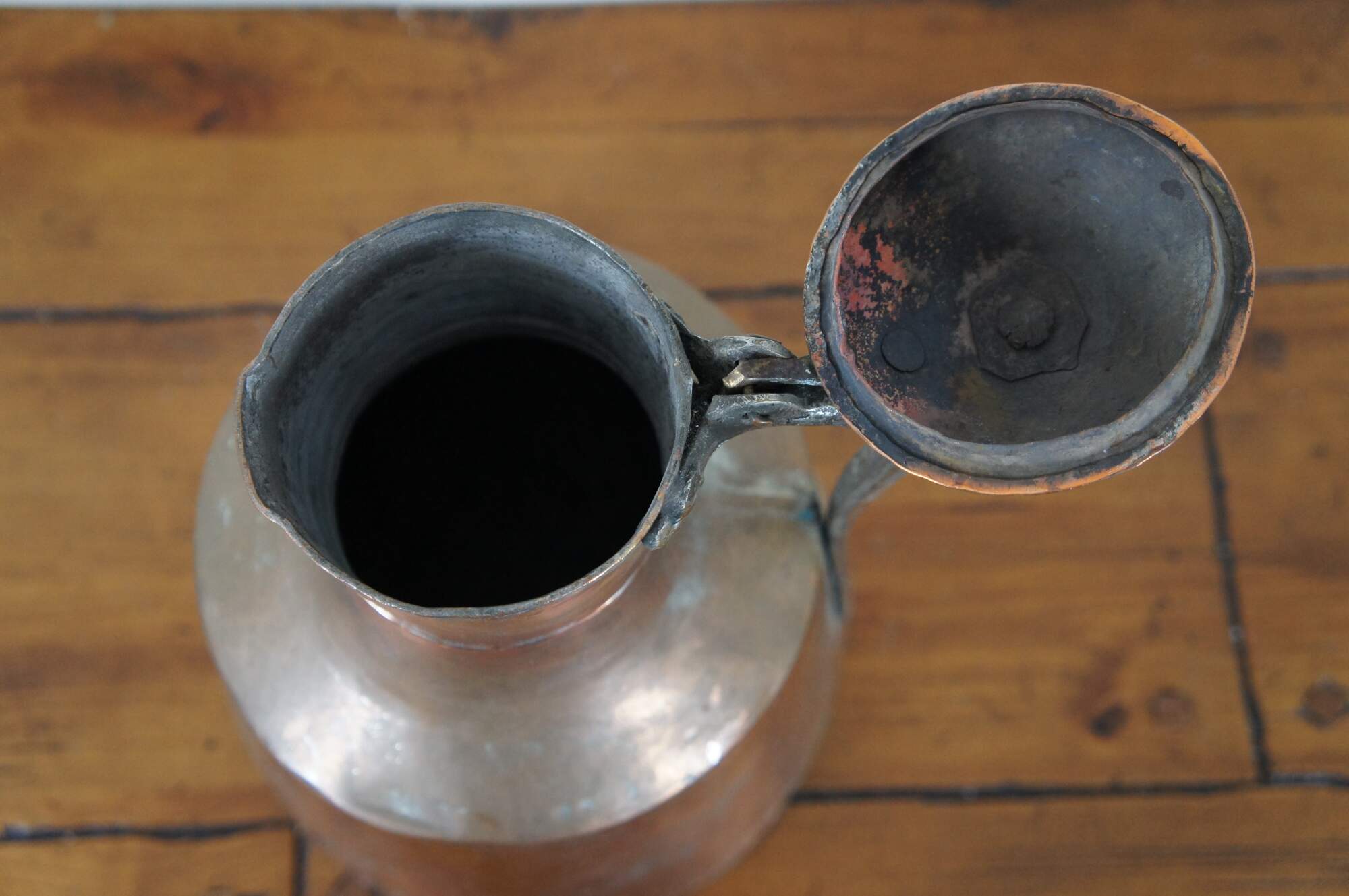 19th century Turkish dovetailed copper jug / pitcher / ewer with curved handle, bell / acorn shaped brass finial and hinged lid.