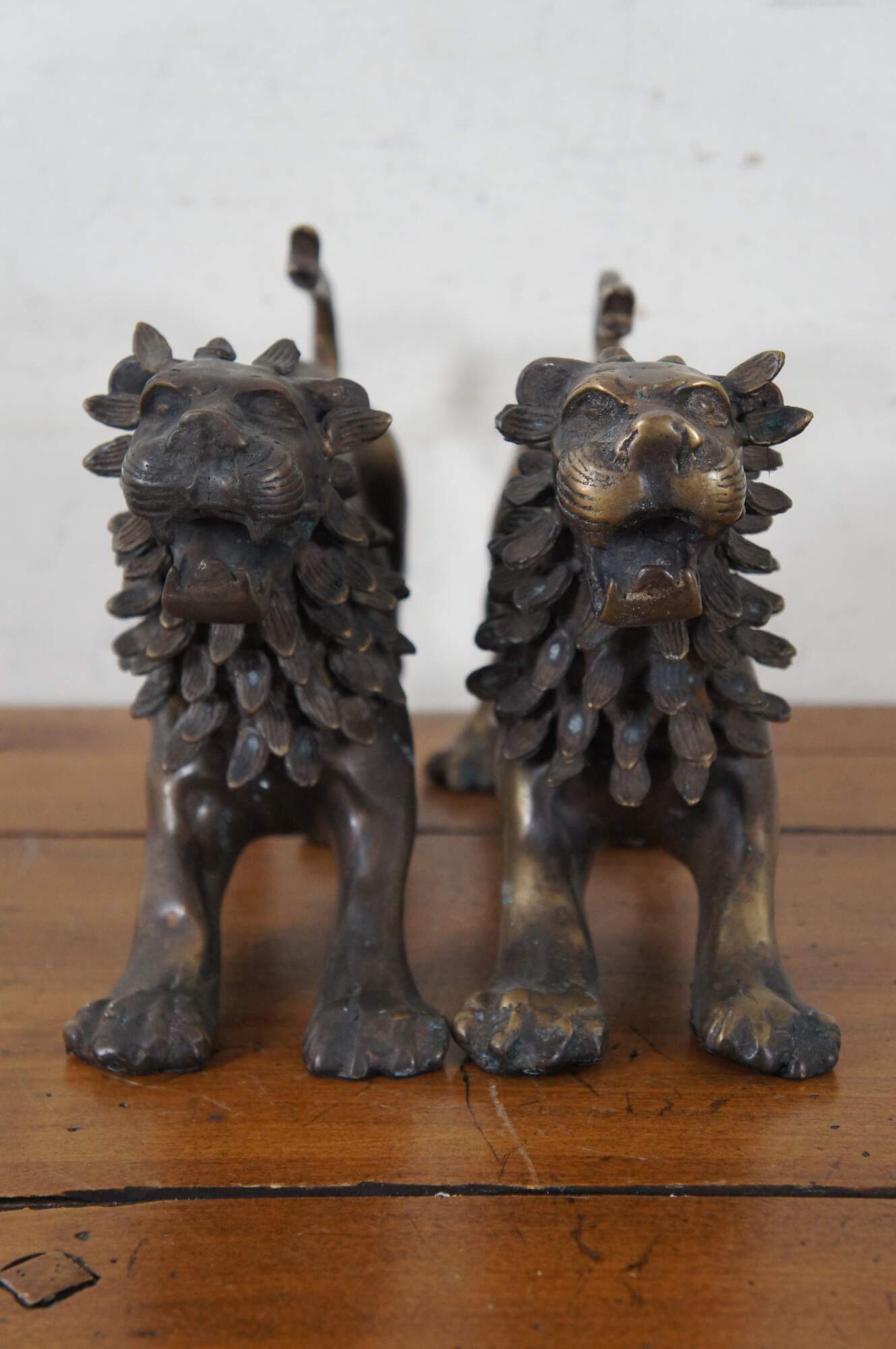Pair of bronze mythological guardian lion / fu / foo dog figurines with pine cone like manes and snakes for tails. The style and stance are nearly identical to the Chimera of Arezzo – an ancient Etruscan sculpture – however these figures are missing the original goat’s head emerging from the lion’s side.
