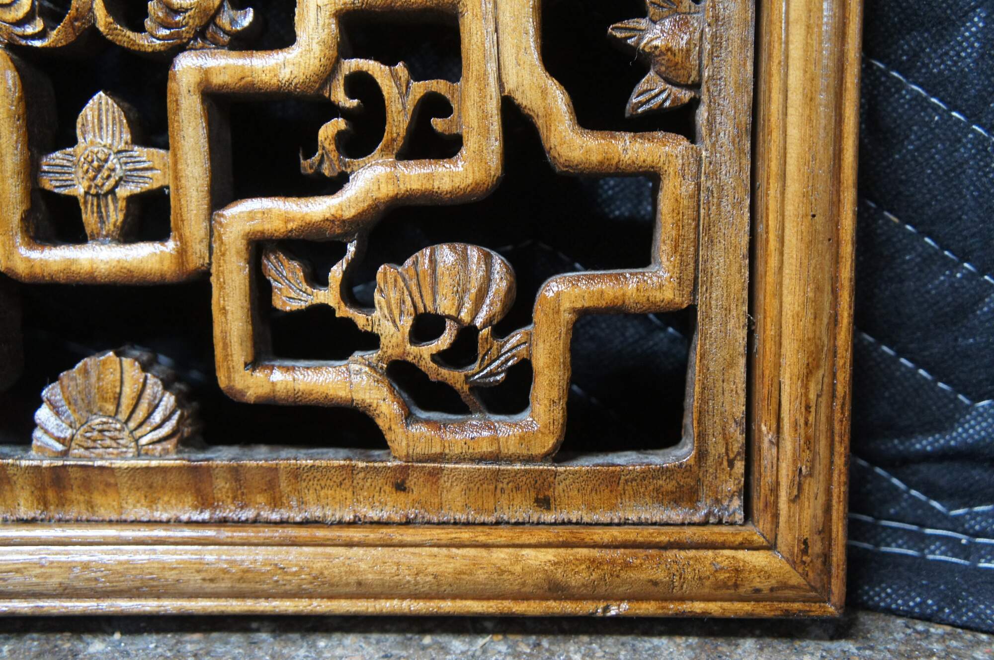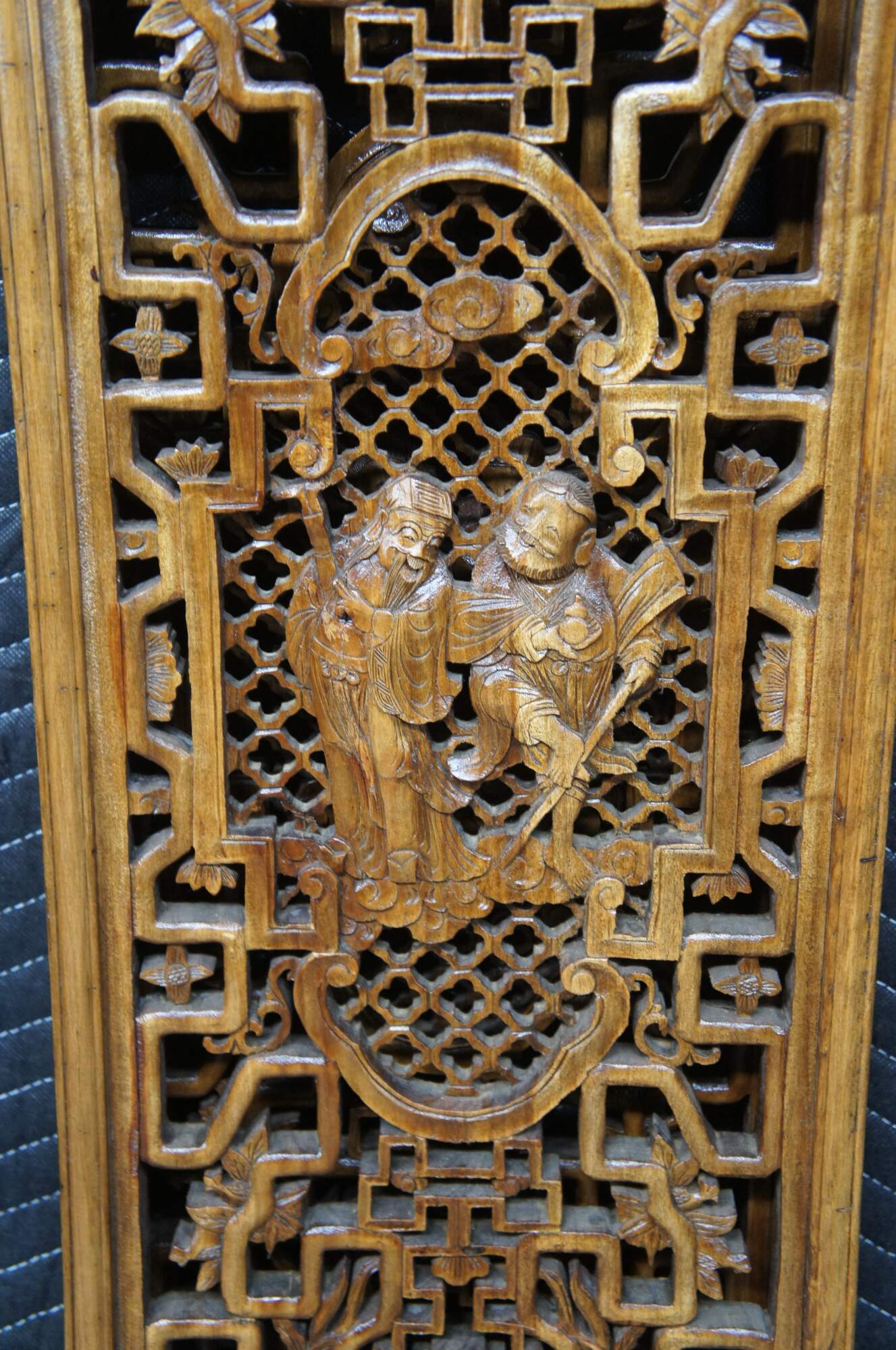 4 Vintage Chinese hardwood Qing Dynasty inspired carved panels. Features a pierced and scrolled detail with foliate, Chinese Greek key and immortal figures with lattice backing. Hangs via brass handle along the top.