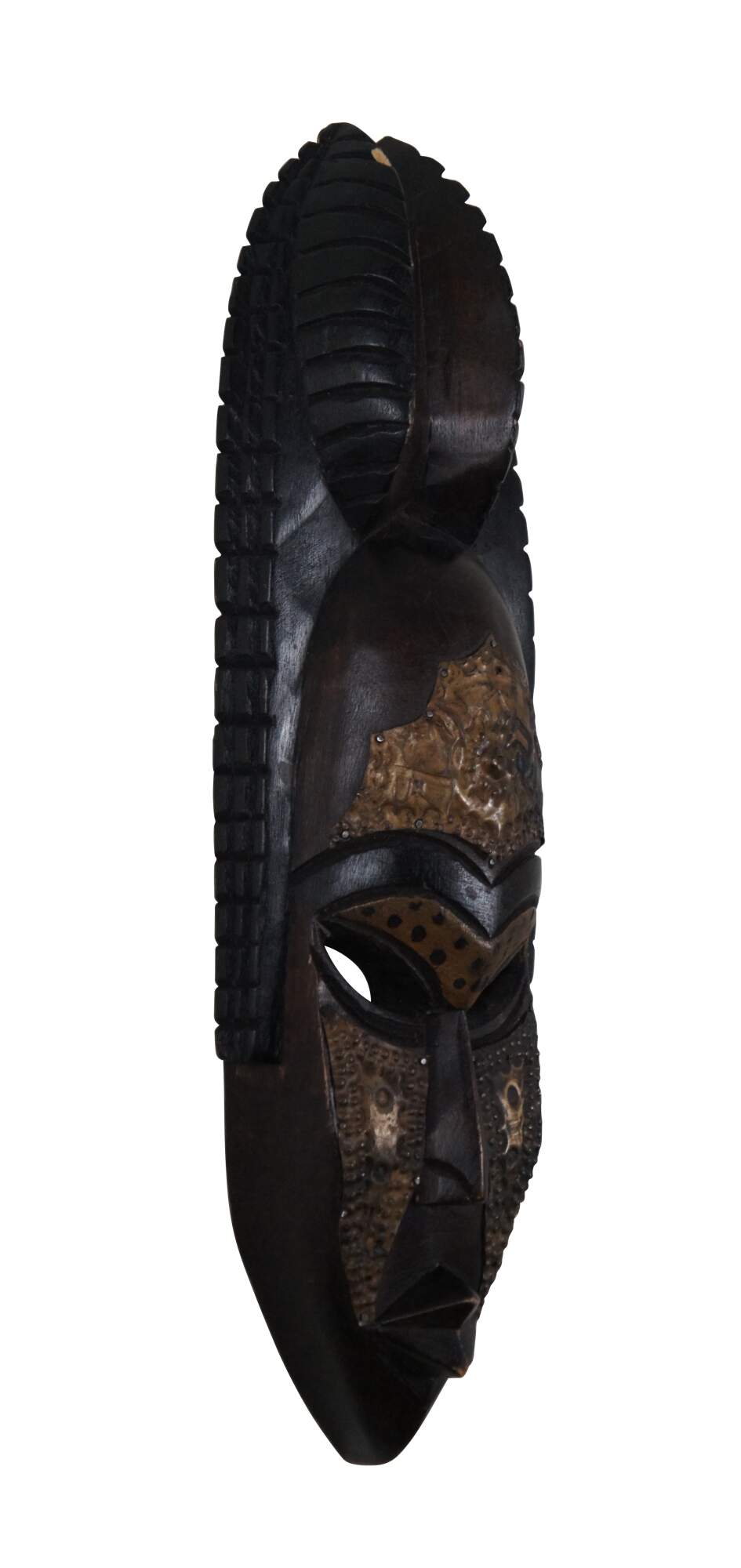 Vintage Ghana African hand carved tribal mask featuring an elongated slender warrior face with hammered copper accents and leather hanging strap.